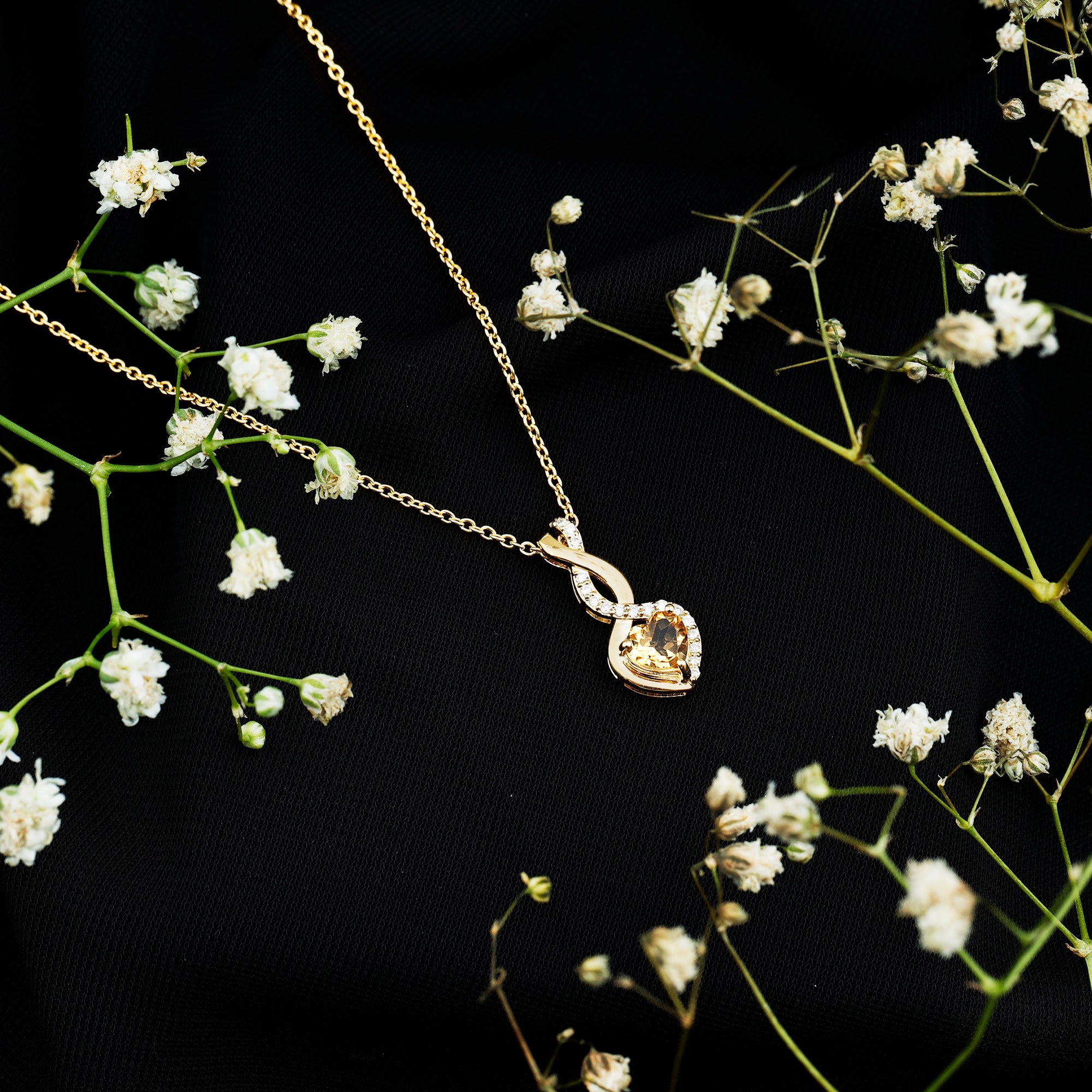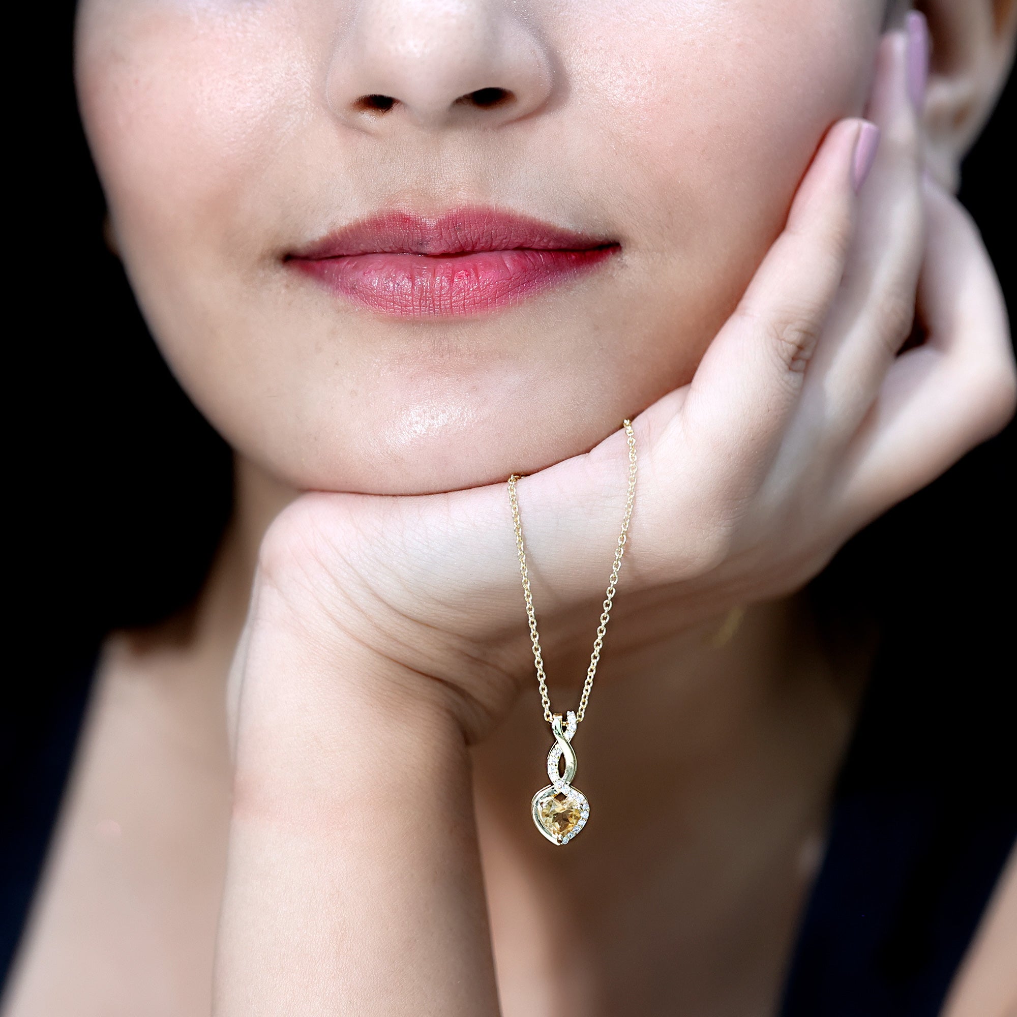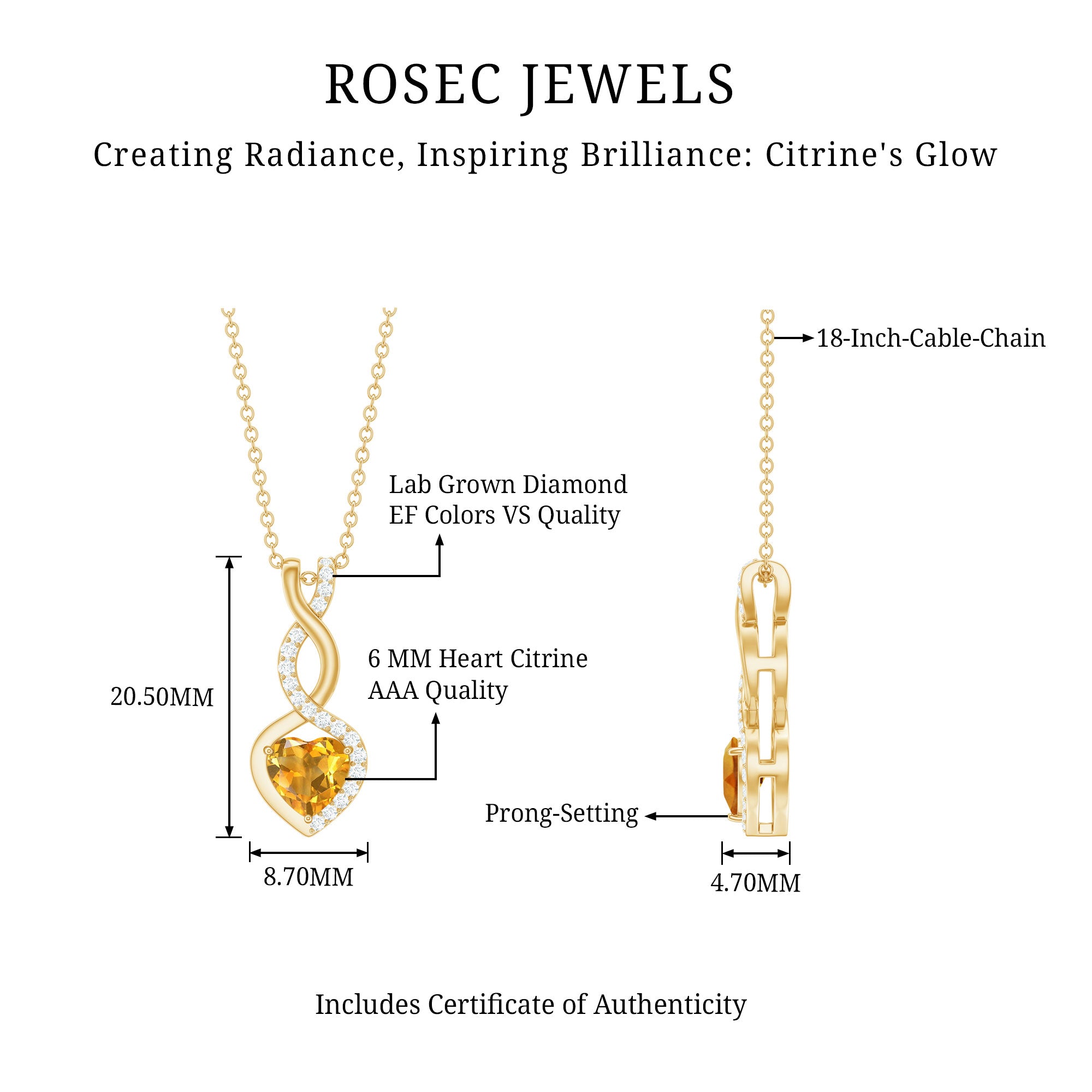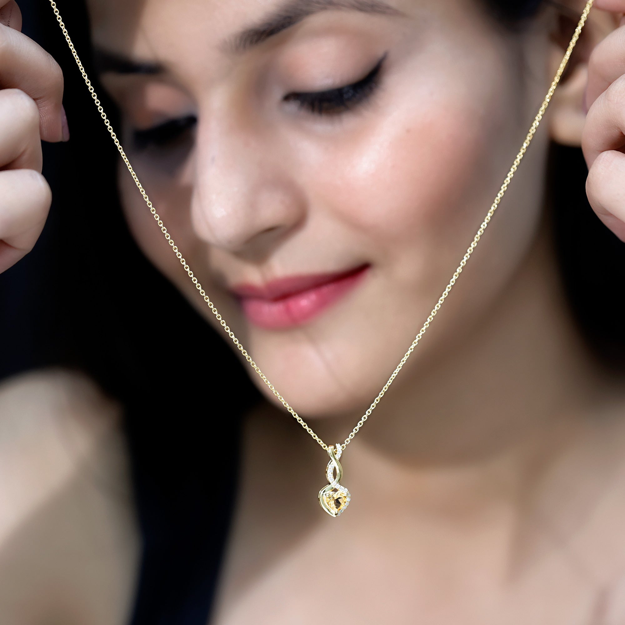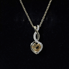 A symbol of love that lasts forever, this Heart and Infinity Necklace beautifully conveys feelings that words cannot express. Curated in 14k yellow gold plated silver, this Yellow Gem Necklace is made to honor significant moments and lasting connections. At the heart of the pendant is a 6 MM heart shaped Citrine, carefully set in prongs. The heart is surrounded by an elegant infinity symbol, which adds more depth to the design. Together, the heart and infinity shape signify an eternal bond, making this Citrine Heart Necklace a meaningful gift for someone special. To enhance its sparkle, the Citrine Pendant features shining round lab grown diamonds. The pendant hangs gracefully from a matching chain, allowing it to rest perfectly on your neckline, making it suitable for daily wear or special events. The Heart Pendant Necklace includes a gemstone certificate and comes in a signature jewelry box, making it perfect for gifting or as a cherished keepsake. Simple, sweet, and filled with love, this Citrine and Diamond Necklace is a lovely way to carry a special connection with you wherever you go.