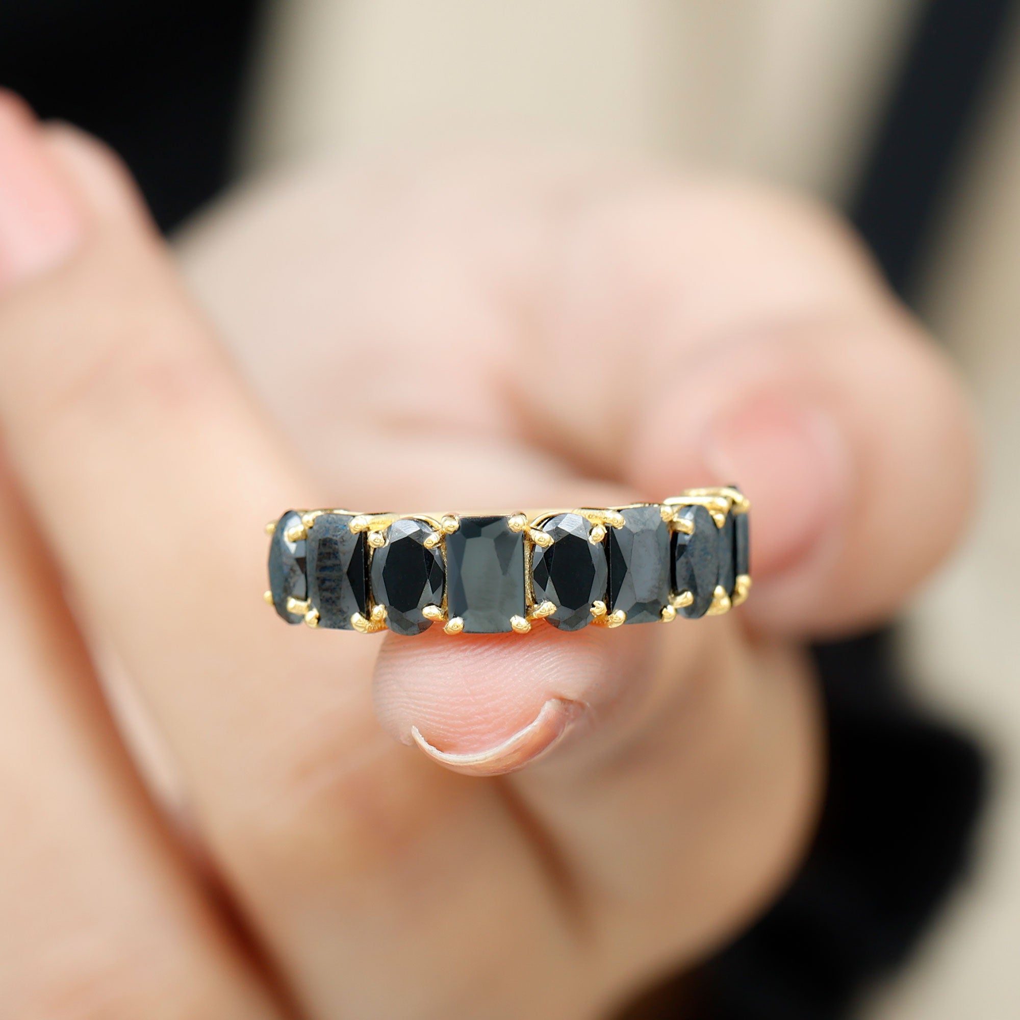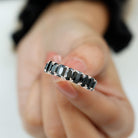 Designed to stand out with quiet strength and beauty, this Black Onyx Eternity Ring pairs elegance with deeper meaning. Featuring alternating 4X6 MM oval and emerald cut black onyx stones, each gem is carefully secured in prong setting, creating a graceful rhythm across half of the band. The unique combination of cuts brings movement to the design, while the deep black onyx adds mystery and charm. Known for its protective qualities, black onyx is believed to absorb negative energy and promote inner strength, making this Half Eternity Band not just beautiful, but also meaningful. Whether you are drawn to its striking appearance or the symbolism behind the stones, this Onyx Wedding Band brings something special to your everyday style. It is perfect for stacking or wearing solo, offering a look that is both timeless and modern. Thoughtfully crafted for comfort and durability, it makes a wonderful gift for someone who appreciates distinctive jewelry with intention. Available in multiple sizes and metal finishes, it is easy to choose one to fits your personal taste. From casual outings to special occasions, this Wedding Anniversary Ring brings a quiet elegance that lasts.