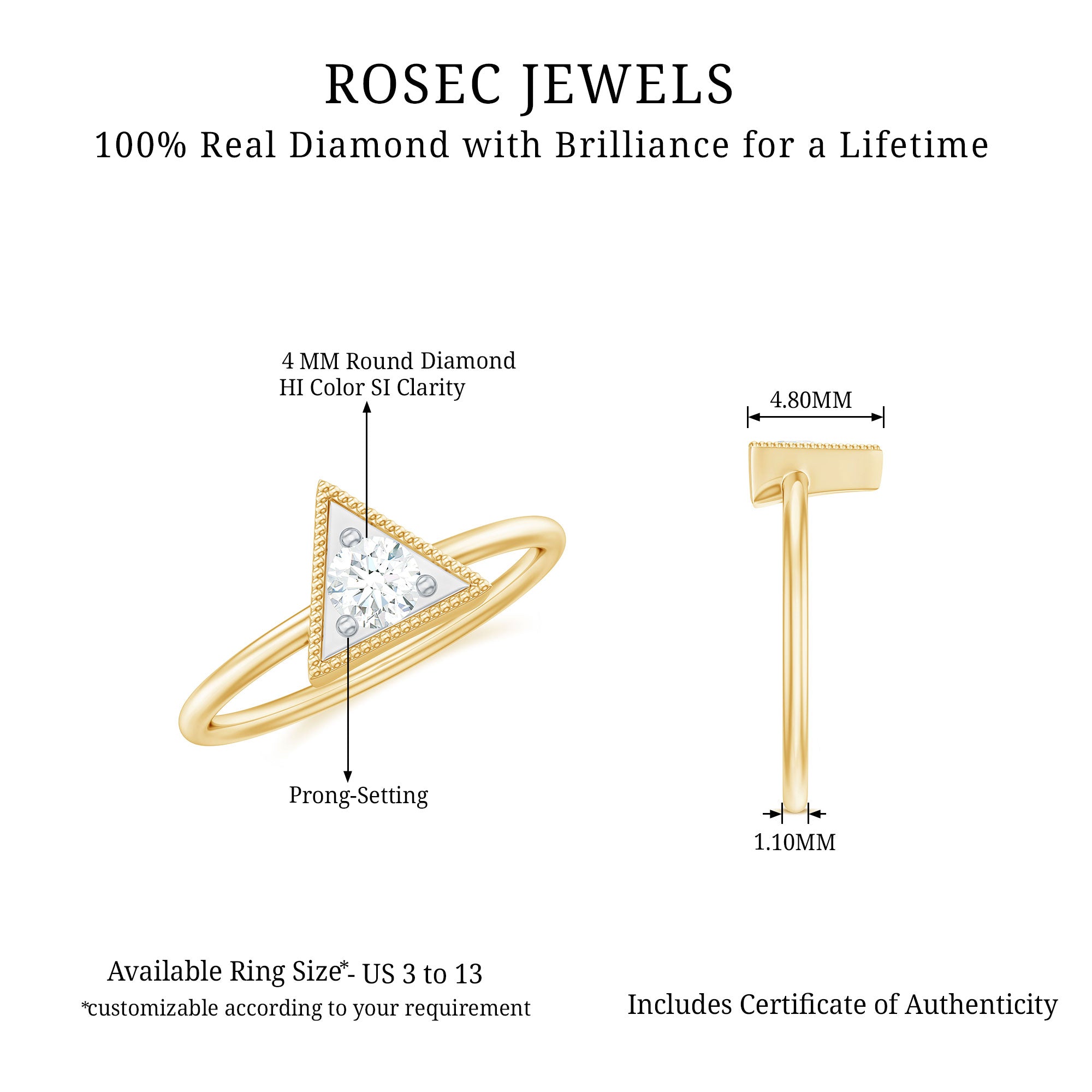 Our Promise Ring, delicately designed with a Round Cut Diamond at its center, is nestled within a distinctive triangular frame, held securely in place by a surface prong setting. The addition of Beaded Detailing only adds to its charm and allure. This Triangle Diamond Ring, crafted with Solid Gold, is sure to elevate your style and garner endless compliments throughout your day.