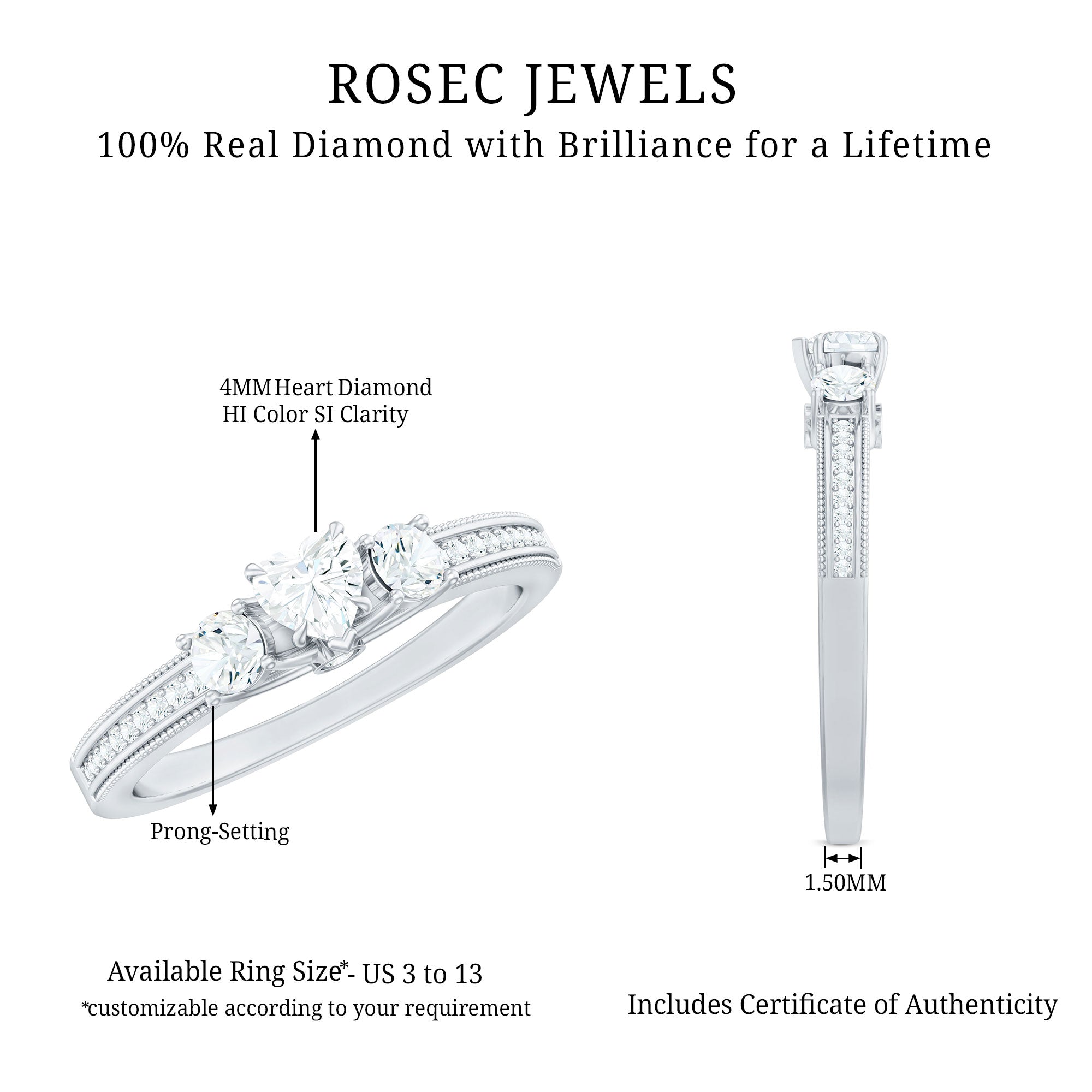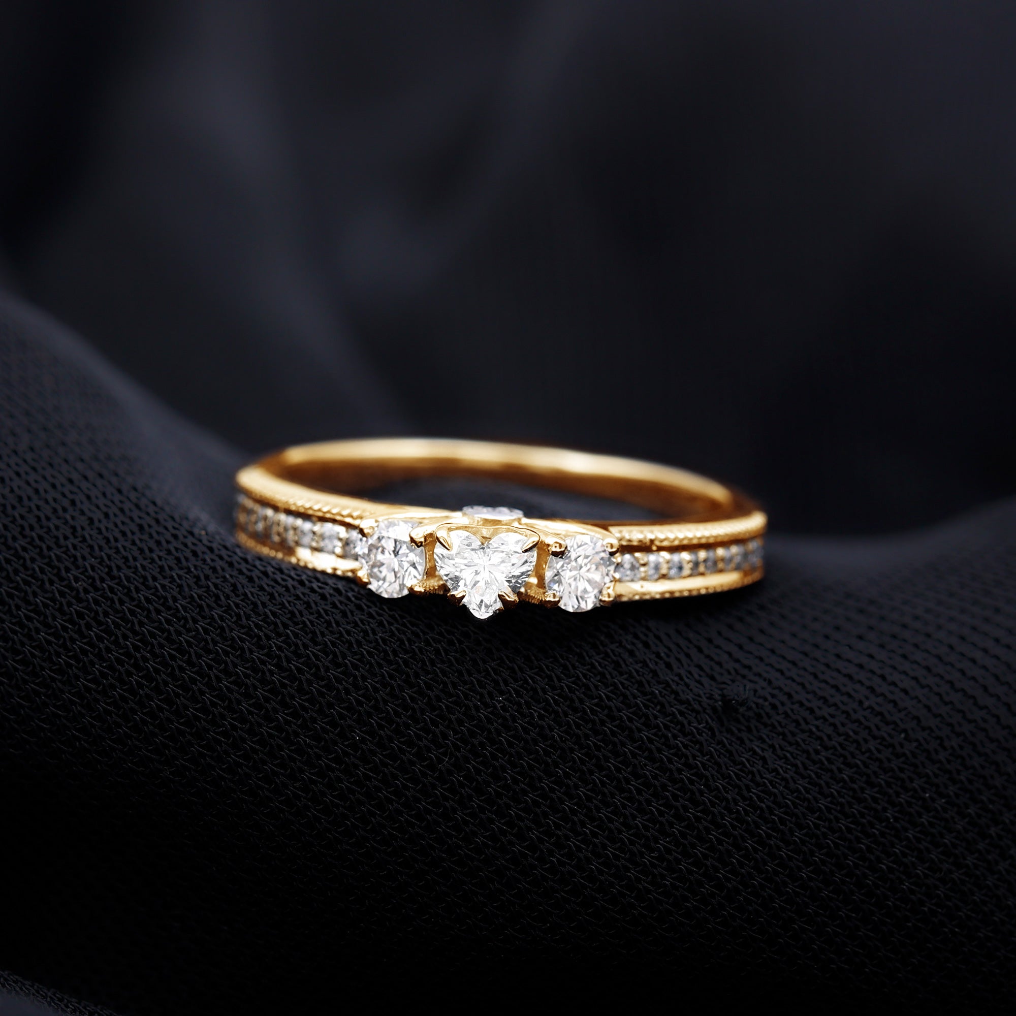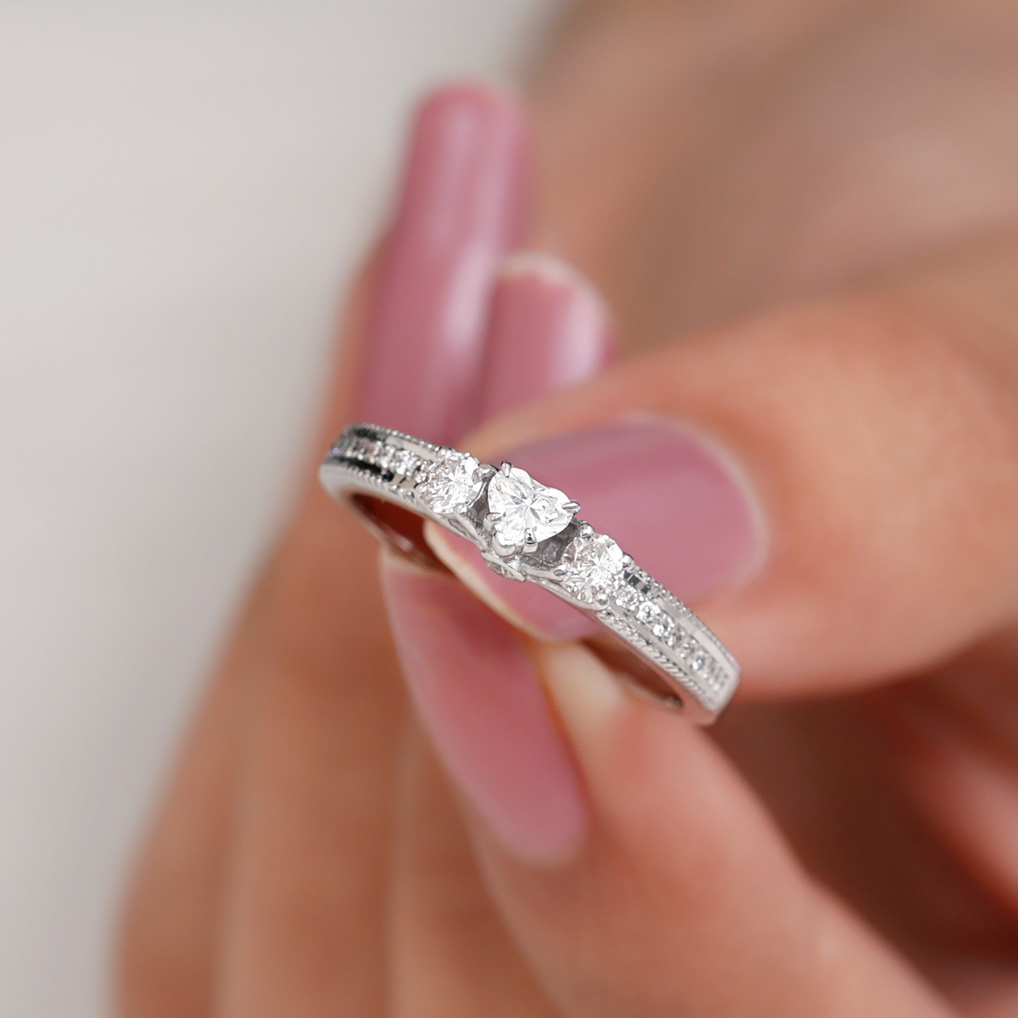 Discover timeless elegance with this Diamond Promise Ring for Her. This ring features a stunning 4 MM Heart Shaped Diamond that captures the light with every movement. The centerpiece, a brilliant-cut diamond, is expertly set to maximize its sparkle and enhance the rings delicate design. Surrounding the heart shaped Diamond, intricate beaded detailing adds a touch of vintage charm, making it a symbol of everlasting love and commitment. This Past Present Future Ring complements the central diamond with understated grace which is ideal for marking a special moment or reaffirming your vows and as enduring as the love it represents. Whether given on a special occasion or as a surprise, this Diamond 3 Stone Ring is a beautiful reminder of the promises made and the future shared.