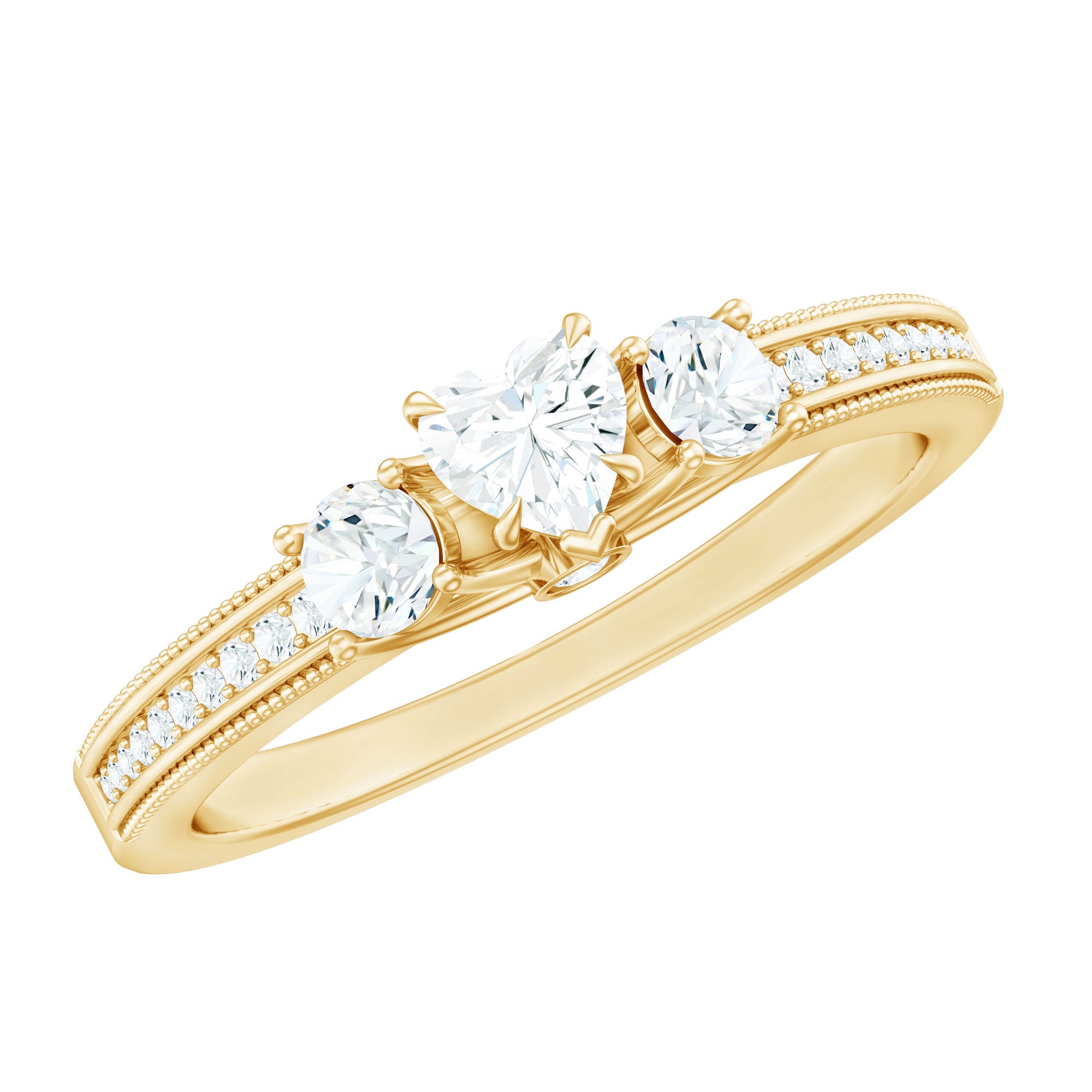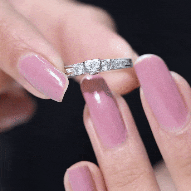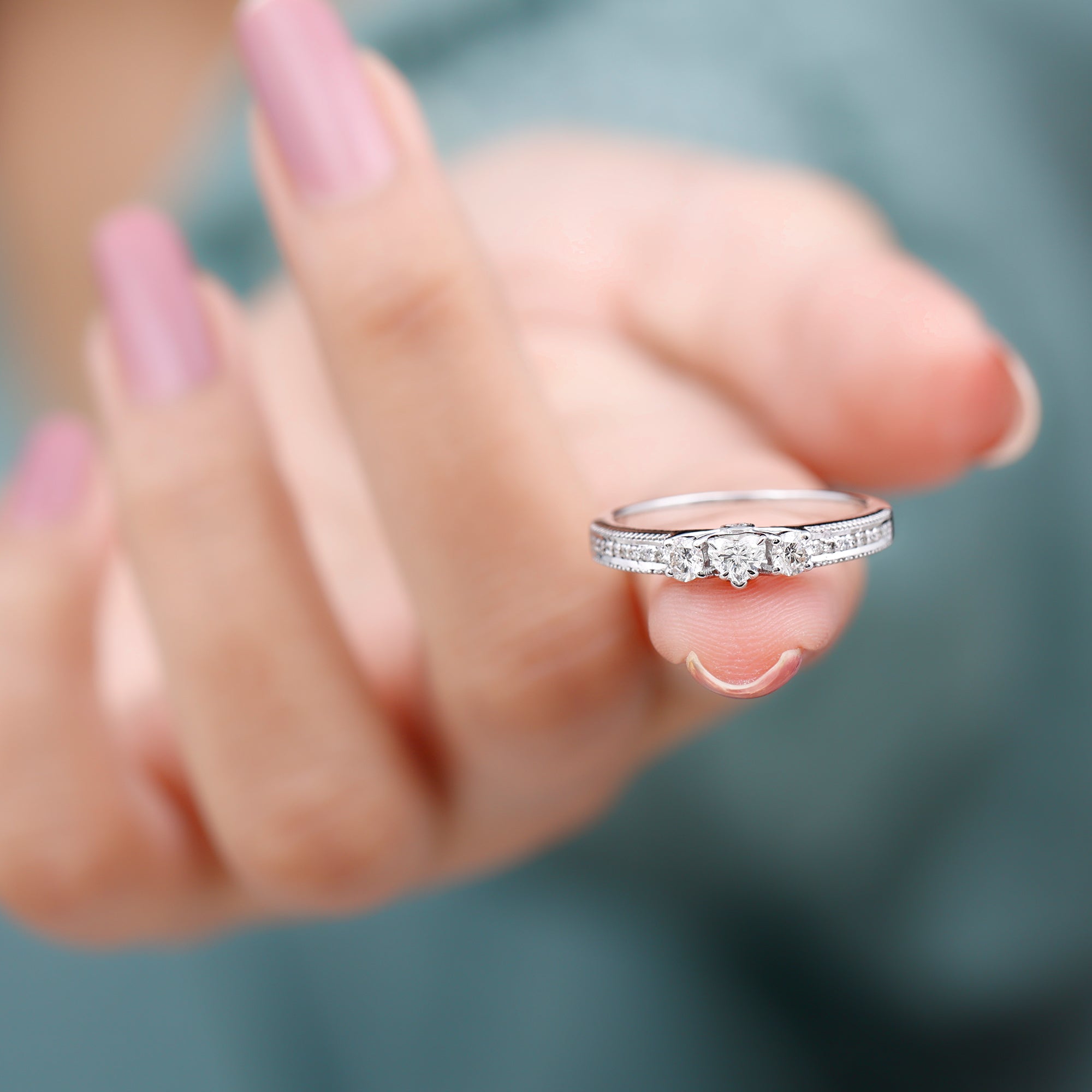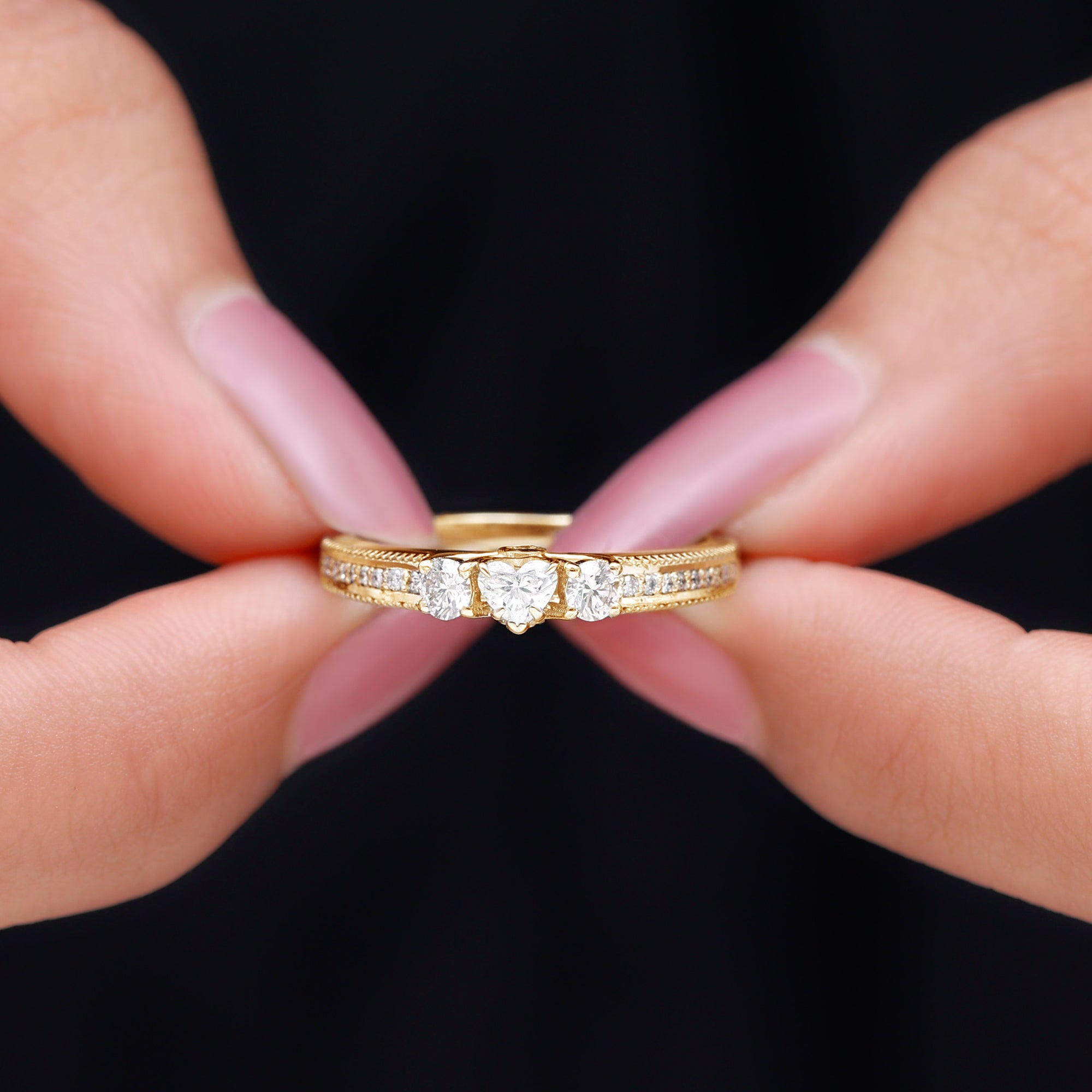 Discover timeless elegance with this Diamond Promise Ring for Her. This ring features a stunning 4 MM Heart Shaped Diamond that captures the light with every movement. The centerpiece, a brilliant-cut diamond, is expertly set to maximize its sparkle and enhance the rings delicate design. Surrounding the heart shaped Diamond, intricate beaded detailing adds a touch of vintage charm, making it a symbol of everlasting love and commitment. This Past Present Future Ring complements the central diamond with understated grace which is ideal for marking a special moment or reaffirming your vows and as enduring as the love it represents. Whether given on a special occasion or as a surprise, this Diamond 3 Stone Ring is a beautiful reminder of the promises made and the future shared.