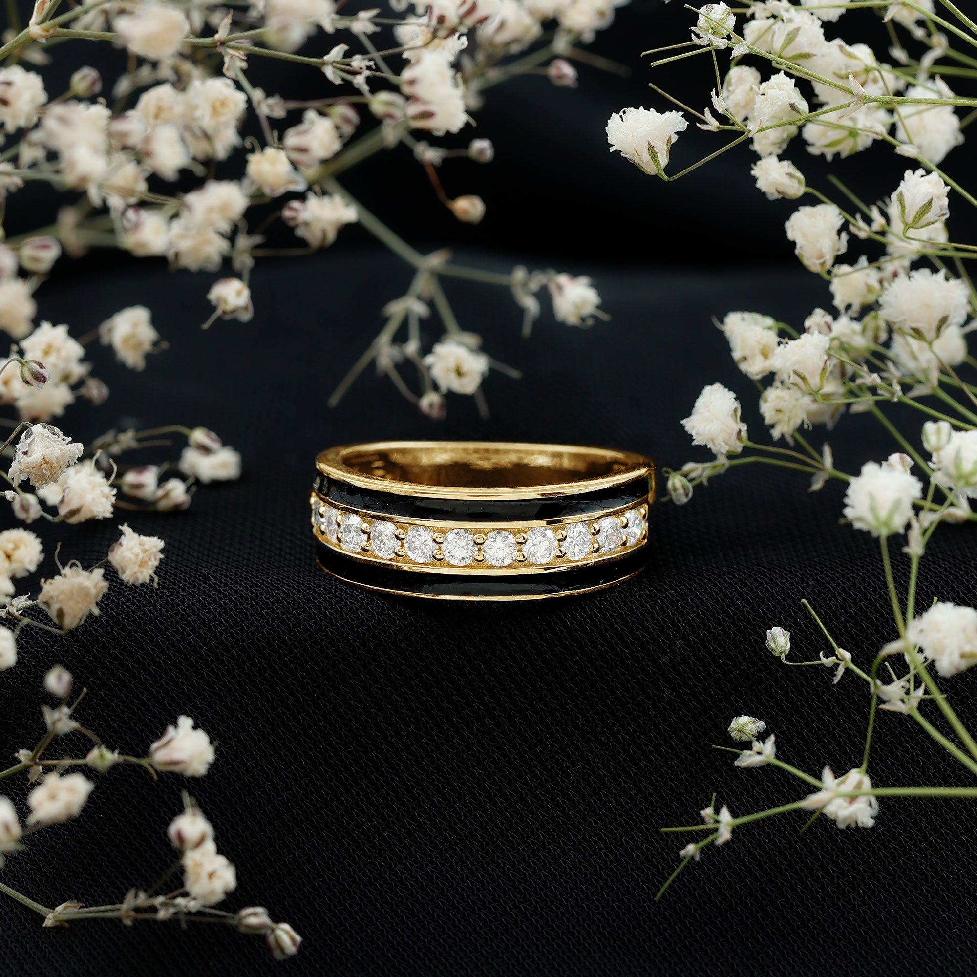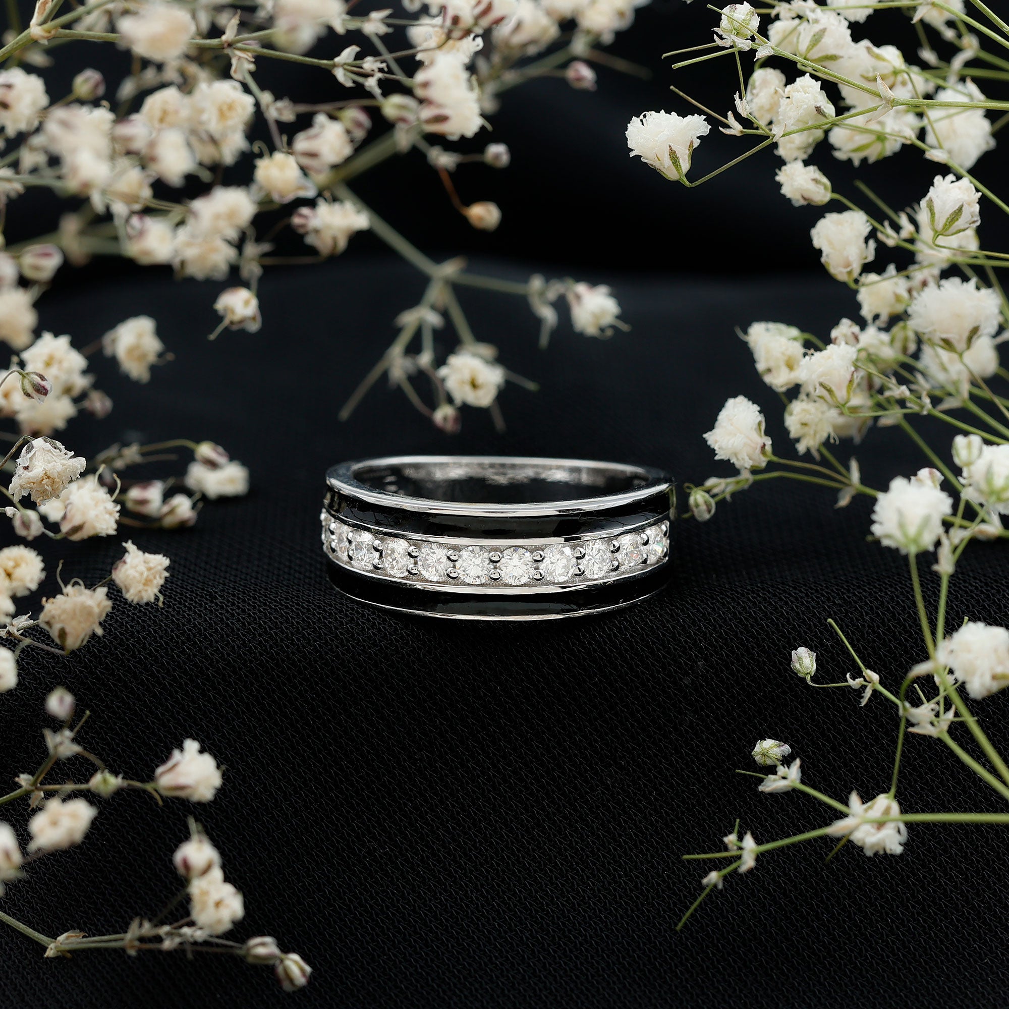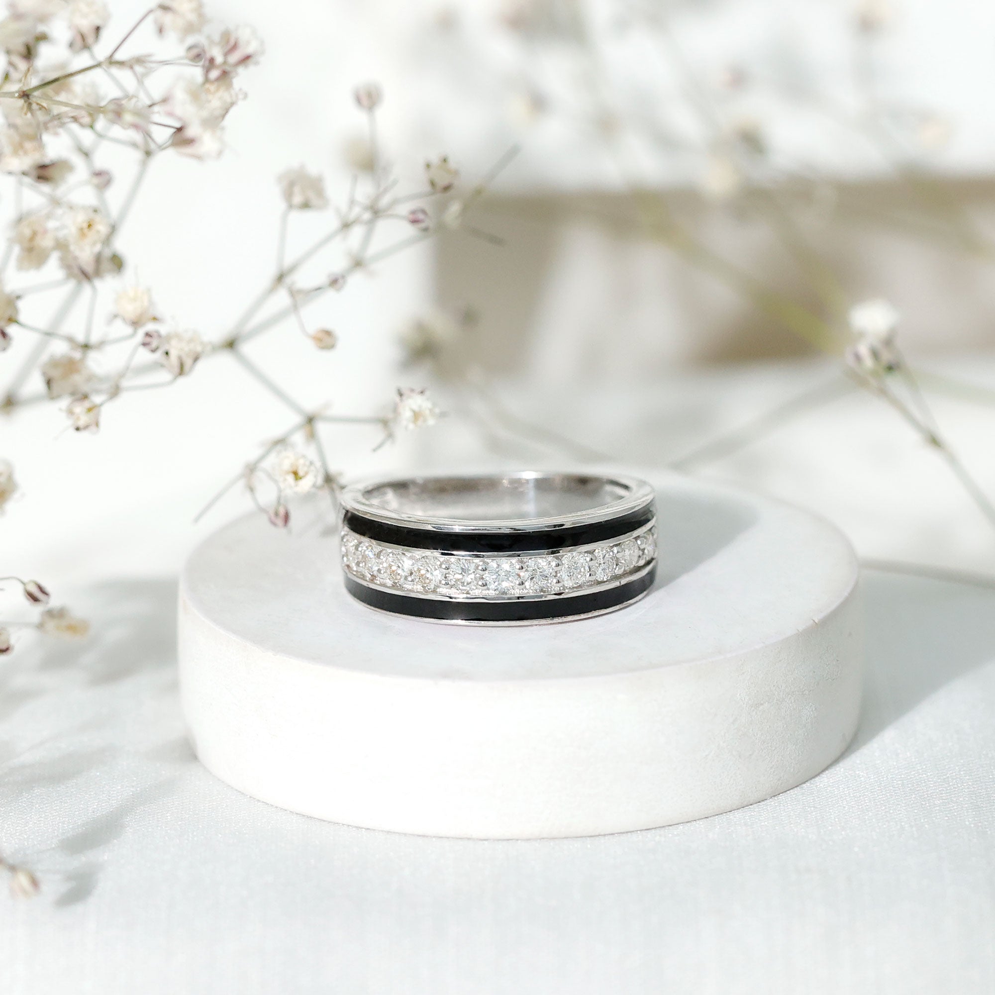 Celebrate lifes special moments with our Diamond Wide Band. This half eternity band is adorned with Diamond and black enamel, creating a classic and elegant design. The timeless beauty of this ring makes it an ideal choice for April-born men. Own this classic piece and cherish the memories it will help you create, adding a touch of luxury to every occasion.