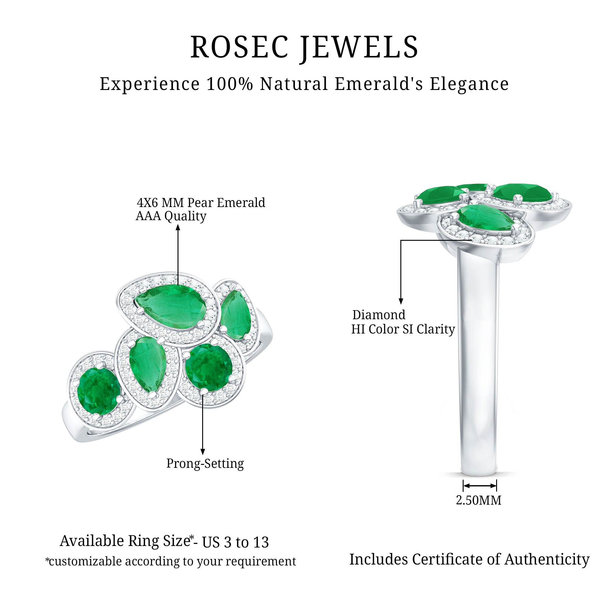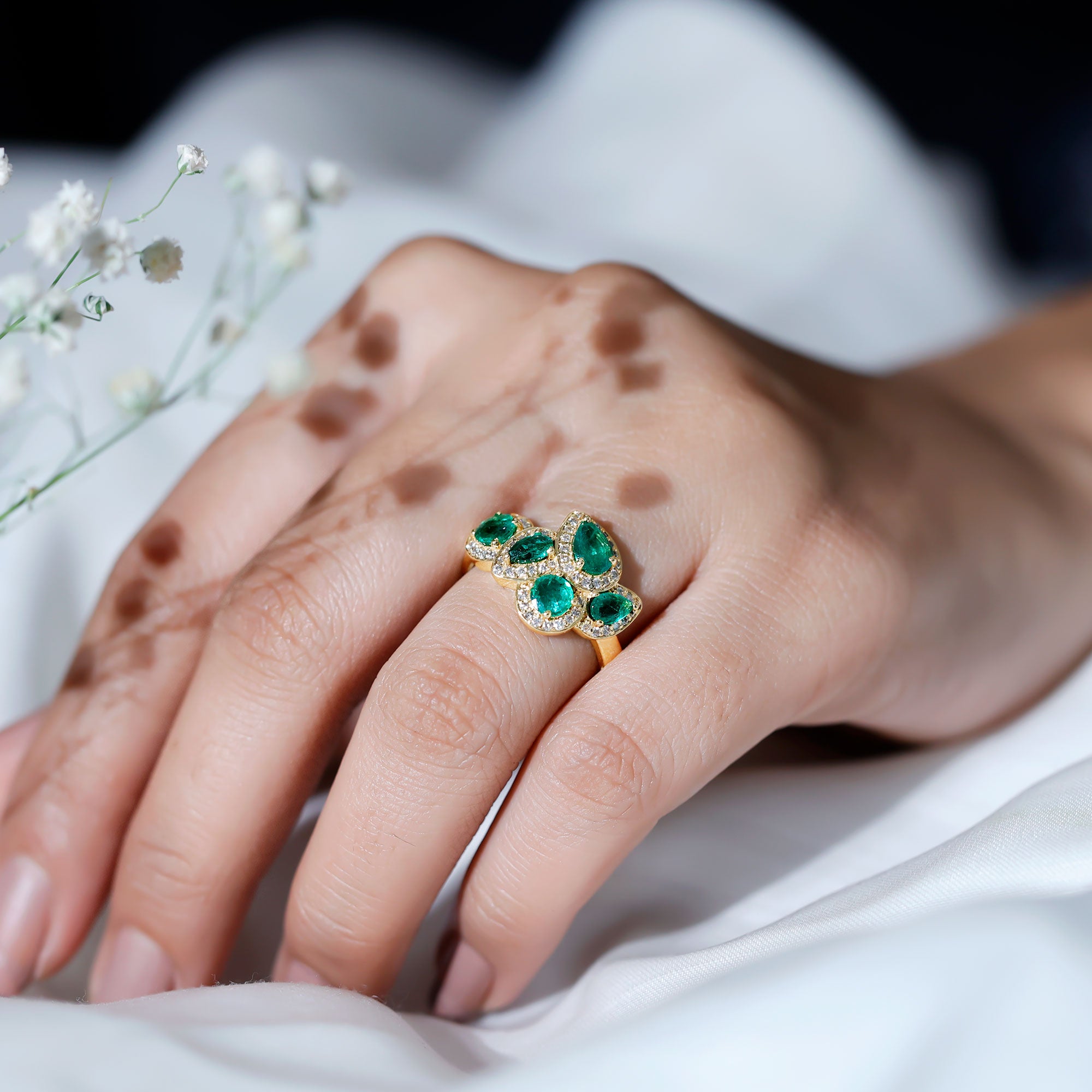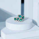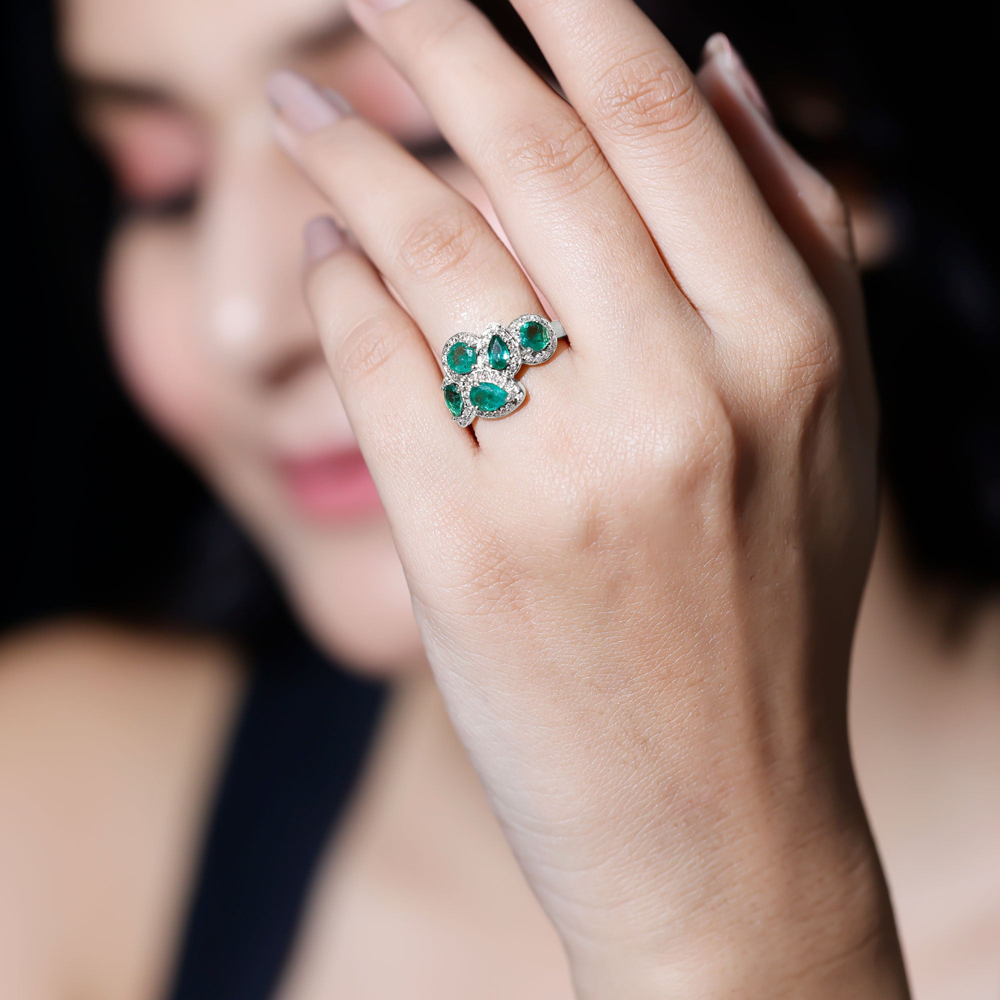 This Emerald Engagement Ring is a piece that captures elegance and timeless beauty. At its center, a cluster of pear and round shaped emeralds is arranged in a graceful design, each stone held securely in prong setting. Surrounding every emerald is a delicate halo of sparkling diamonds, enhancing the vibrant green and creating a stunning contrast that catches the light from every angle. Crafted with AAA quality emeralds and HI-SI quality diamonds, this Cluster Ring shines with clarity and brilliance. The smooth finish and precise craftsmanship ensure comfort and durability, allowing this Emerald and Diamond Engagement Ring to be worn with confidence throughout the day or evening. Its cluster design adds a bold yet refined statement, making it a perfect choice for anyone who loves distinctive elegance and timeless style. Whether chosen as a symbol of commitment, a gift for a loved one, or a statement piece for personal collection, this Emerald Cocktail Ring embodies both luxury and sentiment. Its combination of dazzling emeralds and shimmering diamonds makes it a treasured piece that elevates any look, bringing a touch of sophistication, charm, and everlasting beauty to every occasion.