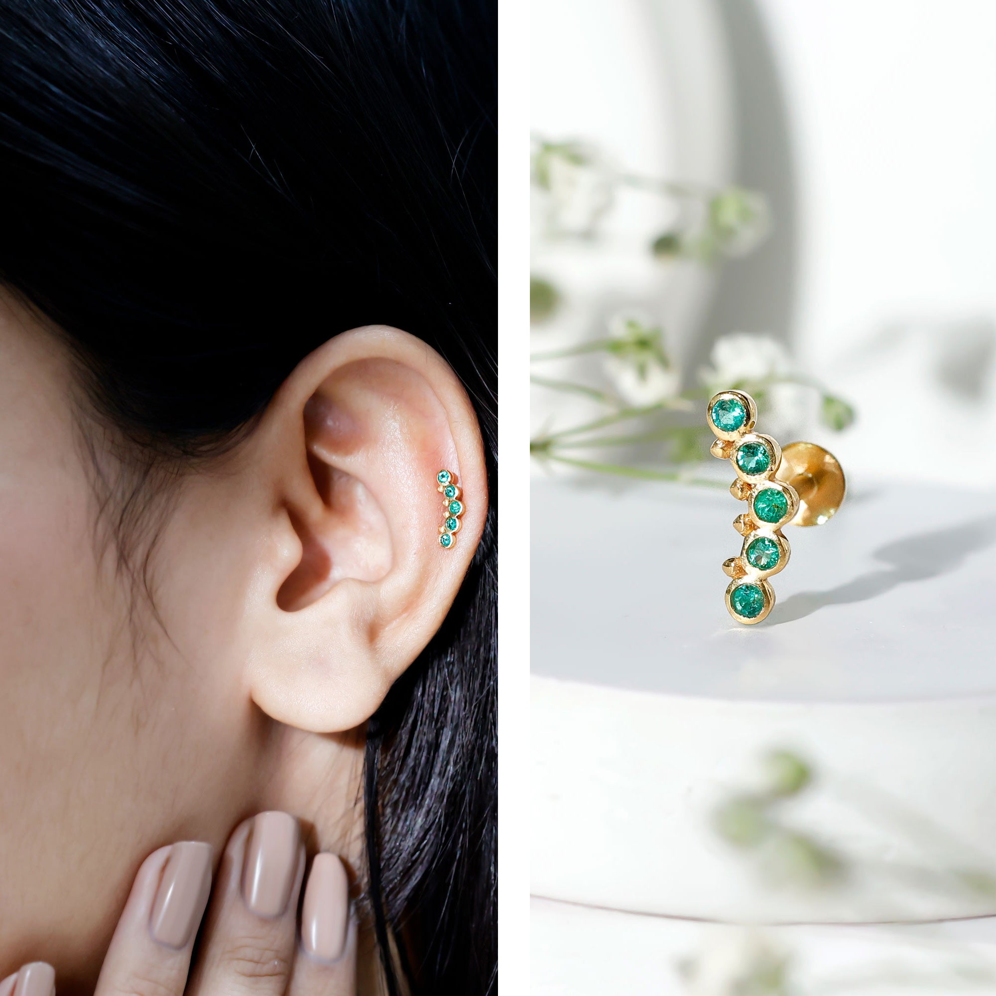 Emerald gemstones introduce a vivid green accent while the climber silhouette adds visual movement and elegance to cartilage jewelry.