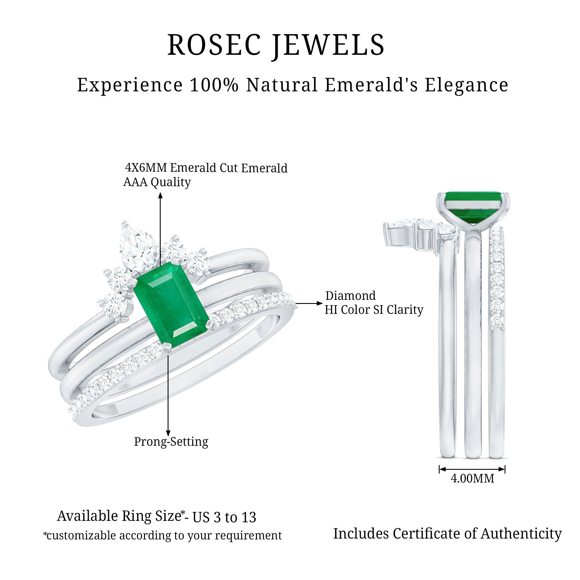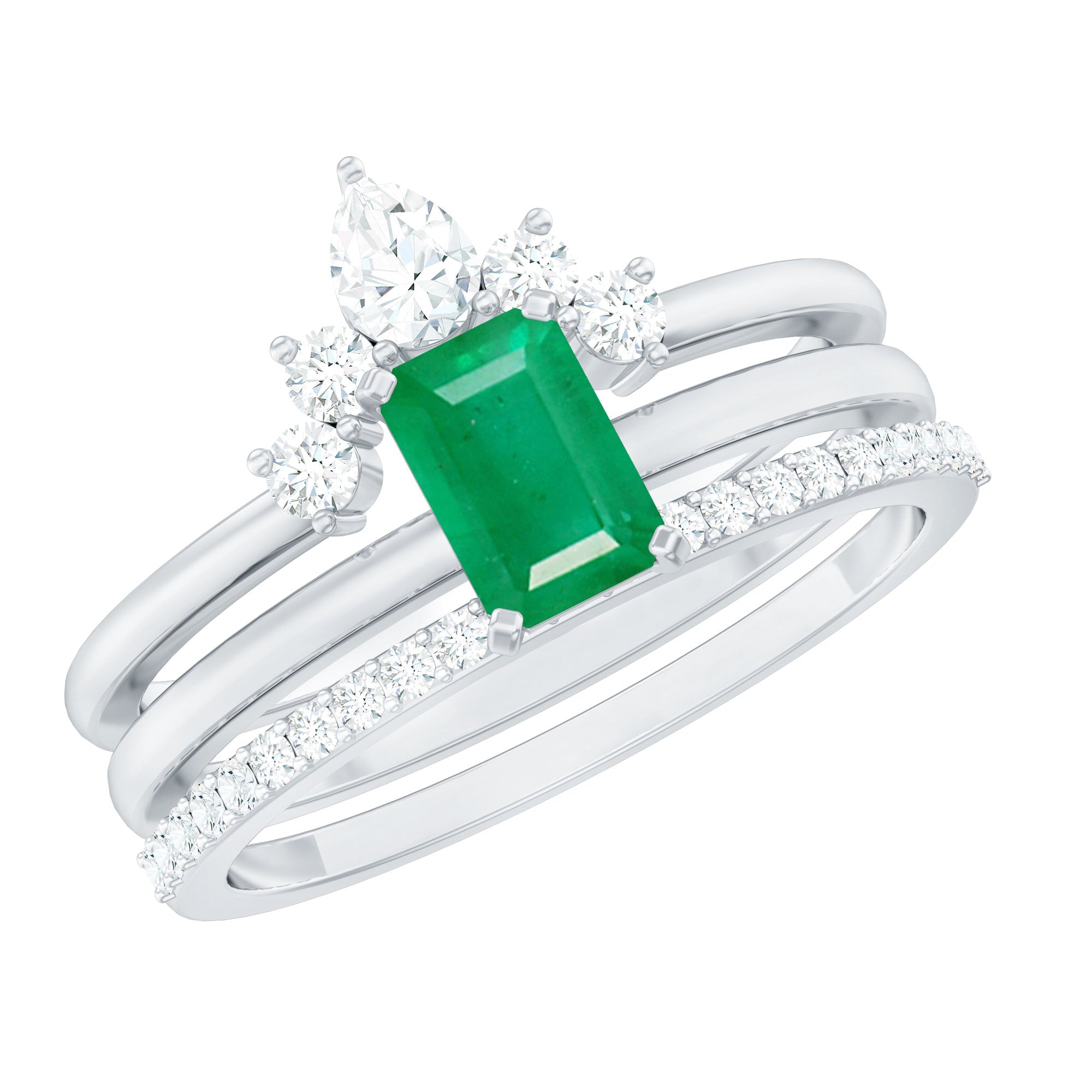 Commemorate your love story with this Wedding Engagement Ring Set designed to shine as brilliantly as your bond. This stunning 3 Piece Bridal Ring Set centers around a Solitaire Engagement Ring featuring a mesmerizing 4X6 mm Emerald Cut Emerald set in Prong Setting. Complementing this centerpiece are two graceful Enhancer Rings, one Curved Enhancer Ring is adorned with Pear and Round Shape Diamond stones, and the other straight Ring is lined with shimmering Round Diamond stones that add effortless elegance and balance. Together, these three rings create a harmonious symphony of brilliance, symbolizing the layers of love, commitment and shared dreams that define your journey together. Each piece is meticulously crafted to blend contemporary sophistication with classic romance, offering a modern yet timeless expression of everlasting love. Delivered with a signature jewelry box and a variety of ring sizes for the perfect fit, this Emerald Wedding Ring Set transforms every glance at your hand into a reminder of your unique story and unwavering connection.