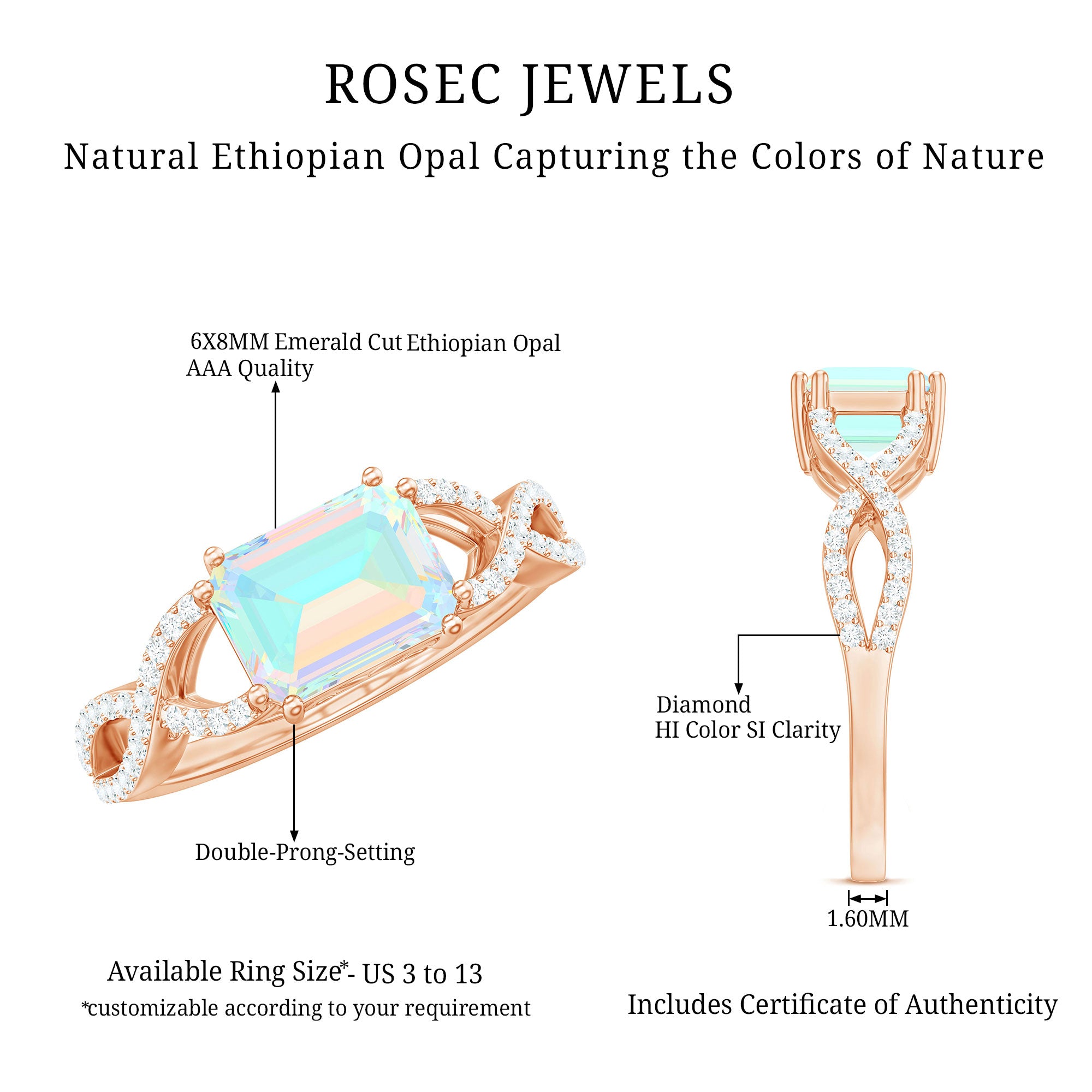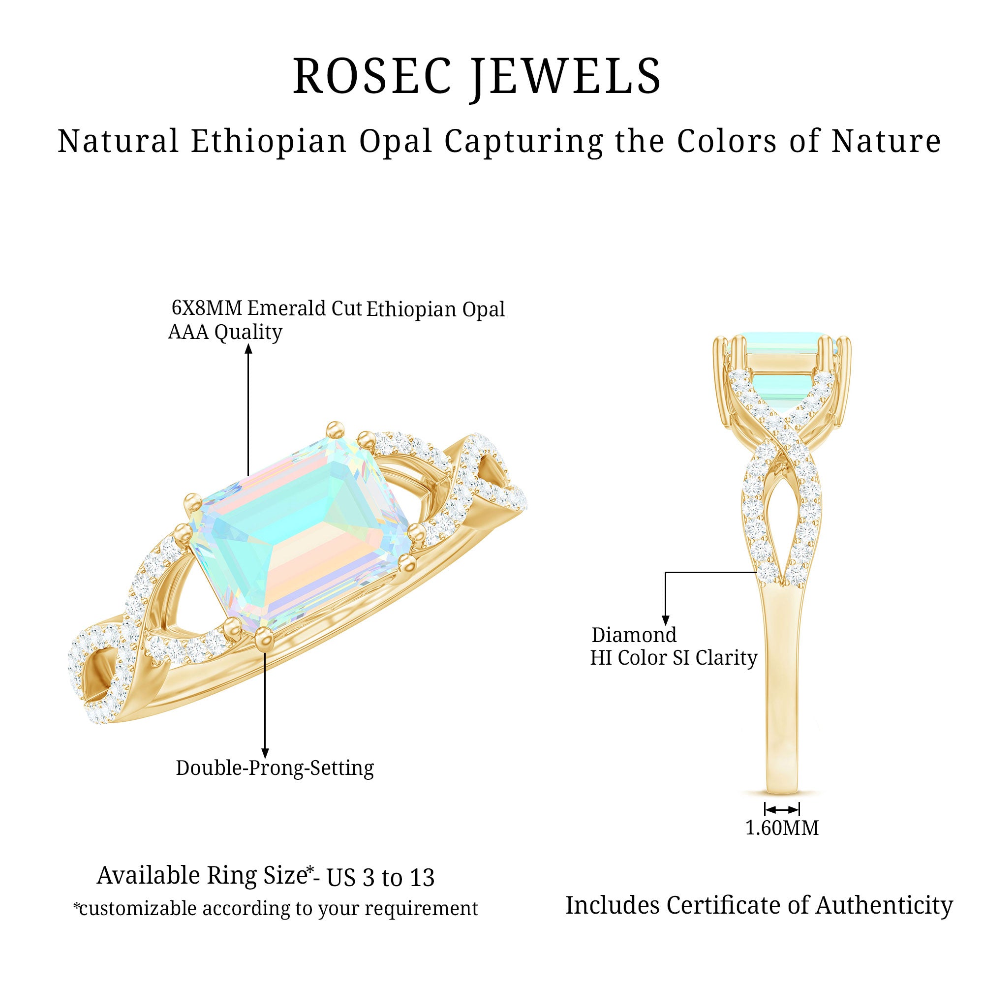 Dare to stand out with this Ethiopian Opal Engagement Ring, a sleek and luminous take on timeless romance. Featuring a glowing 6X8 mm Ethiopian Opal as the center stone in East West Style, this Solitaire Engagement Ring redefines elegance with a fresh, contemporary edge. The Emerald Cut adds refined sparkle, while the iridescent glow of the opal captures the ever-changing beauty of love itself. Framed by a graceful Crossover band accented with shimmering Diamond stones, the design flows effortlessly, symbolizing two paths becoming one. The east-west style adds a modern twist to a classic cut, making this East West Engagement Ring perfect for the bride who blends tradition with trend effortlessly. Whether you are planning the ultimate proposal or searching for a piece as unique as your love story, this Emerald Cut Engagement Ring with Opal is designed to leave a lasting impression. Available in multiple ring sizes to ensure a flawless fit, this Opal Diamond Engagement Ring comes beautifully presented in a signature jewelry box, ready to mark your moment with brilliance and meaning.
