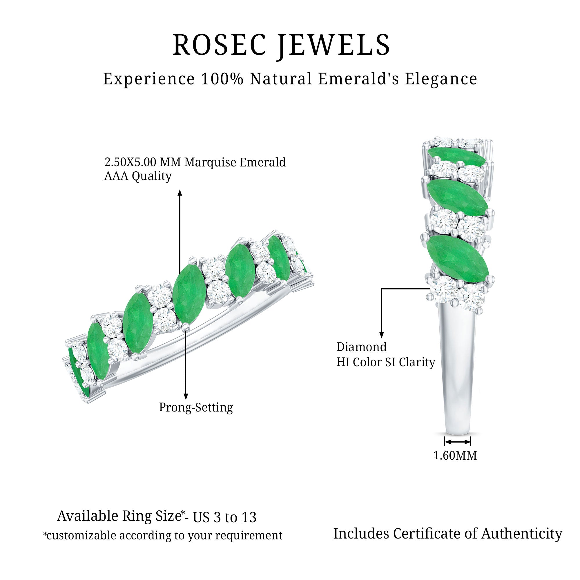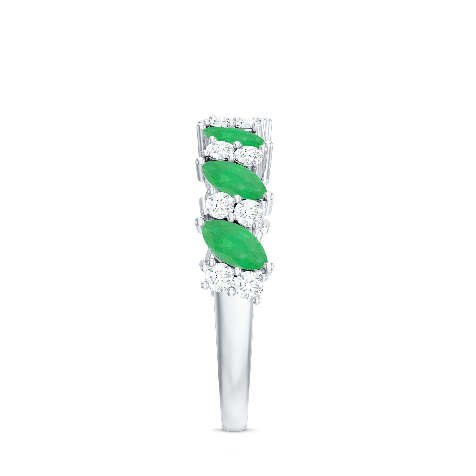 Celebrate your journey together with a ring that tells your love story in vibrant color and sparkle. This Half Eternity Band is a stunning symbol of lasting devotion, featuring a captivating pattern of tilted Marquise Shape Emerald stones paired alternately with dazzling Diamond stones. Together, they create a rhythm of elegance and emotion that wraps gracefully around the finger. Wearing this Emerald Anniversary Band feels like slipping into something truly special. This Emerald Diamond Ring hugs the finger with a refined design, enhancing the hand with a delicate, graceful shimmer that catches light and hearts from every angle. Whether worn alone or stacked with other rings, this Emerald Eternity Ring makes a statement of love that never fades. Designed in various ring sizes for that perfect fit, this Marquise Emerald Ring comes presented in a signature jewelry box, ready for gifting or your own meaningful moment.