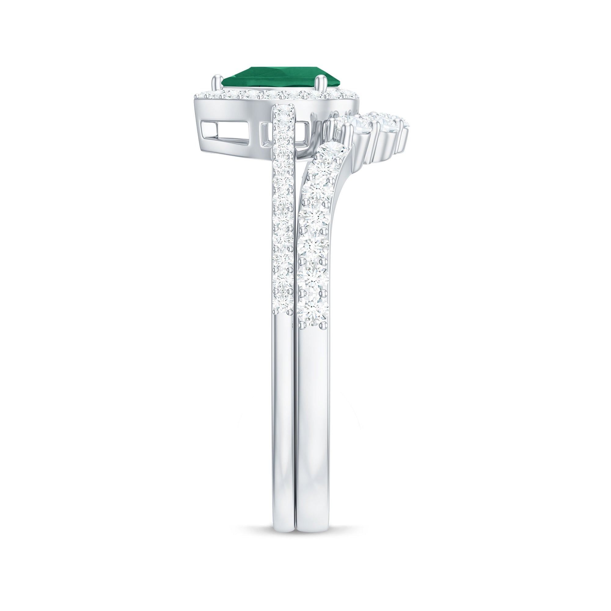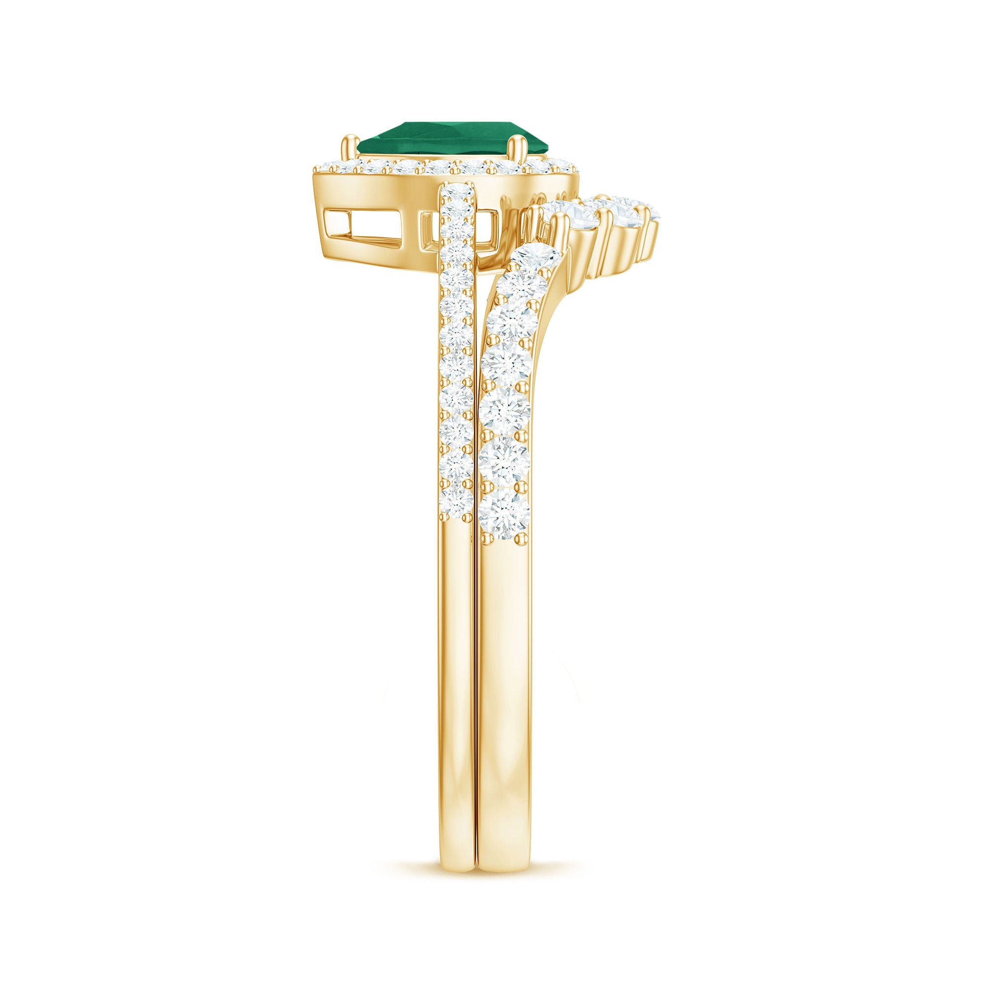 Commemorate a love as unique and radiant as your own with this Pear Shaped Engagement Ring Set, a stunning duo designed to capture hearts and turn moments into memories. The centerpiece of the Teardrop Engagement Ring is a 4X6 mm Pear Shape Emerald set in Prong Setting, which glows with a green hue, symbolizing enduring love and new beginnings. Encircled by a Halo of dazzling Diamond stones and complemented by delicate side stones, the Emerald Diamond Engagement Ring sparkles with every glance, radiating elegance and passion. Placed alongside it, the Curved Wedding Band is adorned with shimmering Diamond stones, perfectly hugging the engagement ring to create a breathtaking design. Available in a variety of sizes and presented in a signature jewelry box, this Emerald Engagement Ring with Wedding Band arrives ready to dazzle and delight. Whether given as a heartfelt gift or chosen to seal your own vows, this Wedding Bridal Ring Set is a sparkling testament to devotion, romance and a love that lasts a lifetime.