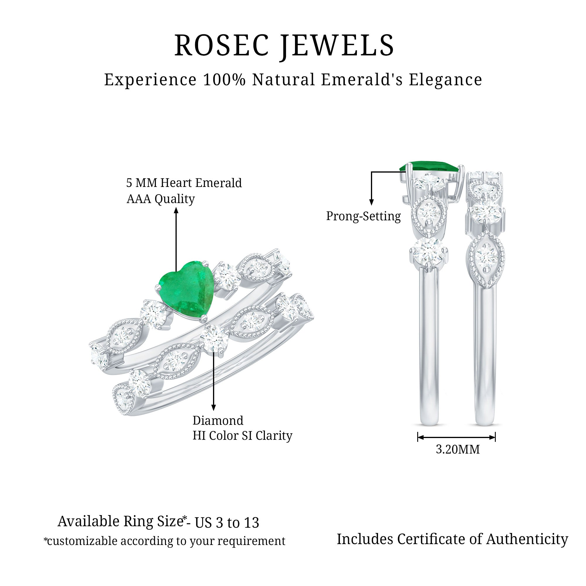 Celebrate love with this Heart Shaped Wedding Ring Set, a breathtaking duo designed to capture the essence of forever. The Solitaire Engagement Ring features a mesmerizing 5 mm Heart Shape Emerald set in Prong Setting, the gemstone of true love framed by sparkling Diamond Side Stones that add a touch of timeless radiance. Its matching Diamond studded Wedding Band completes the set in perfect harmony, symbolizing two hearts coming together as one. Both rings are enriched with delicate Beaded Detailing, giving them a romantic, vintage charm that speaks of grace and devotion. Every glance at this Emerald Wedding Ring Set is a reminder of promises made and a love that deepens with time. Whether for a proposal, an anniversary or a special gift, this Heart Engagement Ring with Wedding Band transforms moments into memories that last a lifetime. Presented in an elegant jewelry box and available in multiple sizes, this Vintage Wedding Ring Set is ready to sweep her off her feet from the very first look.