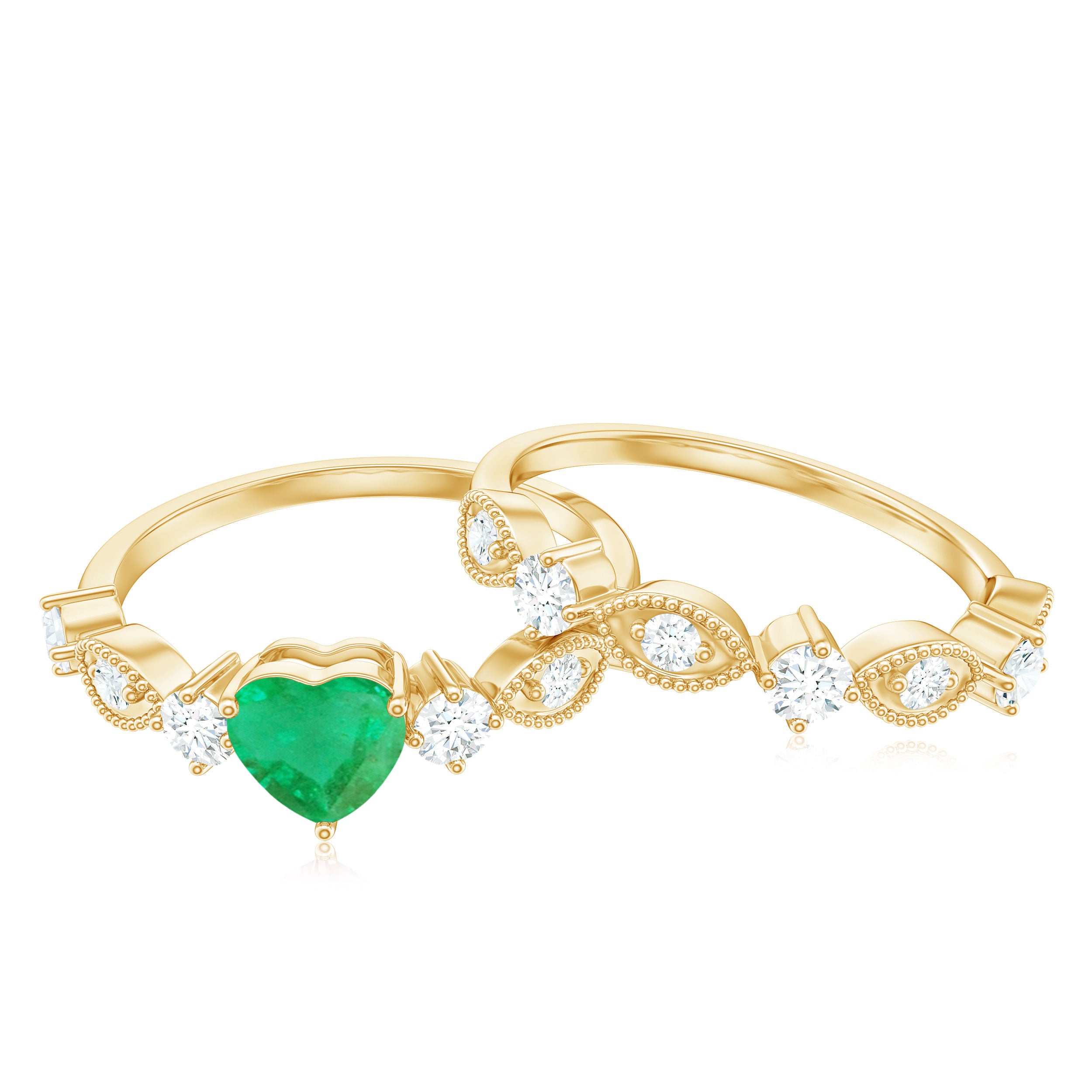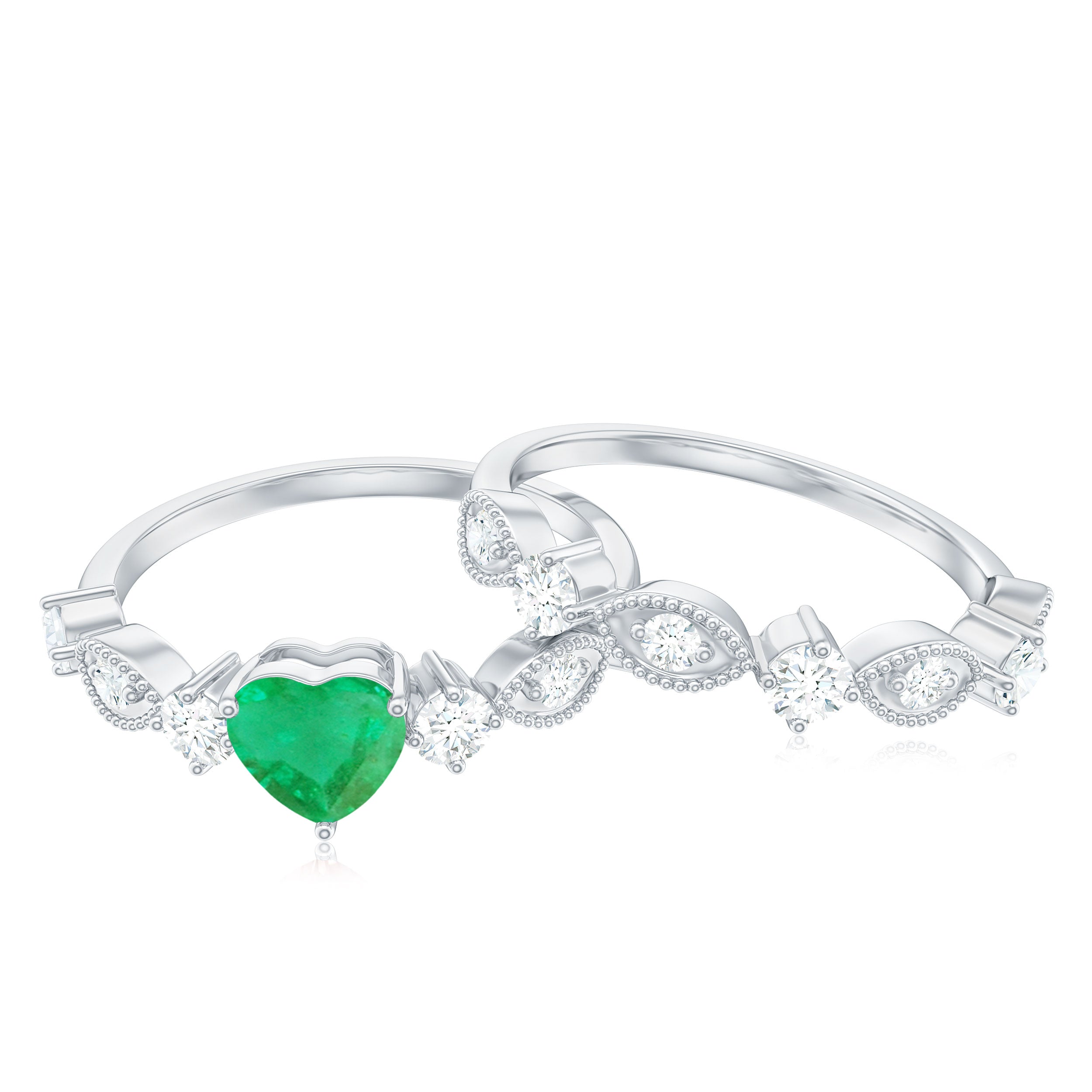 Natural Emerald Heart Shaped Engagement Ring and Diamond Wedding Band