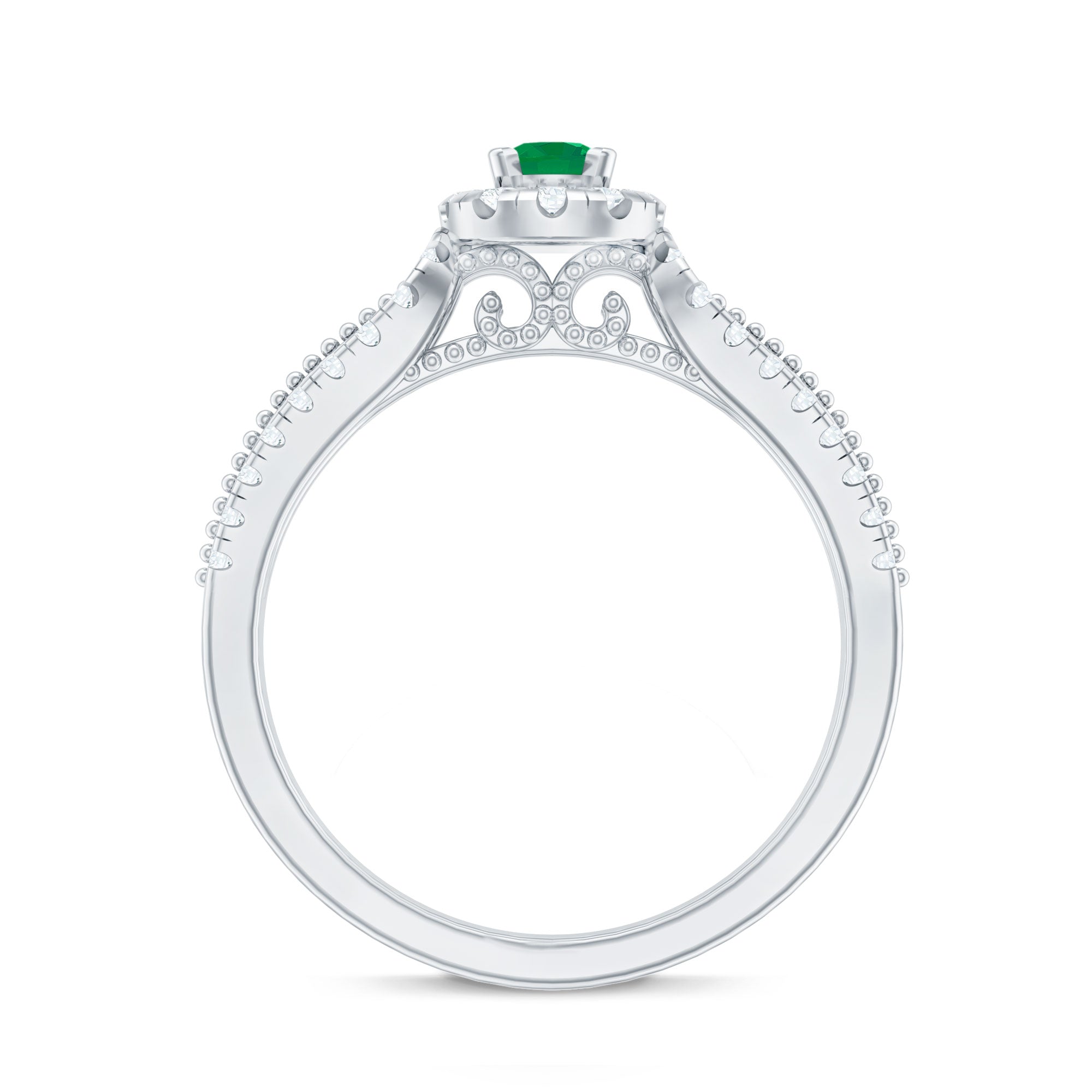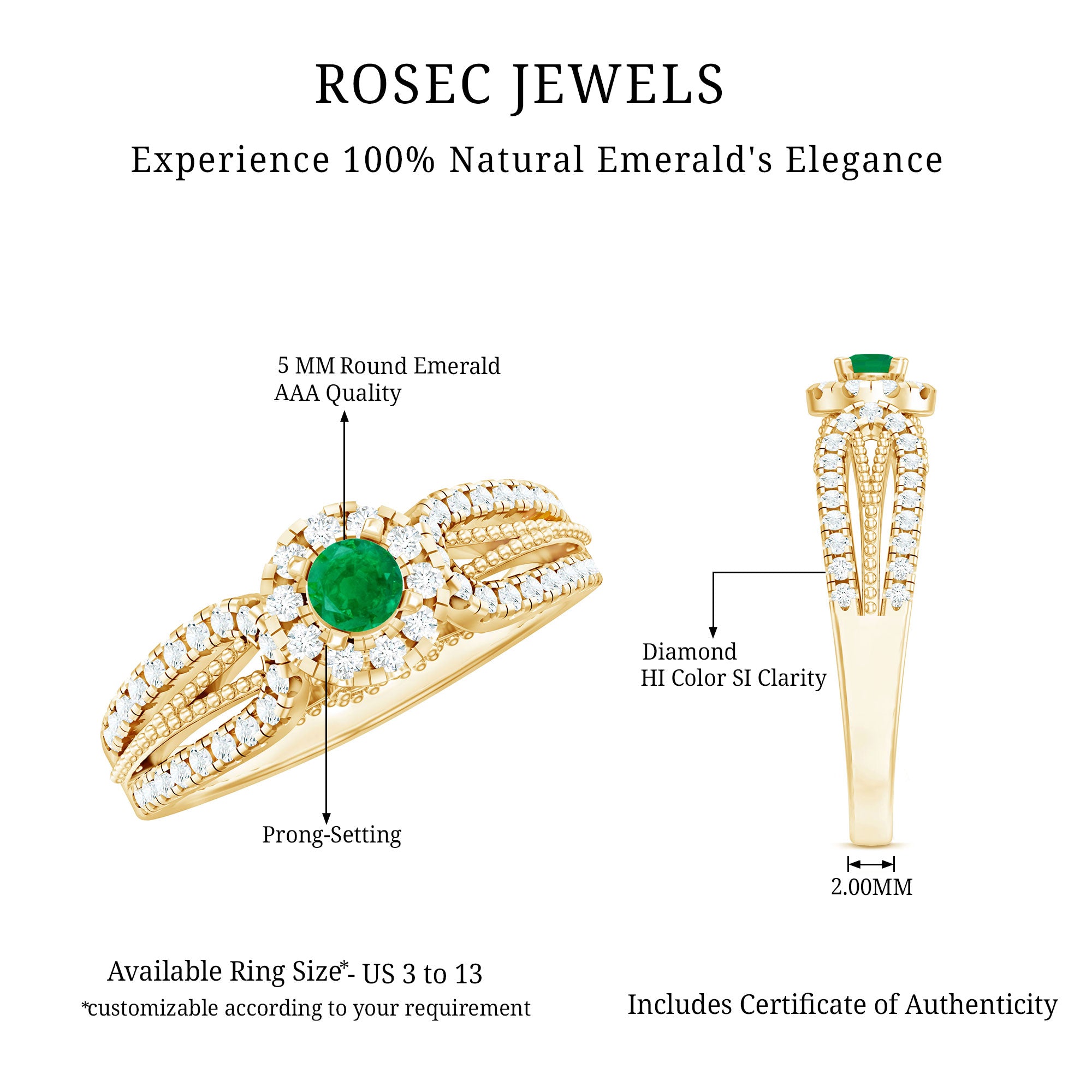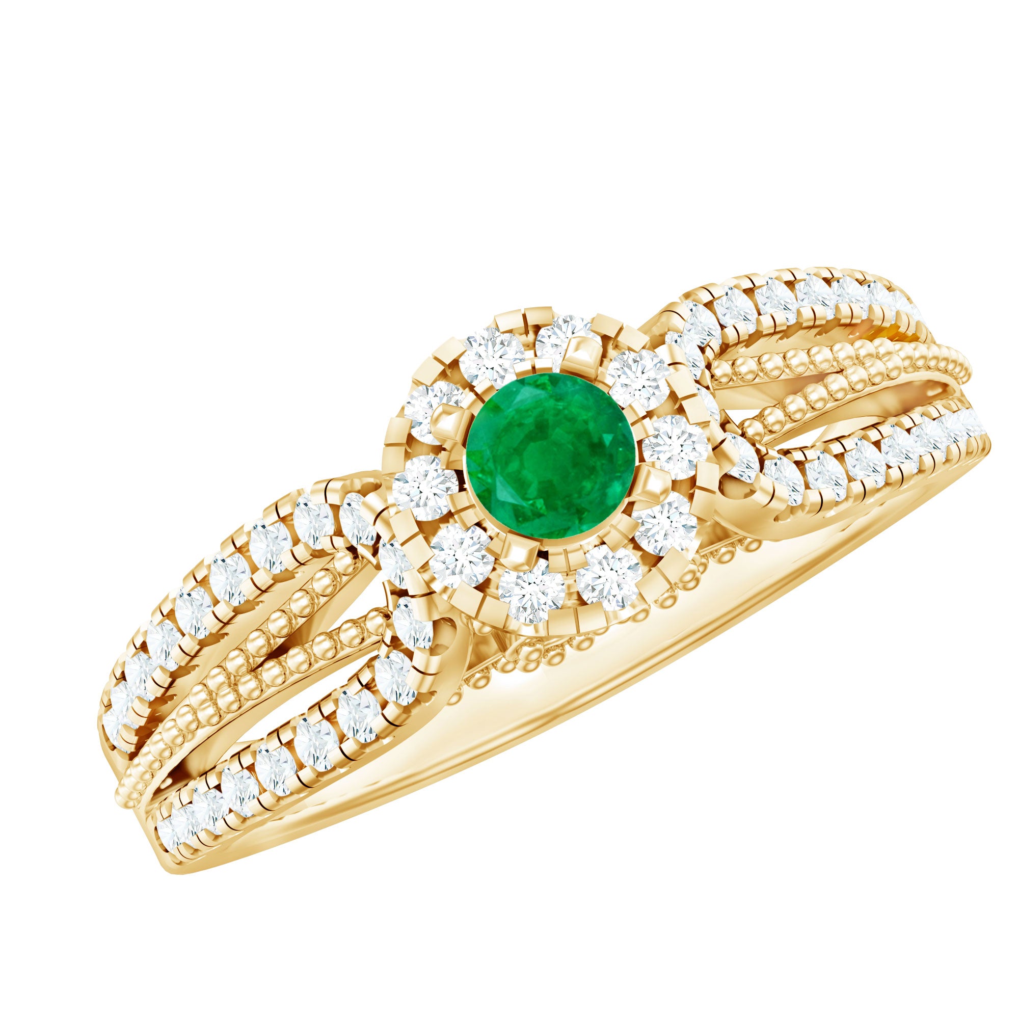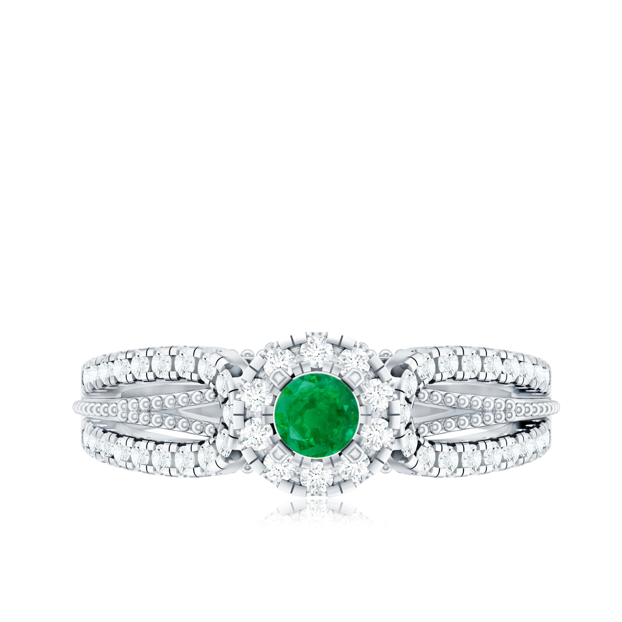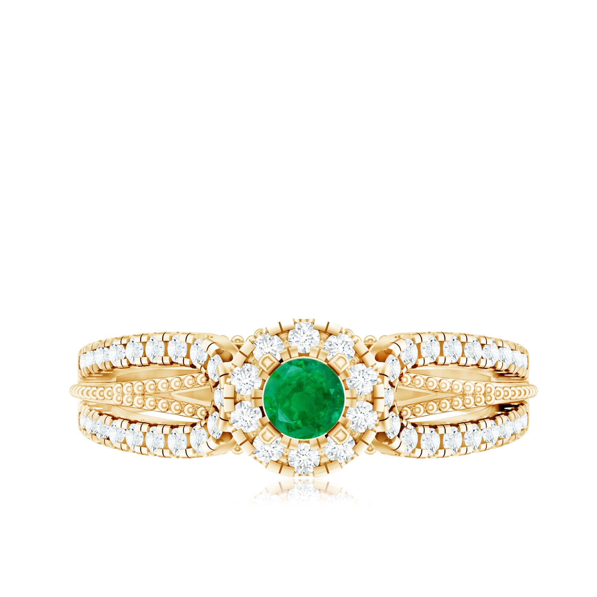Awaken timeless romance with this Emerald Engagement Ring, where vintage charm meets modern elegance. At its center, a 5 mm Round Shape Emerald shines with mesmerizing depth, surrounded by a sparkling Halo of Diamond stones that amplify its brilliance from every angle. The Diamond studded Split Shank, adorned with delicate Beaded Detailing, adds a touch of intricate artistry, making each curve feel like it was crafted to tell your unique love story. This Vintage looking Engagement Ring effortlessly blends classic sophistication with contemporary style. Designed in various sizes to ensure a perfect, comfortable fit, this Split Shank Engagement Ring comes elegantly presented in a jewelry box, ready to transform a proposal or special moment into a memory that lasts forever. Every facet of this Emerald Diamond Engagement Ring is a celebration of connection, passion and devotion, capturing the essence of a love meant to endure through the ages.