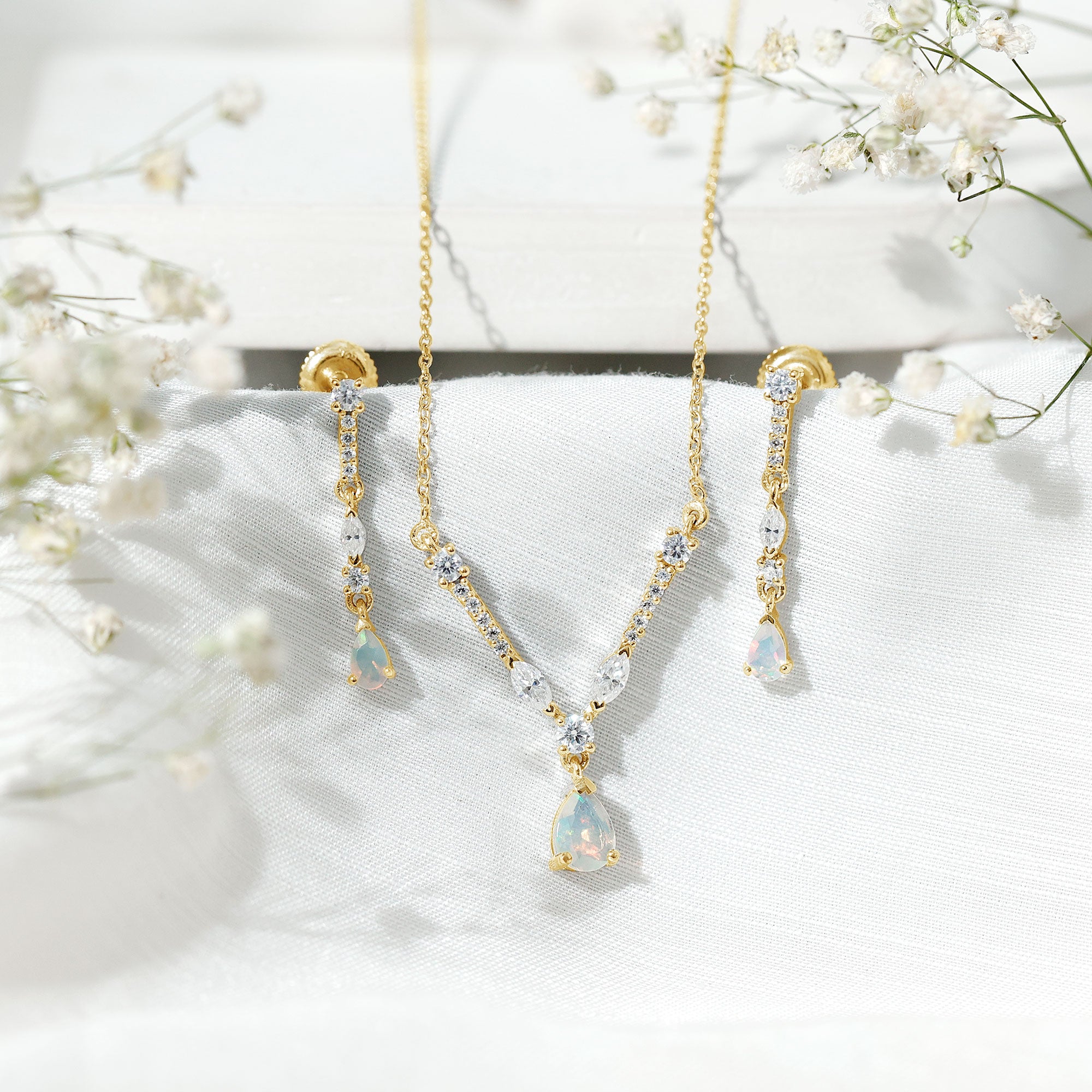Get ready for your wedding day with this stunning Ethiopian Opal Jewelry Set, designed to make your bridal look shine with grace and elegance. The Necklace Set features a striking pear cut Ethiopian opal as the centerpiece, beautifully set in secure prong setting. Complementing the opal are sparkling round and marquise cut Moissanite stones, adding brilliance and sophistication to both the Necklace and Earrings. This combination creates a dazzling interplay of color and sparkle, perfect for capturing attention and adding a touch of glamour to your bridal look. The necklace is designed for versatility and comfort, featuring a lobster clasp that allows for adjustable lengths to suit different necklines. The coordinating dangle drop earrings come with secure screw back closures, ensuring they stay in place throughout your special day. Lightweight yet luxurious, the Opal Necklace and Earrings Set balances elegance with wearability, making it ideal for long hours at your wedding ceremony, reception, or even pre-wedding events. Beyond the big day, this Drop Jewelry Set is a timeless addition to any collection.