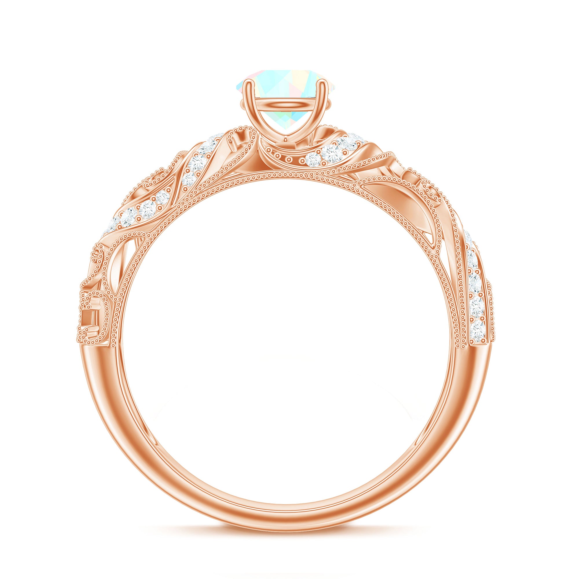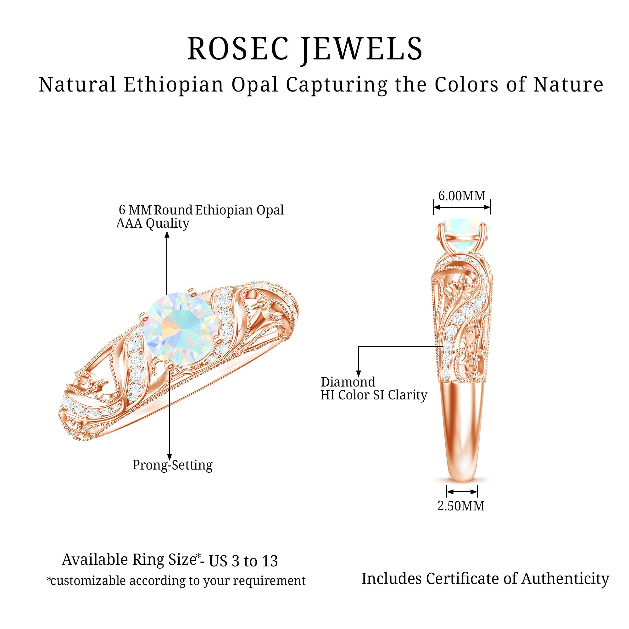 Embrace the world of vintage romance with this Vintage Inspired Engagement Ring, a mesmerizing blend of old-soul elegance and modern magic. At the center of this piece lies a captivating 6 mm Round Shape Ethiopian Opal set in Prong Setting. Framed by sparkling Diamond stones and intricate Beaded Detailing, the center stone is beautifully set within a vintage inspired band that echoes the grace of bygone eras. The delicate craftsmanship of band adds depth and texture, making this Opal Diamond Engagement Ring feel like an heirloom from day one. Perfect for the bride who adores classic aesthetics with a unique twist, this Real Opal Engagement Ring offers style and deep meaning. This Vintage Opal Engagement Ring arrives in a signature jewelry box, ready for that unforgettable moment, and is available in a range of sizes to ensure the ideal fit. Whether you are drawn to its antique charm or the glow of the opal, this Real Opal Engagement Ring is a celebration of eternal love.