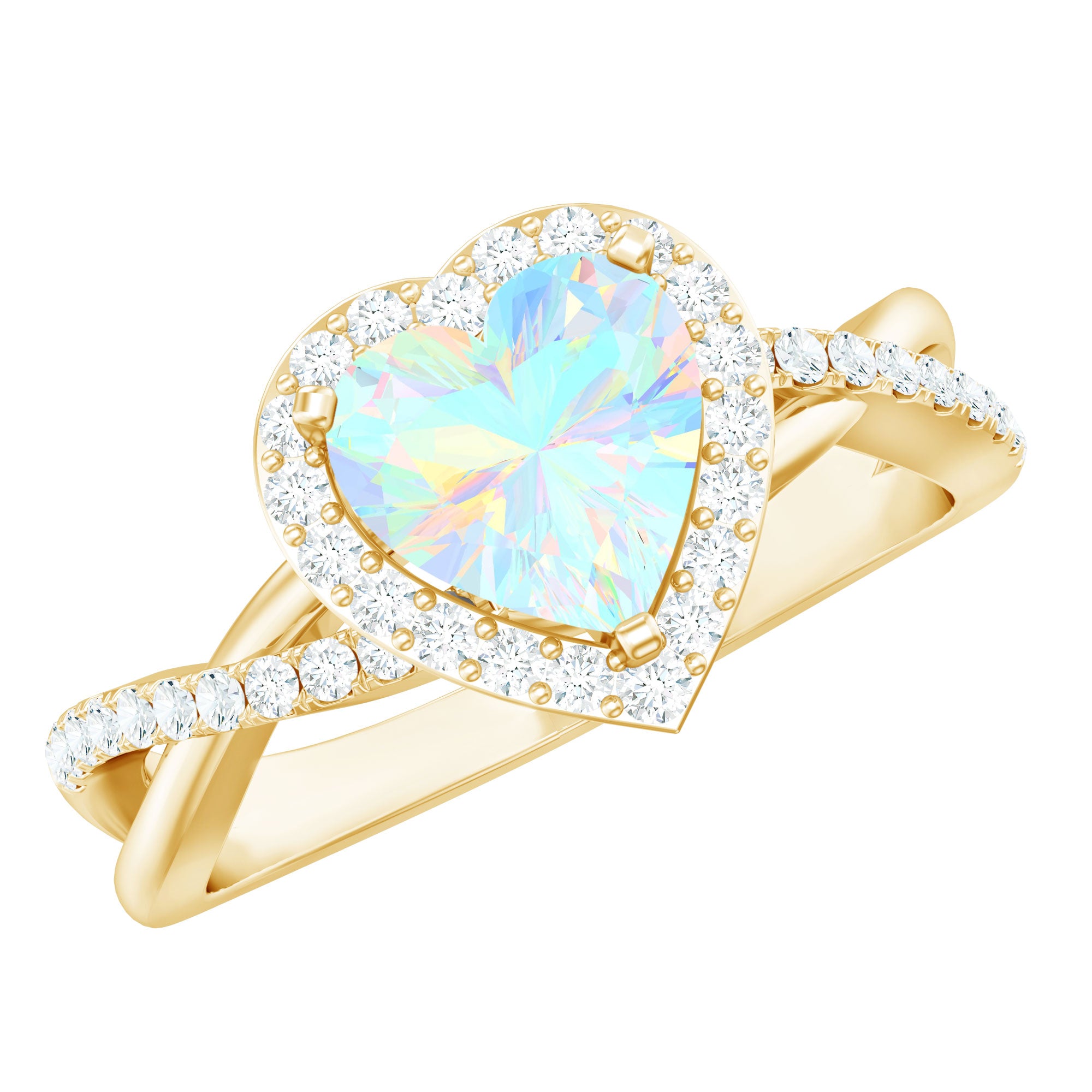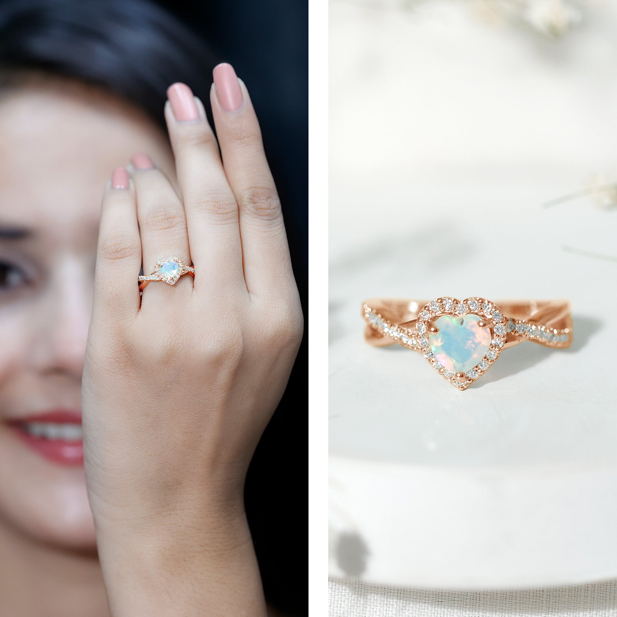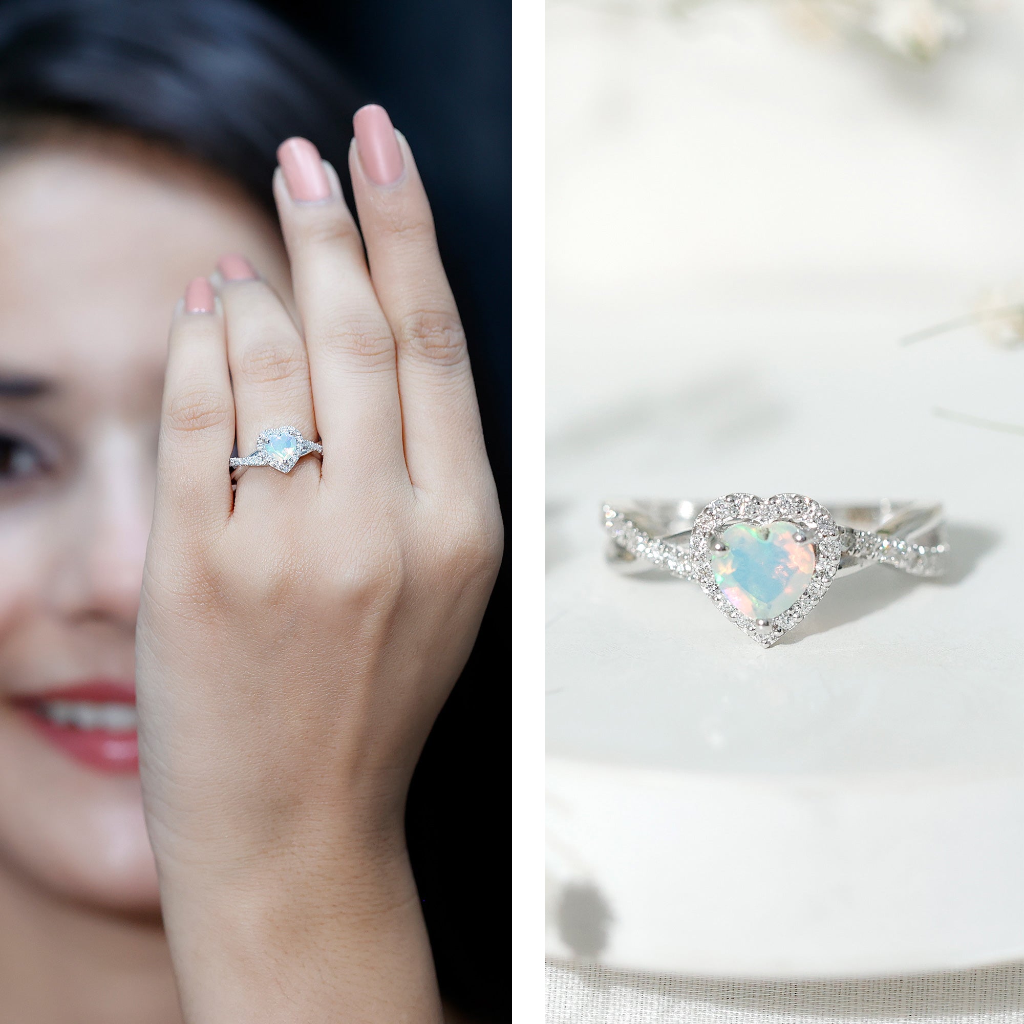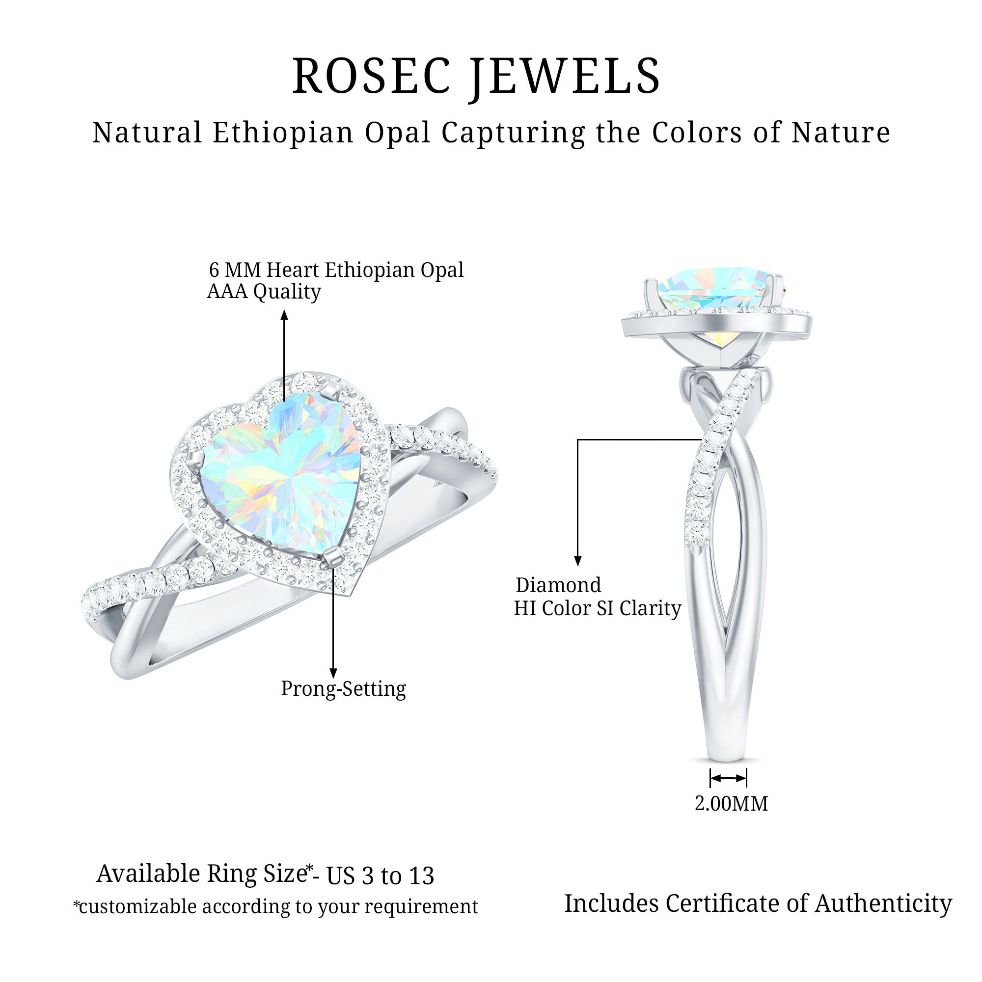 Embody the spirit of true love with this Heart Shaped Engagement Ring, a stunning symbol of affection and devotion. At the center of this stunning design is a 6 mm Heart Shape Ethiopian Opal set in Prong Setting, glowing with an incredible play of color. Surrounded by a sparkling Diamond Halo and set on a Crossover Shank adorned with dainty Diamond stones, this Halo Engagement Ring with Opal exudes timeless elegance with a modern twist. The captivating beauty of opal is perfectly complemented by the diamond stones, creating a look that is both striking and sophisticated. Whether you are proposing, celebrating an anniversary or simply marking a milestone, this Opal Heart Ring is a radiant reflection of your eternal love. Crafted with perfection and care, the Crossover Ring comes beautifully packaged in a signature jewelry box, ready to impress. Available in various sizes to ensure the perfect fit, this Opal Diamond Engagement Ring is an unforgettable piece that will dazzle for years to come. For the woman who seeks something truly extraordinary, this Ethiopian Opal Ring is a celebration of love, passion and the moments that take your breath away.