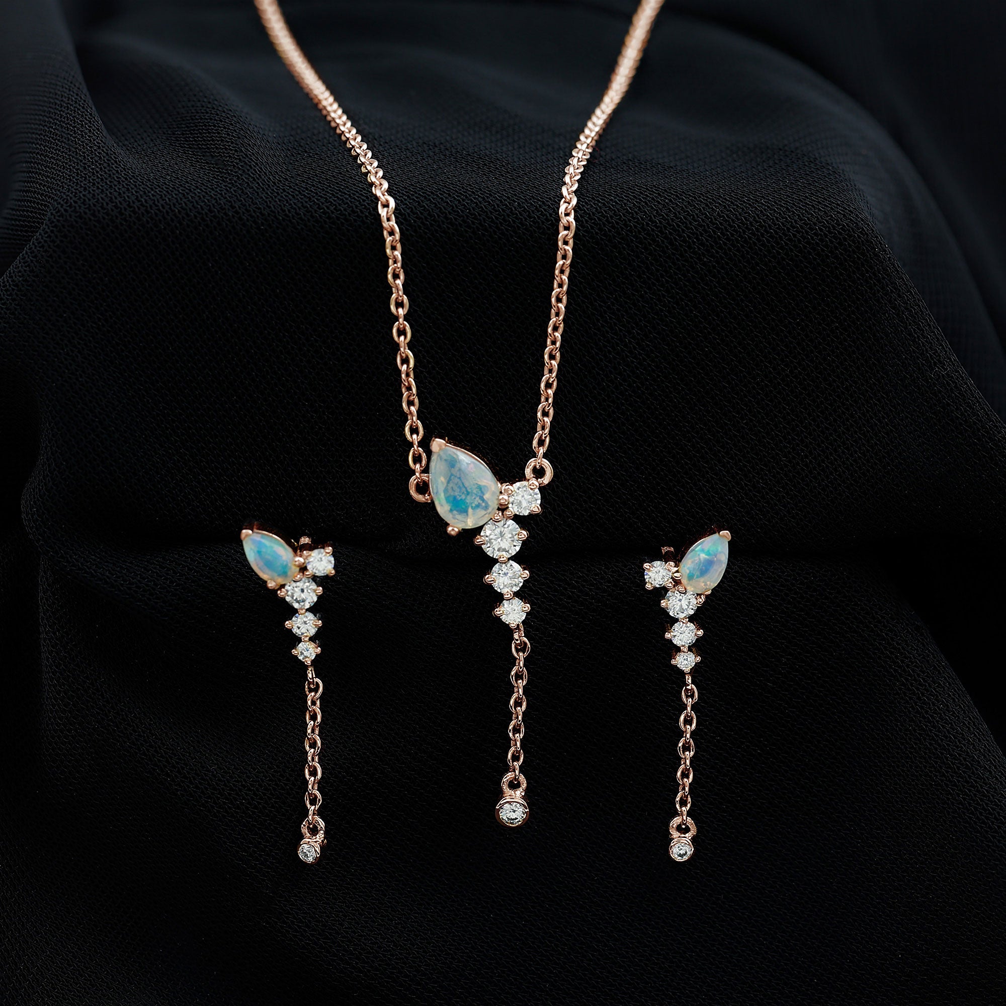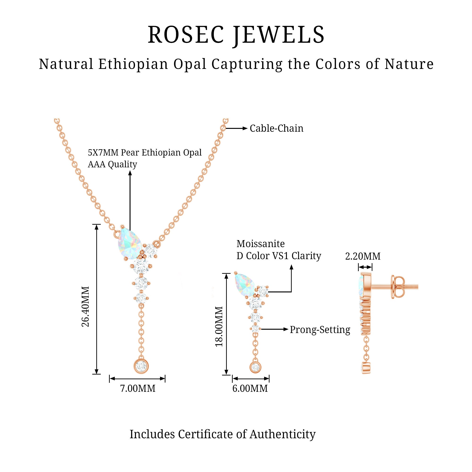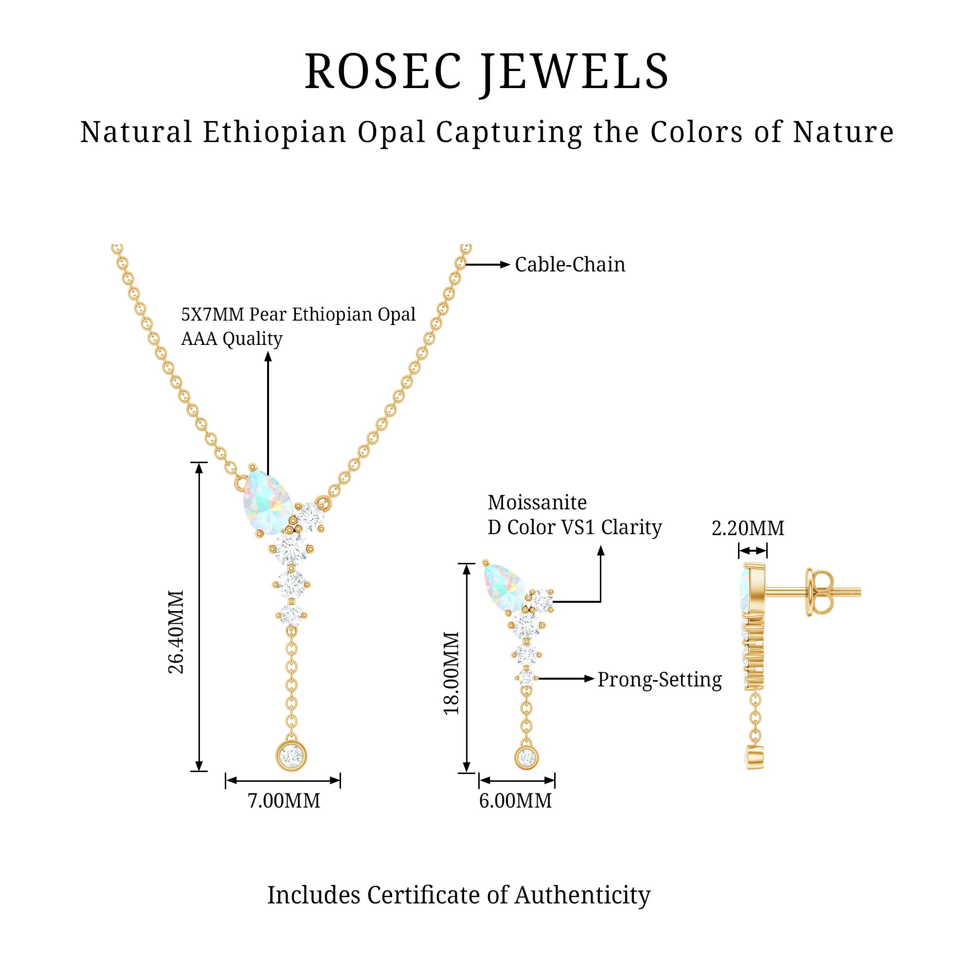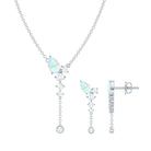 The beautiful Pear Cut Ethiopian Opal in Prong Setting at the top with Moissanite drop with a delicate chain on Jewelry Set sure to leave you stunned. Comes with a matching pair of earrings with a Screw Back closure is perfect to put on your special day. Present this Drop Jewelry Set to your dearest one as a token of love that we are sure she will find super romantic and charming.
