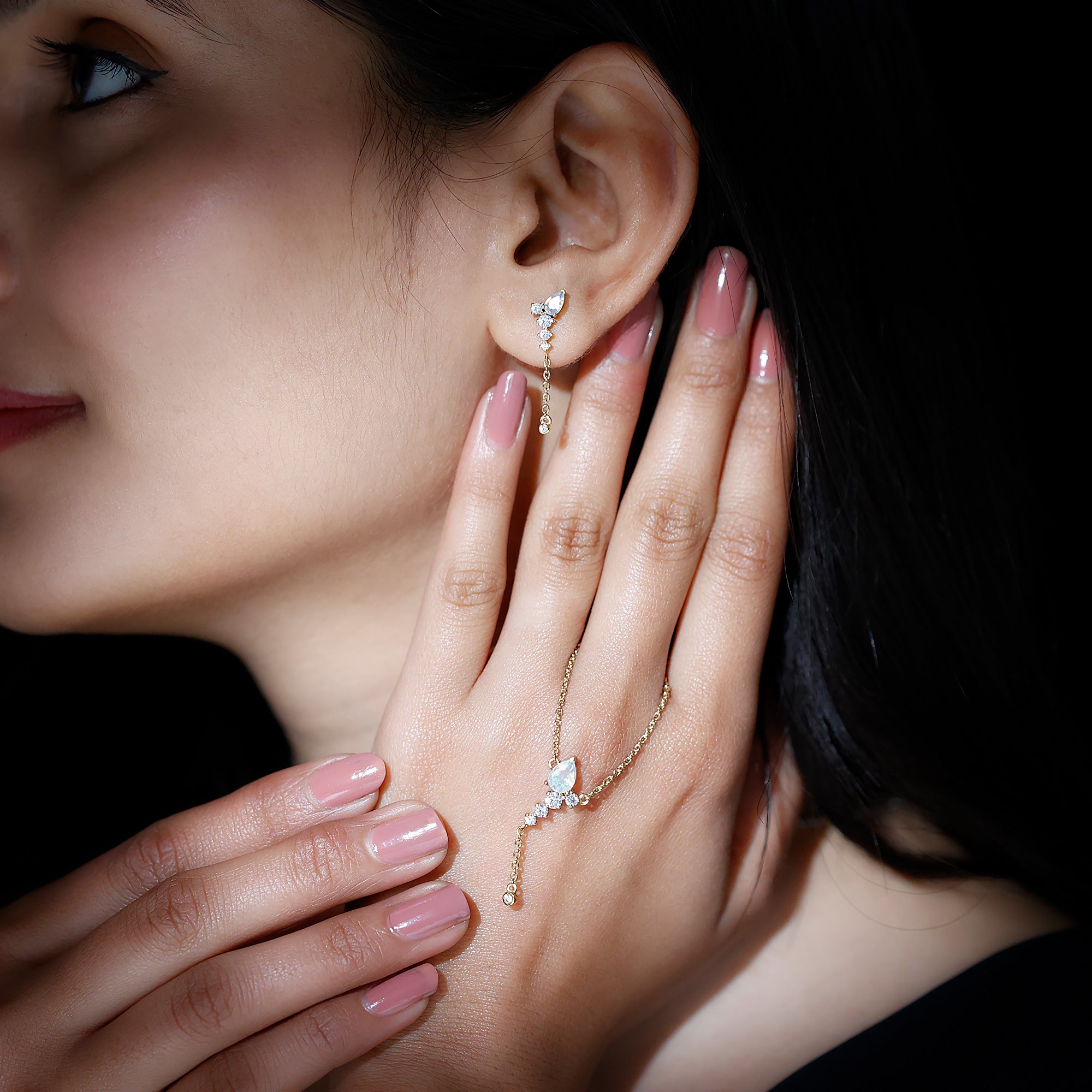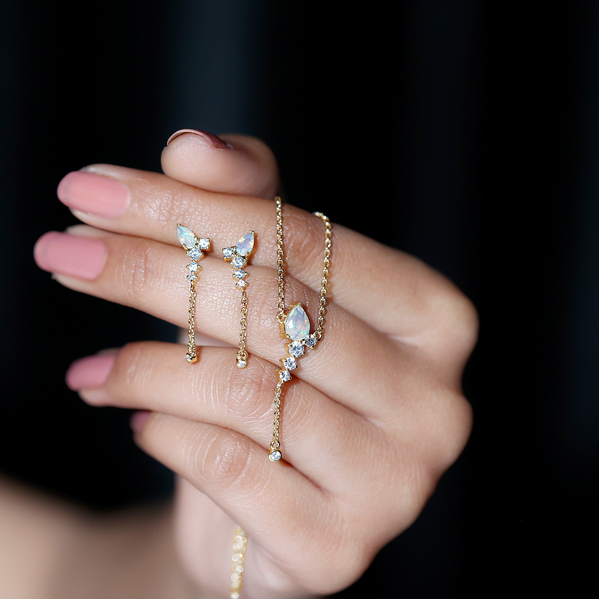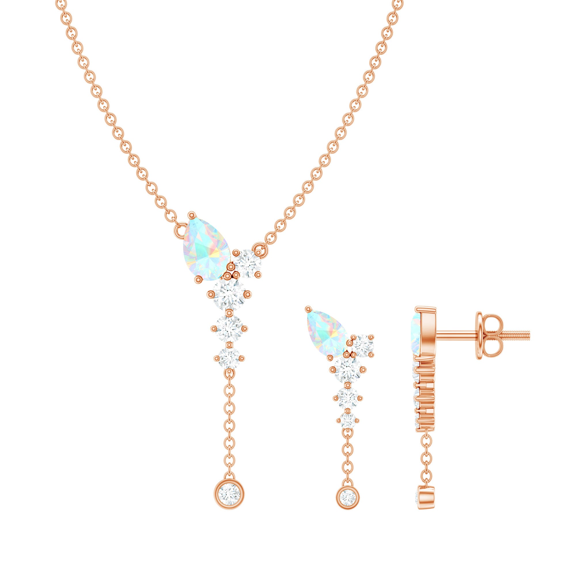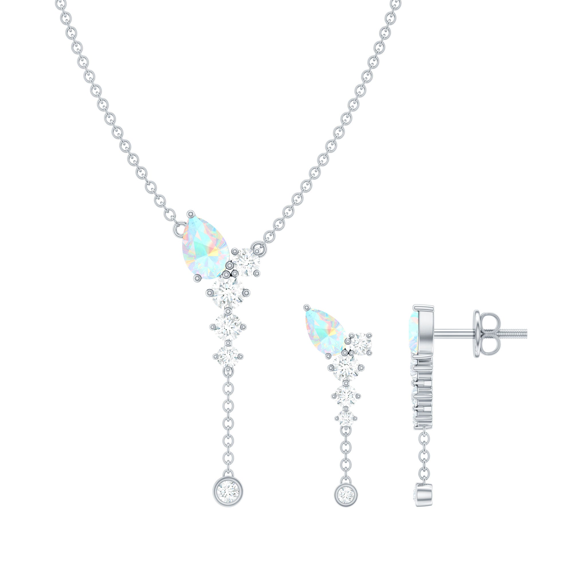 The beautiful Pear Cut Ethiopian Opal in Prong Setting at the top with Moissanite drop with a delicate chain on Jewelry Set sure to leave you stunned. Comes with a matching pair of earrings with a Screw Back closure is perfect to put on your special day. Present this Drop Jewelry Set to your dearest one as a token of love that we are sure she will find super romantic and charming.