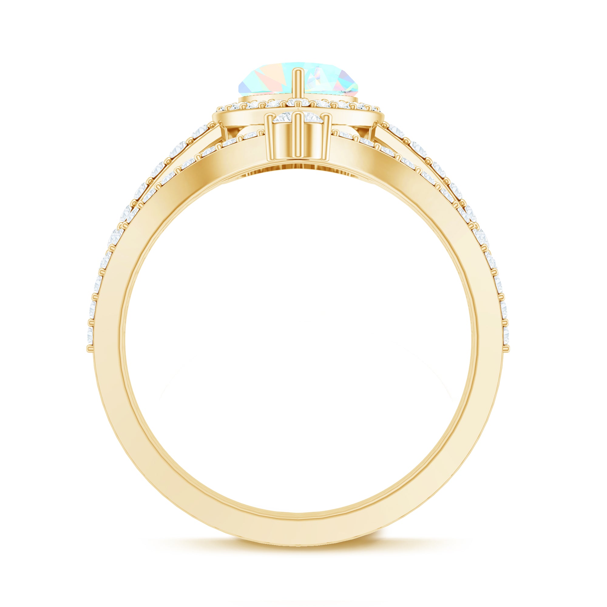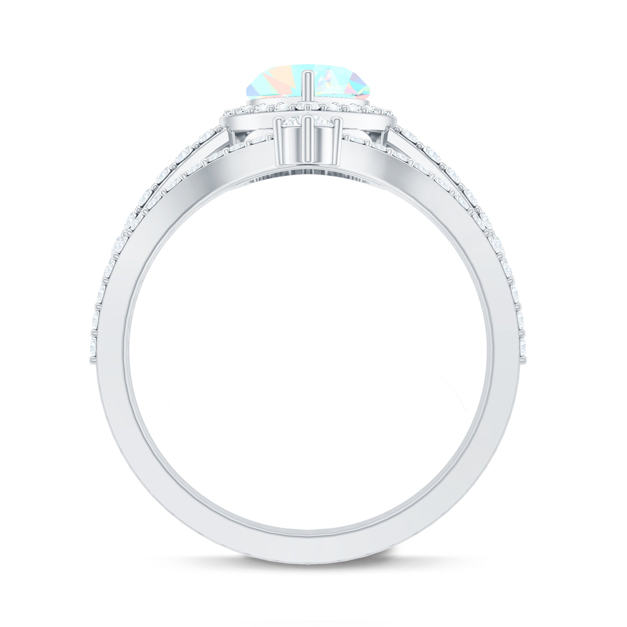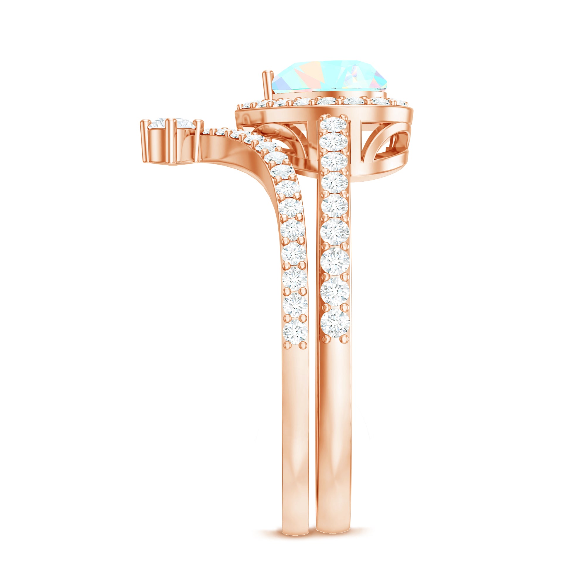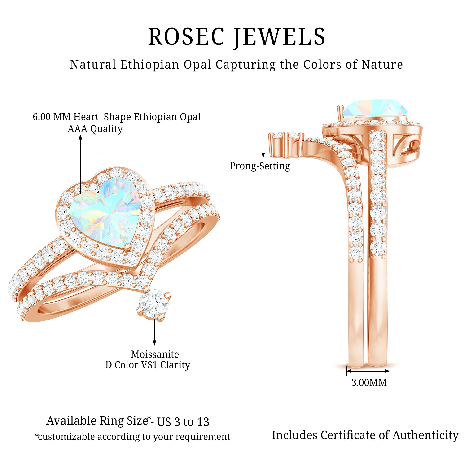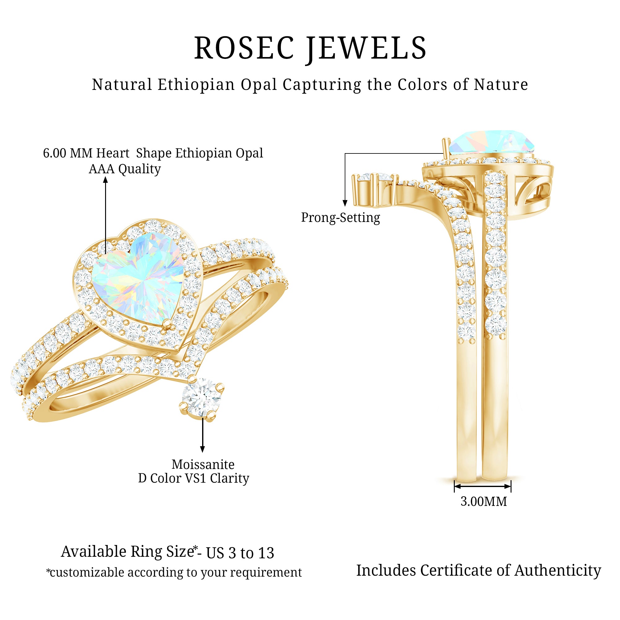 Celebrate love with this Heart Shaped Wedding Ring Set, a dreamy design that captures emotion, color and sparkle in perfect harmony. The Engagement Ring showcases a captivating 6 mm Heart Shape Ethiopian Opal set in Prong Setting, glowing with rainbow hues that shimmer with every movement, symbolizing the vibrant layers of your love story. Encircled by a Halo of Moissanite and complemented by sparkling Side Stones along the band, it is a piece that blends romance with bold elegance. Paired with a matching V Shaped Wedding Band, adorned with round Moissanite stones, creating a perfectly stacked design that feels both modern and timeless. Intricately designed, this Wedding Bridal Ring Set is ideal for the bride who wants her ring to feel as unique and unforgettable as the love it represents. Whether you are planning a heartfelt proposal or searching for the ultimate gift, this Opal Wedding Ring Set comes in various sizes and arrives ready to impress in a signature jewelry box.