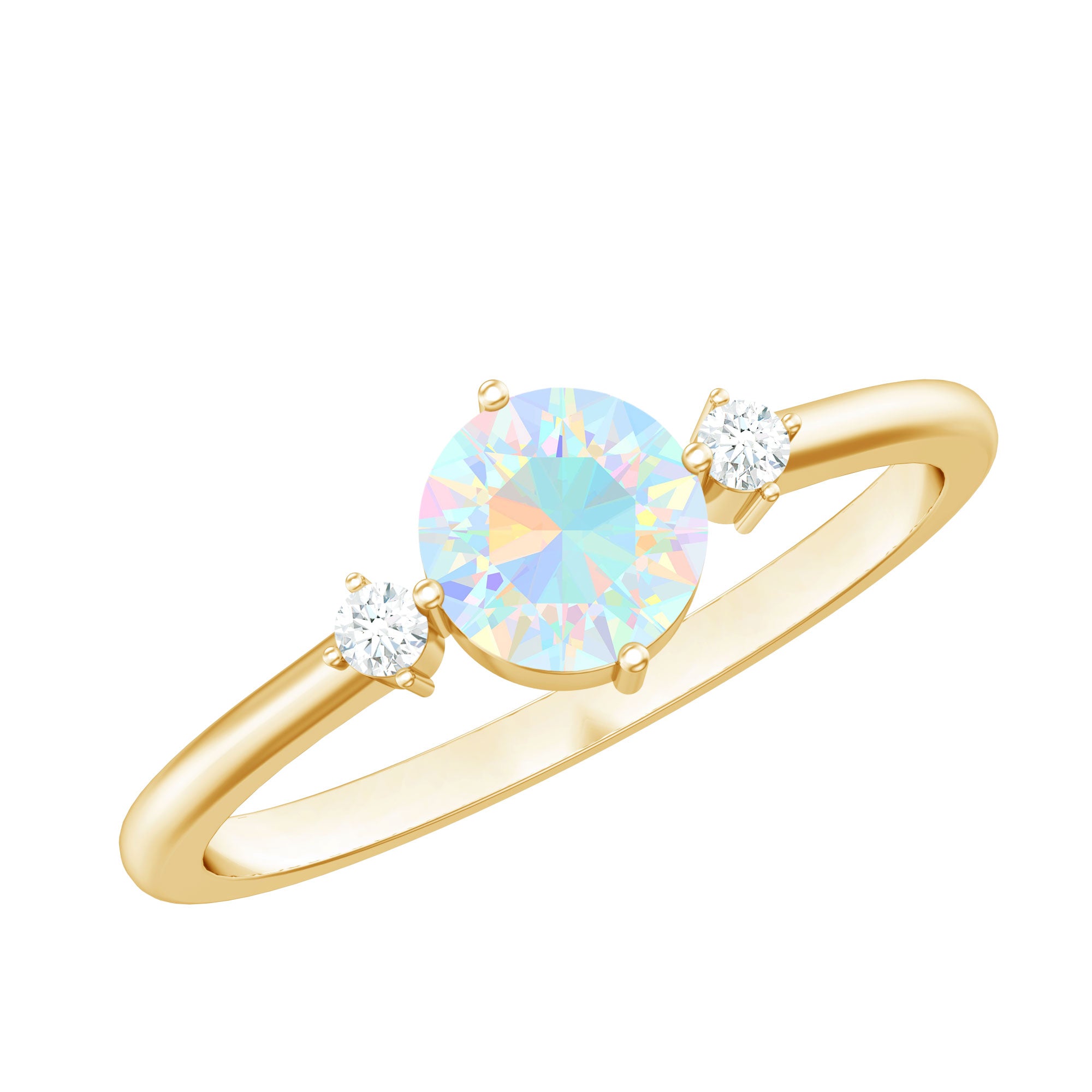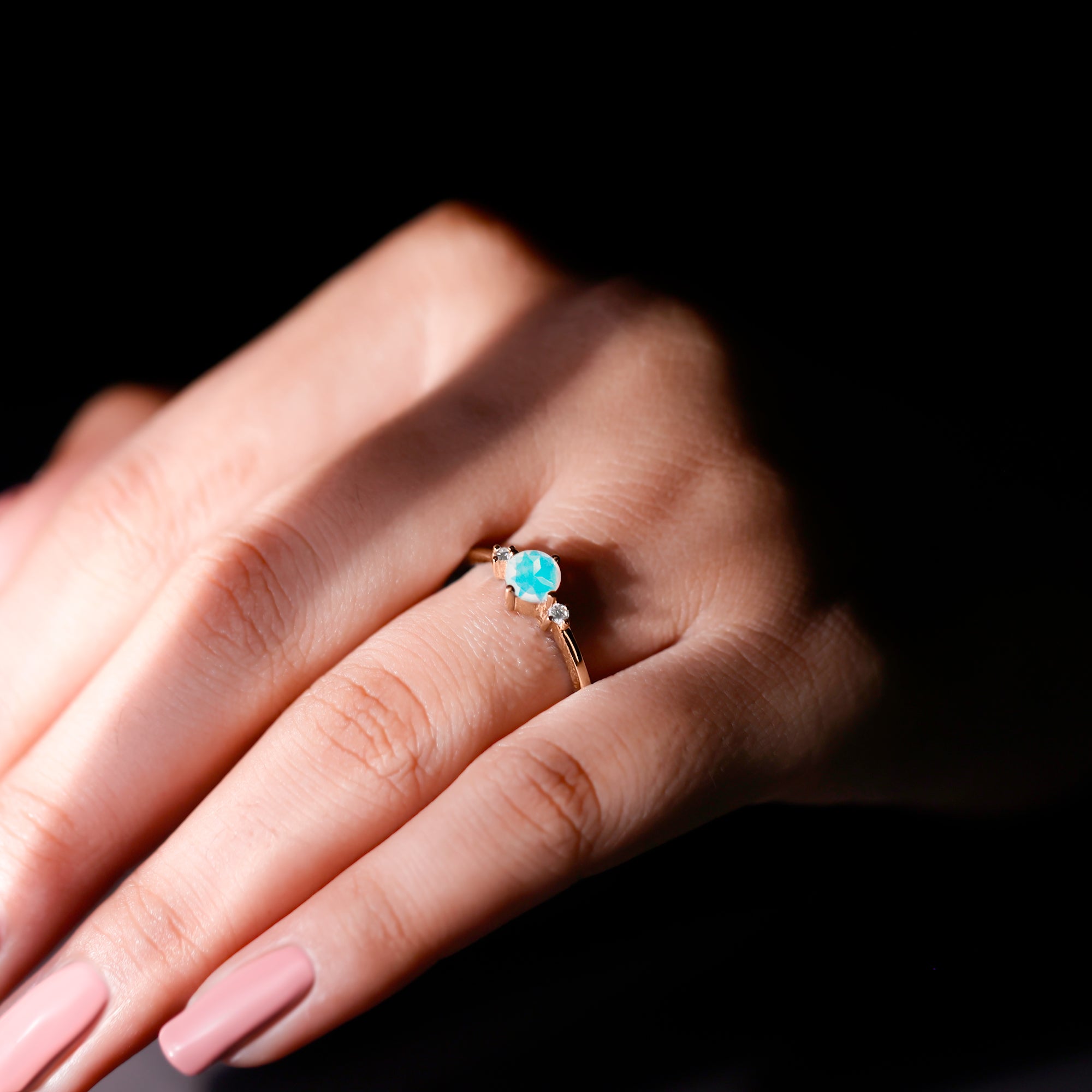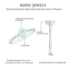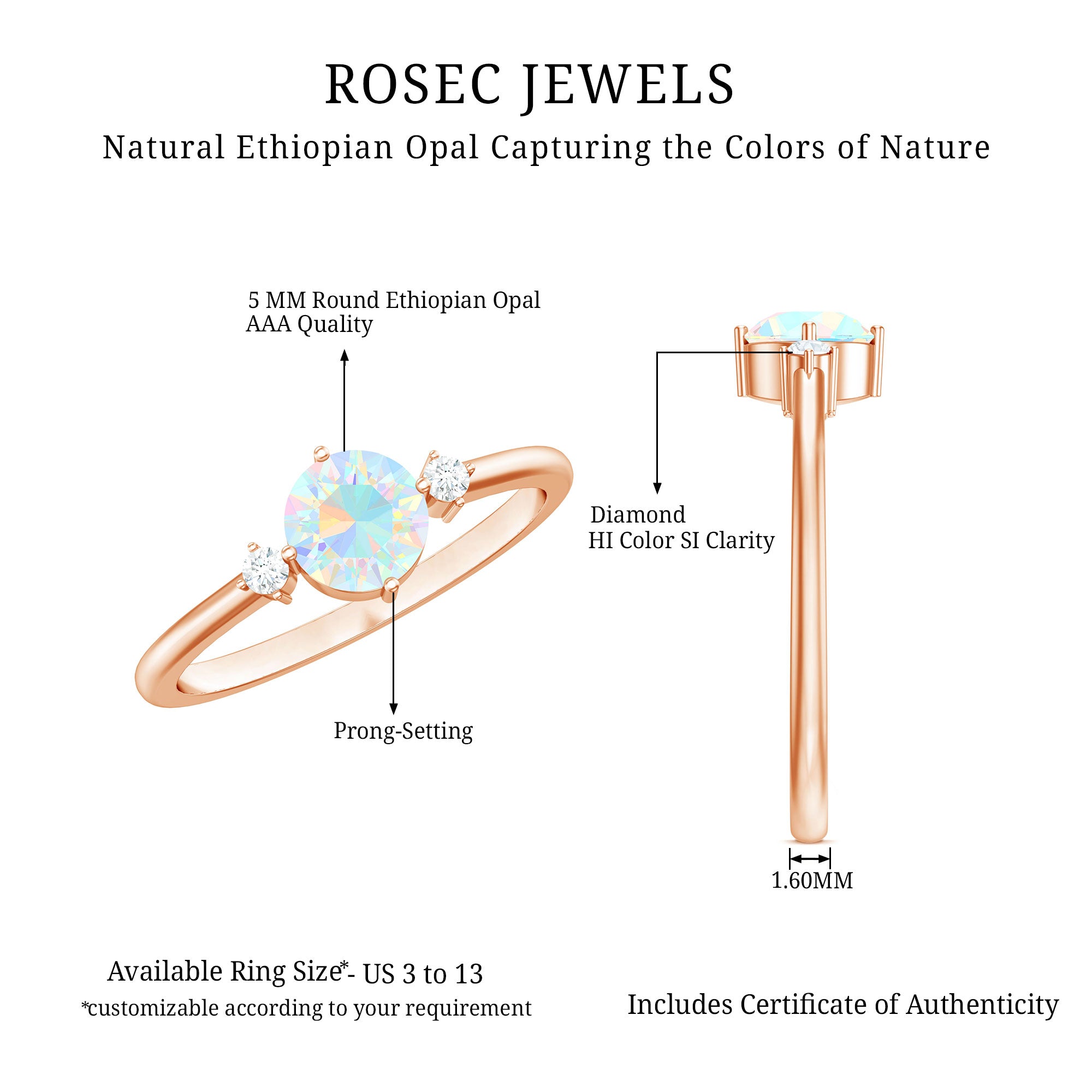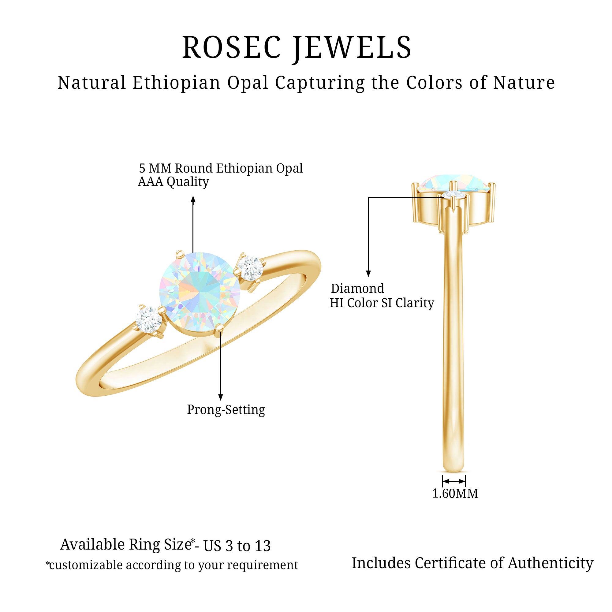 Celebrate love, friendship or a meaningful milestone with this exquisite Ethiopian Opal Promise Ring, a delicate dance of color and sparkle. A vibrant rainbow Ethiopian Opal of size 5 mm bursts with a mesmerizing spectrum of hues, shifting effortlessly from fiery reds to calming blues, making every glance feel like a discovery. Flanking the Opal is a dainty Diamond on either side, small but mighty, adding just the right touch of brilliance and balance to the design. The minimalist Band highlights the natural beauty of the stones, creating a refined yet modern piece perfect for those who appreciate subtle elegance with a splash of magic. Whether you are sealing a promise, marking a special moment or simply treating yourself, this Opal Diamond Ring offers timeless charm wrapped in contemporary style. This Proposal Ring comes ready to gift in a sleek jewelry box and is available in a variety of sizes to ensure a perfect fit. Versatile and endlessly enchanting, this Commitment Ring for Her is a daily reminder of your most treasured bonds and dreams.
