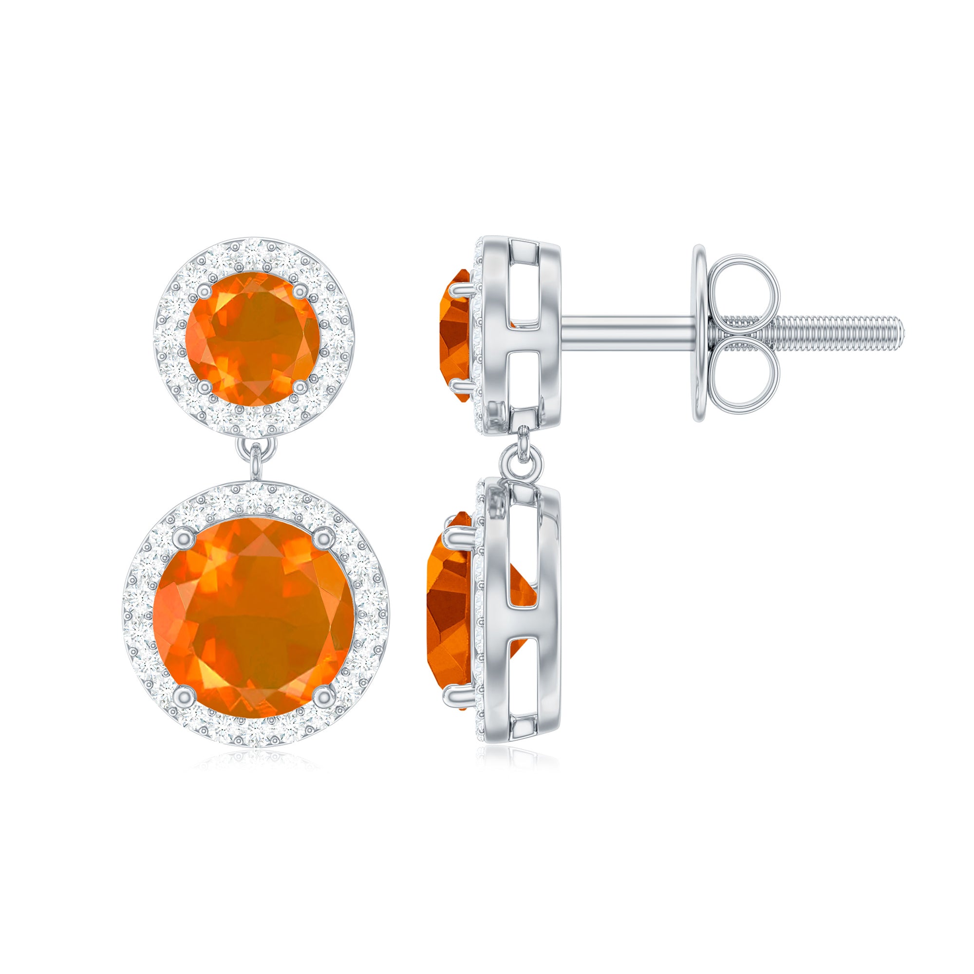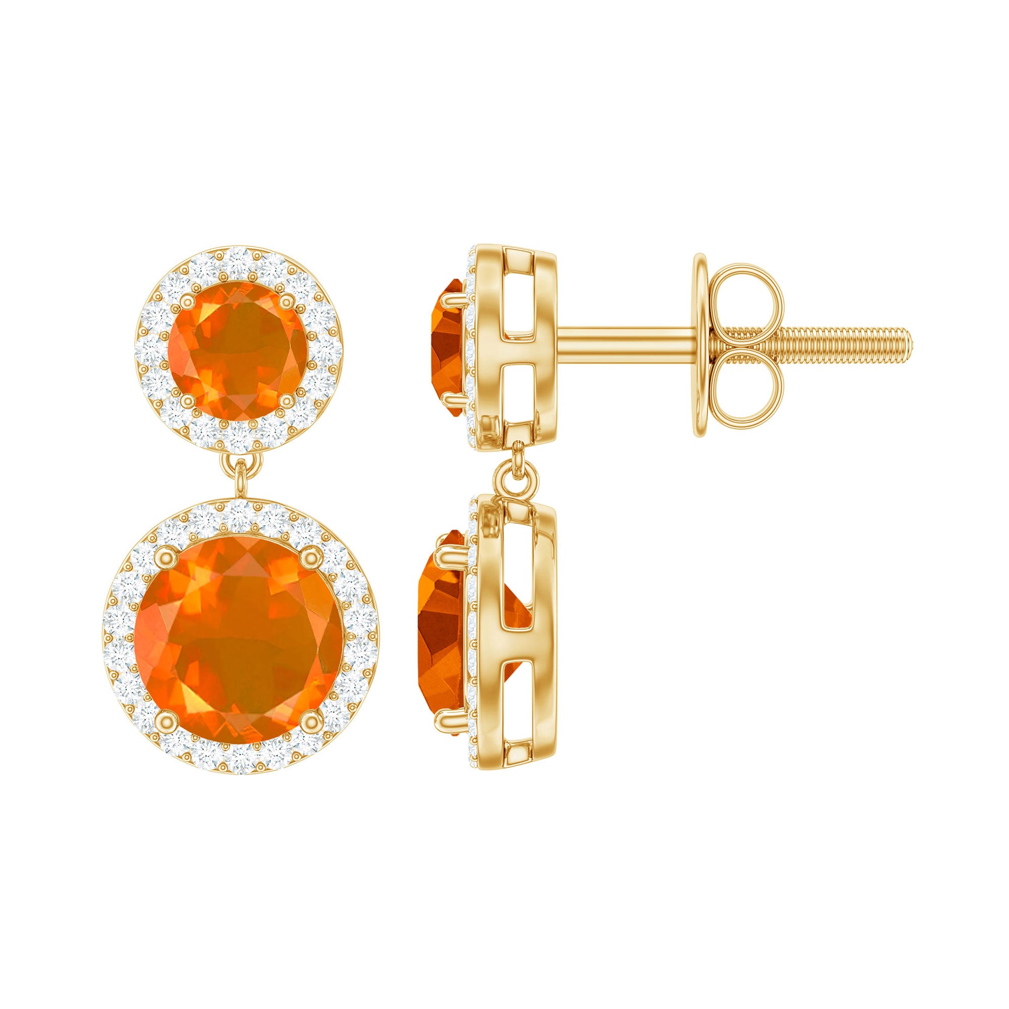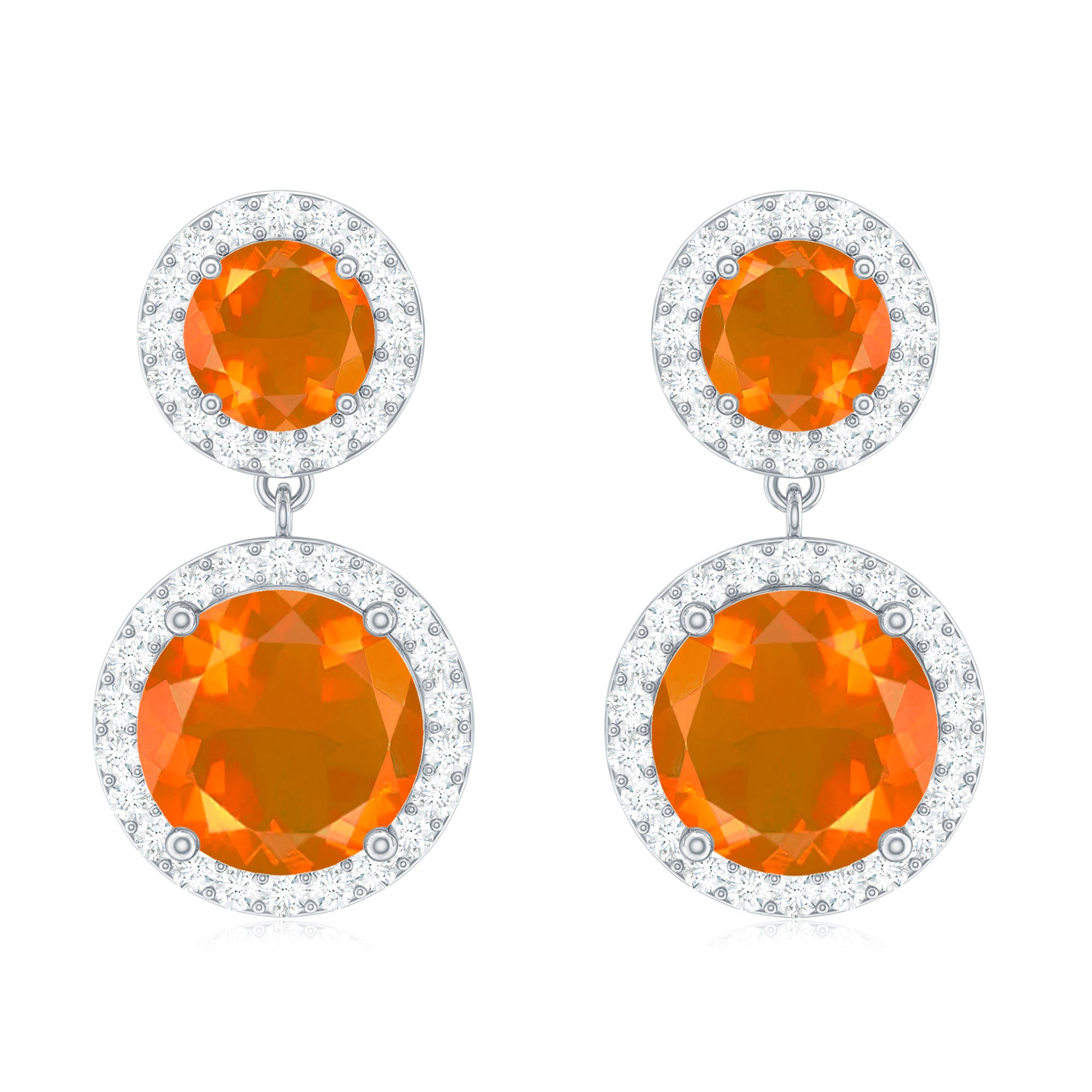 The Halo Dangle Earring is adorned with Round Shape Fire Opal and Diamond. This Fire Opal Dangle Earring will be a perfect piece for your wife on your Anniversary.