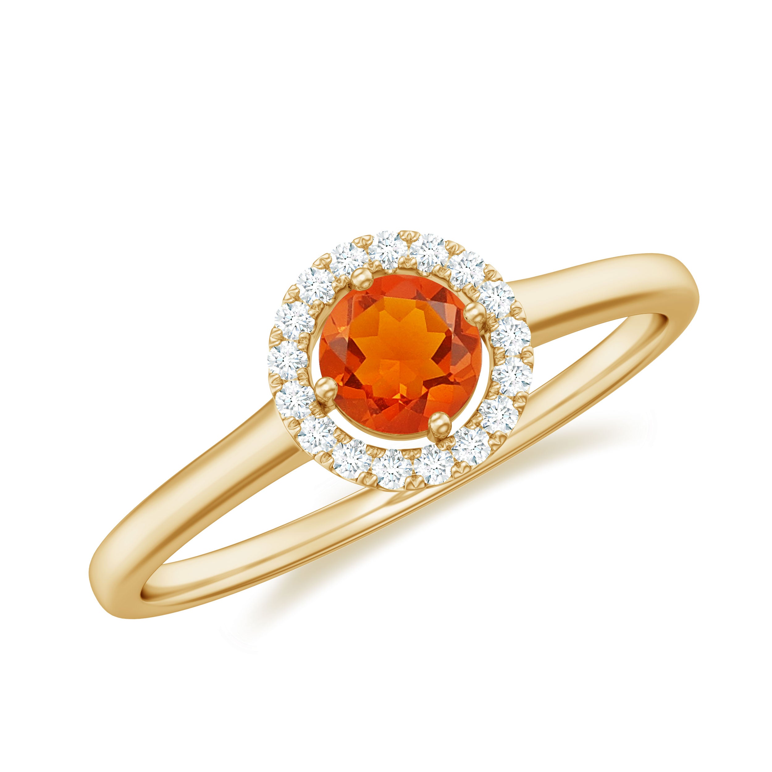 This engagement ring showcases a Round Shape fire opal in a diagonal prong setting, surrounded by a floating halo of Round Shape Diamond stones. A symbol of eternal love, this fire opal and Diamond ring is the perfect way to celebrate your commitment to the special woman in your life.