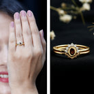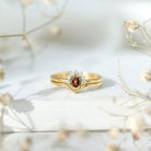This Garnet Engagement Ring Set is perfect for brides who love timeless elegance with a modern twist. Handcrafted in 14K yellow gold plated silver, this set features a 3X4 MM oval shaped Garnet as the center stone securely set in bezel setting. A delicate half halo of lab grown round diamonds gently hugs the Garnet, adding just the right amount of sparkle. Paired with a stylish ring guard, the enhancer creates a perfectly layered look that feels effortlessly elegant and thoughtfully designed. This Garnet Bridal Ring Set is ideal for women who appreciate refined details but want something a little different. Whether worn every day or saved for special occasions, it speaks to a quiet confidence and a deep, lasting love. Garnet is also the birthstone for January, making it a thoughtful gift for a January-born bride or a meaningful piece for anyone drawn to the richness of its color. Carefully crafted with love and precision, this Promise Engagement and Wedding Ring Set comes with a gemstone certificate and is beautifully packaged in our signature jewelry box, ready for gifting or cherishing forever. From that special YES to I DO moment, let this Garnet and Diamond Ring Set be a part of your love story.