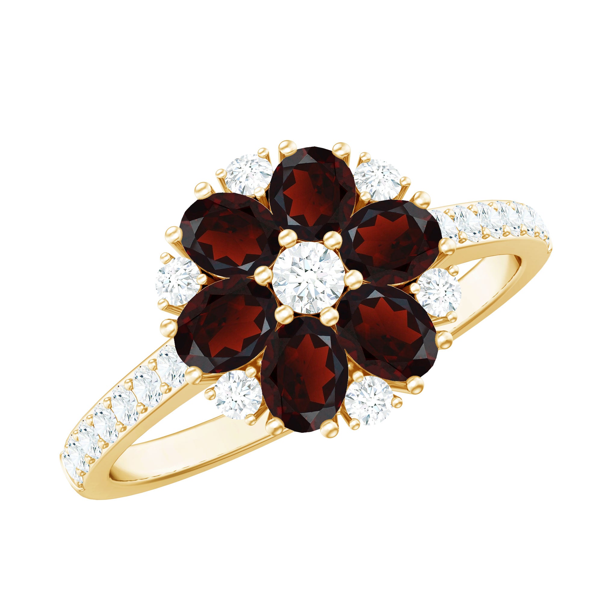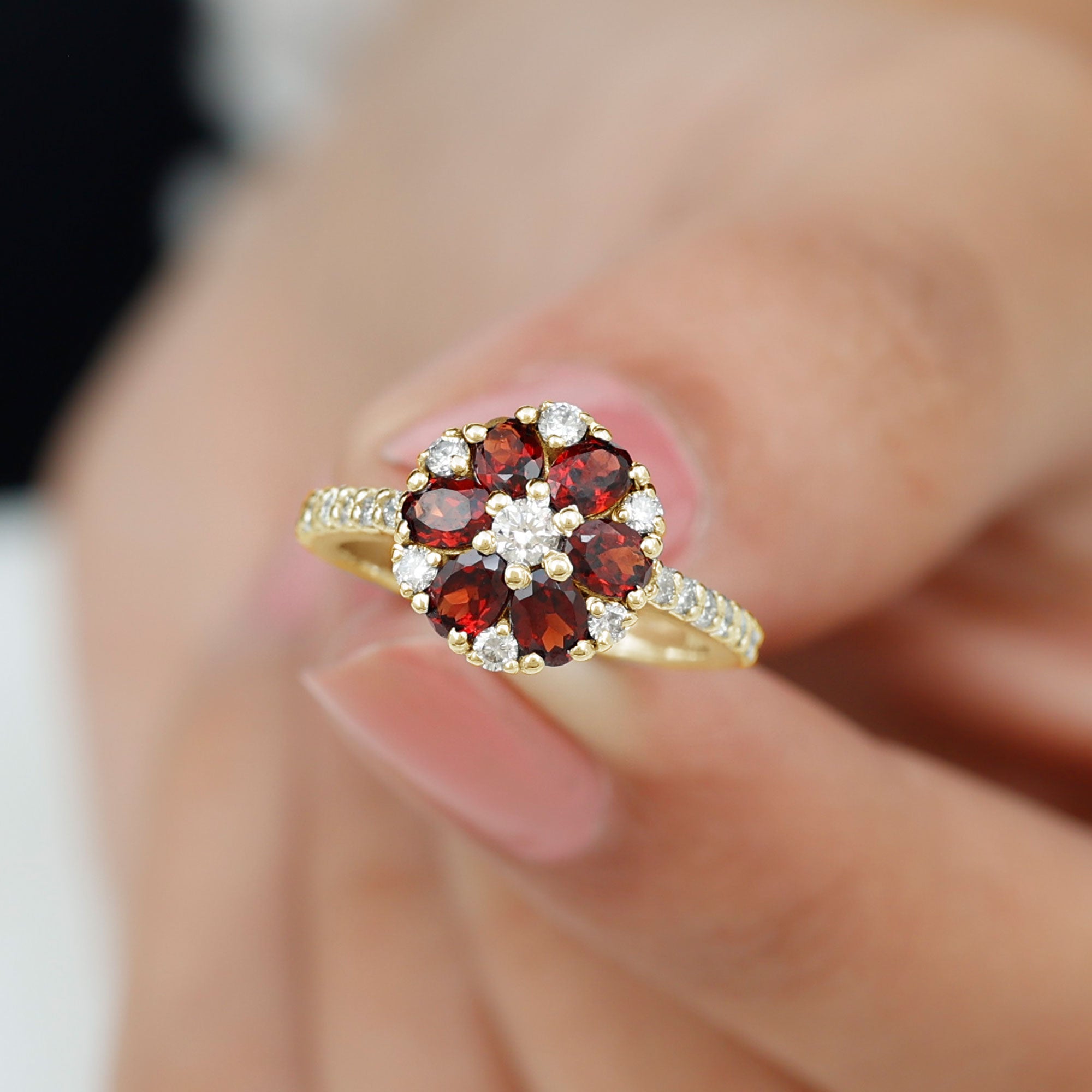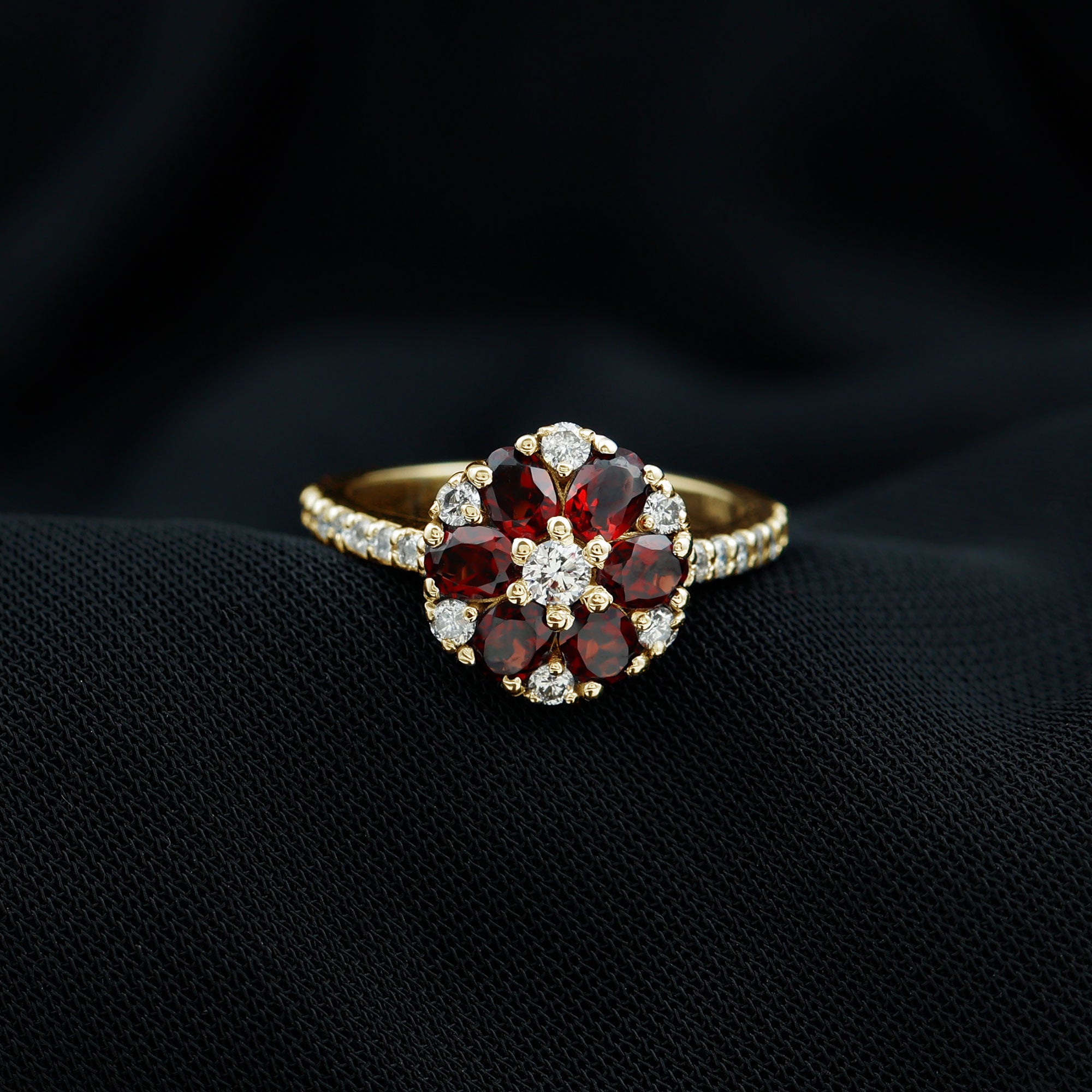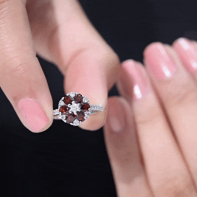 Blossom into forever with this enchanting Flower Engagement Ring, a beautiful symbol of the natural elegance of love. The vibrant 3X5 mm Oval Shape Garnet stones set in Prong Setting are arranged to form a delicate flower, their rich red hue capturing the essence of passion and devotion. Surrounding the petals are dainty Diamond stones, adding a soft sparkle that enhances the timeless beauty of this Cluster Engagement Ring. The band, also adorned with shimmering Diamond stones, gracefully complements the flower design, creating a perfect balance between boldness and subtlety. This stunning Garnet Engagement Ring is a celebration of love in full bloom, a promise of devotion, beauty and a lifetime of cherished moments. Whether for a proposal or a special milestone, this Garnet Diamond Ring is a thoughtful way to express your eternal commitment. Presented in a signature jewelry box and available in various US ring sizes, this Statement Ring is ready to slip onto the finger of someone you adore. Romantic and truly unique, this Garnet Flower Ring will always remind you both of the love that continues to blossom and grow.