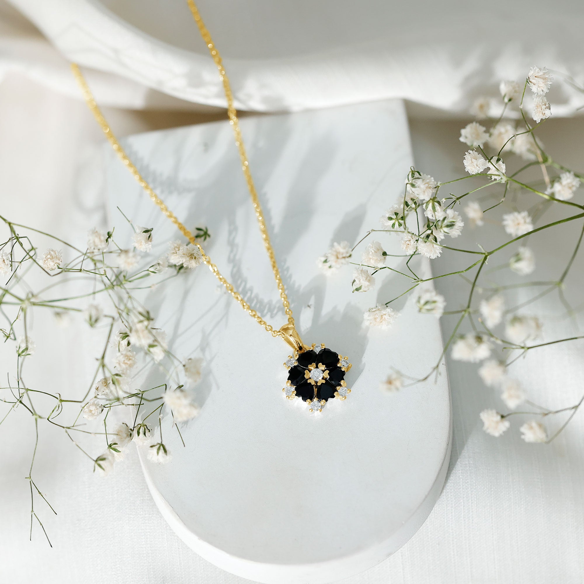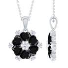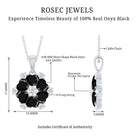 This exquisite Black Onyx Necklace beautifully blends classic elegance with modern charm. Crafted with heart shaped black onyx stones of AAA quality arranged in a floral pattern, each petal is perfectly set in secure prong setting. The deep black onyx stones create a striking contrast against the sparkling D-VS1 quality round moissanite accents that sit delicately between each petal, adding dazzling brilliance and enhancing the pendants overall allure. The Flower Pendant Necklace hangs gracefully from a sleek cable chain via a polished bail, completing the look with a touch of sophistication. This Black and White Necklace is a versatile piece that effortlessly complements any outfit, making it perfect for both everyday wear and special occasions. Its unique design symbolizes love and beauty, making it a meaningful gift for someone special or a treasured addition to your own jewelry collection. Whether dressed up for an elegant evening or worn casually, this Heart Shaped Necklace captures attention and admiration, blending timeless style with a touch of contemporary flair.