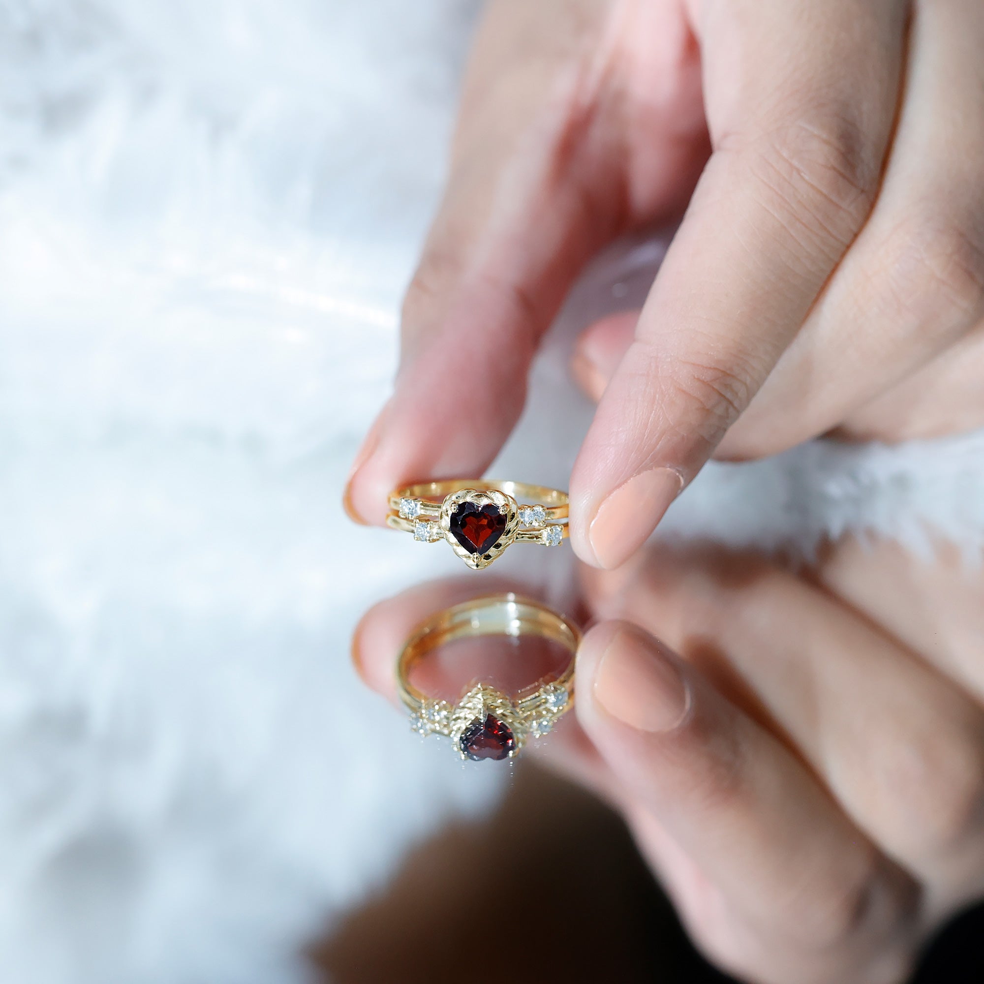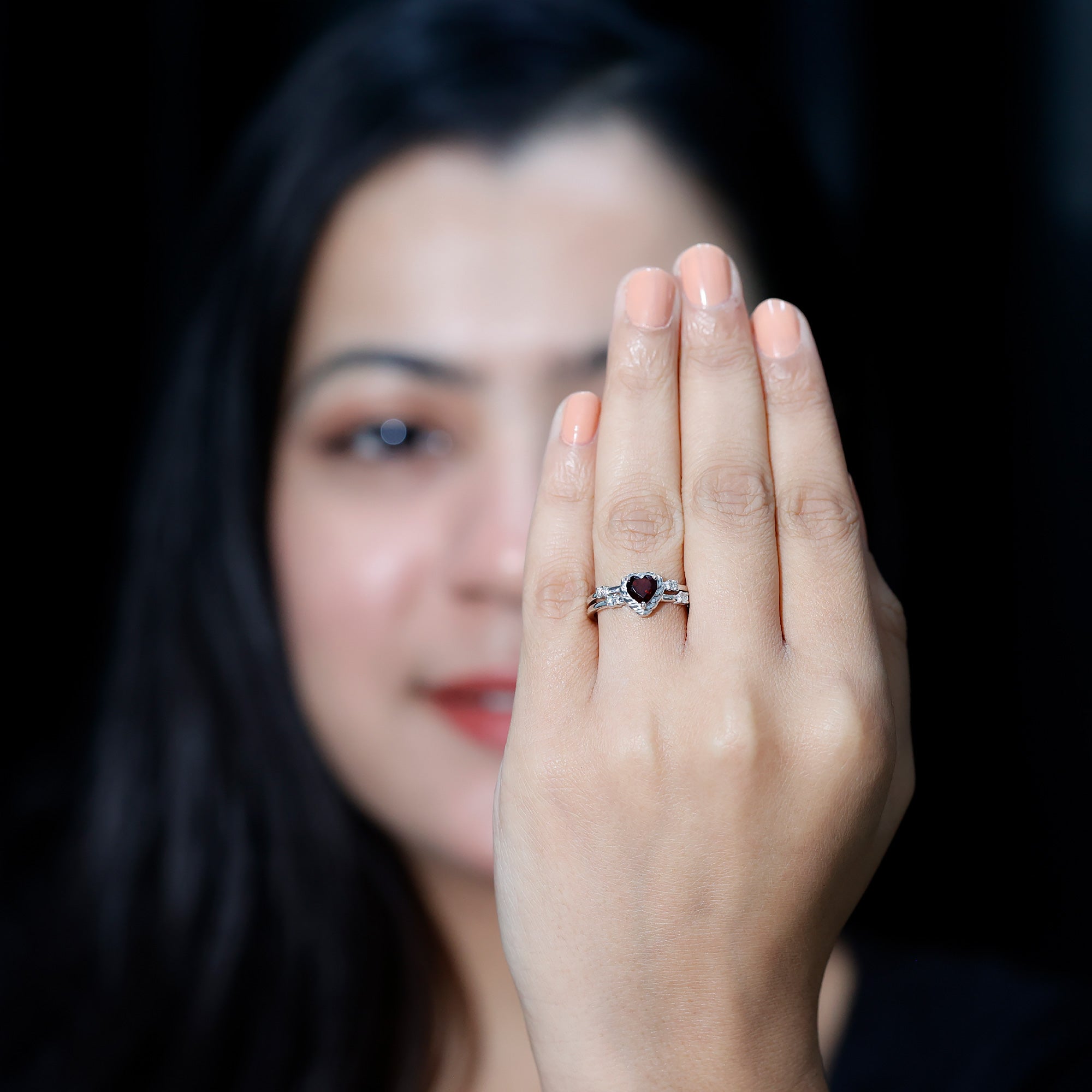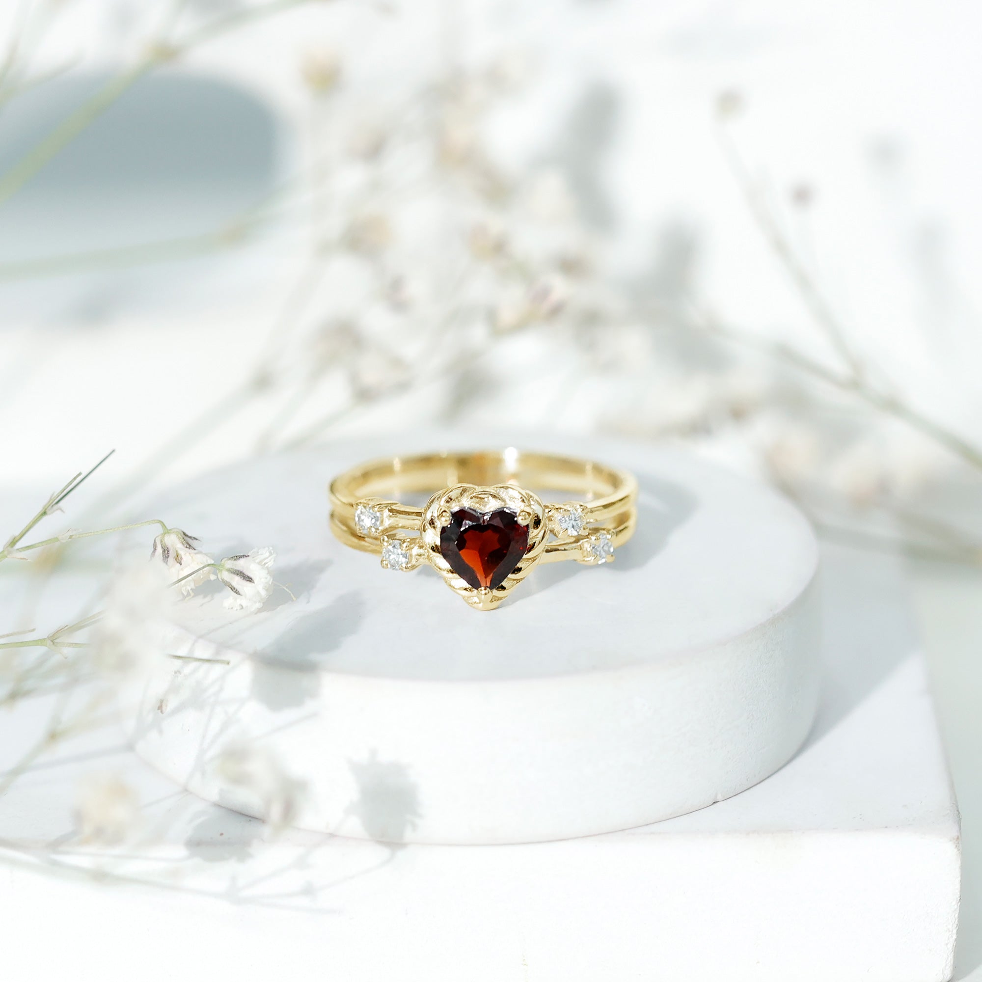 Natural Heart Shaped Garnet Diamond Double Band Engagement Ring