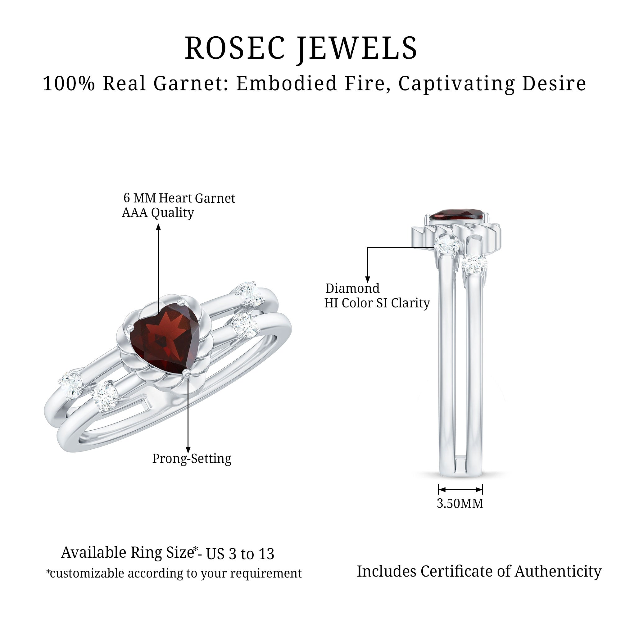 An emblem of everlasting love, this Heart Shaped Engagement Ring is the perfect symbol of your deep affection. At its center, a stunning 6 mm Heart Shape Garnet is set in Prong Setting with a unique design, representing the passion and warmth you share. The centerpiece is accentuated by dainty Diamond stones that enhance the romantic charm of the Garnet Engagement Ring. The Double Band design offers a modern twist on a classic engagement ring, providing a unique and bold look while still being incredibly elegant. The bands, adorned with delicate HI-SI Diamond stones, embrace the AAA Quality Garnet center stone in a beautiful display of unity and commitment. Whether you are proposing or celebrating a meaningful milestone, this Double Band Engagement Ring is an unforgettable way to express eternal love. Presented in a signature jewelry box and available in various US ring sizes, this Garnet Diamond Ring is ready to be the perfect fit for your loved one. Romantic, timeless and full of heart, this Garnet Heart Ring captures the essence of a love that will last a lifetime.