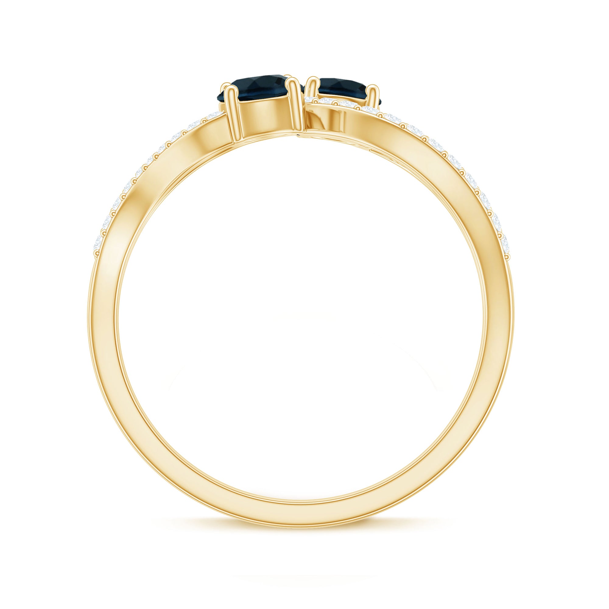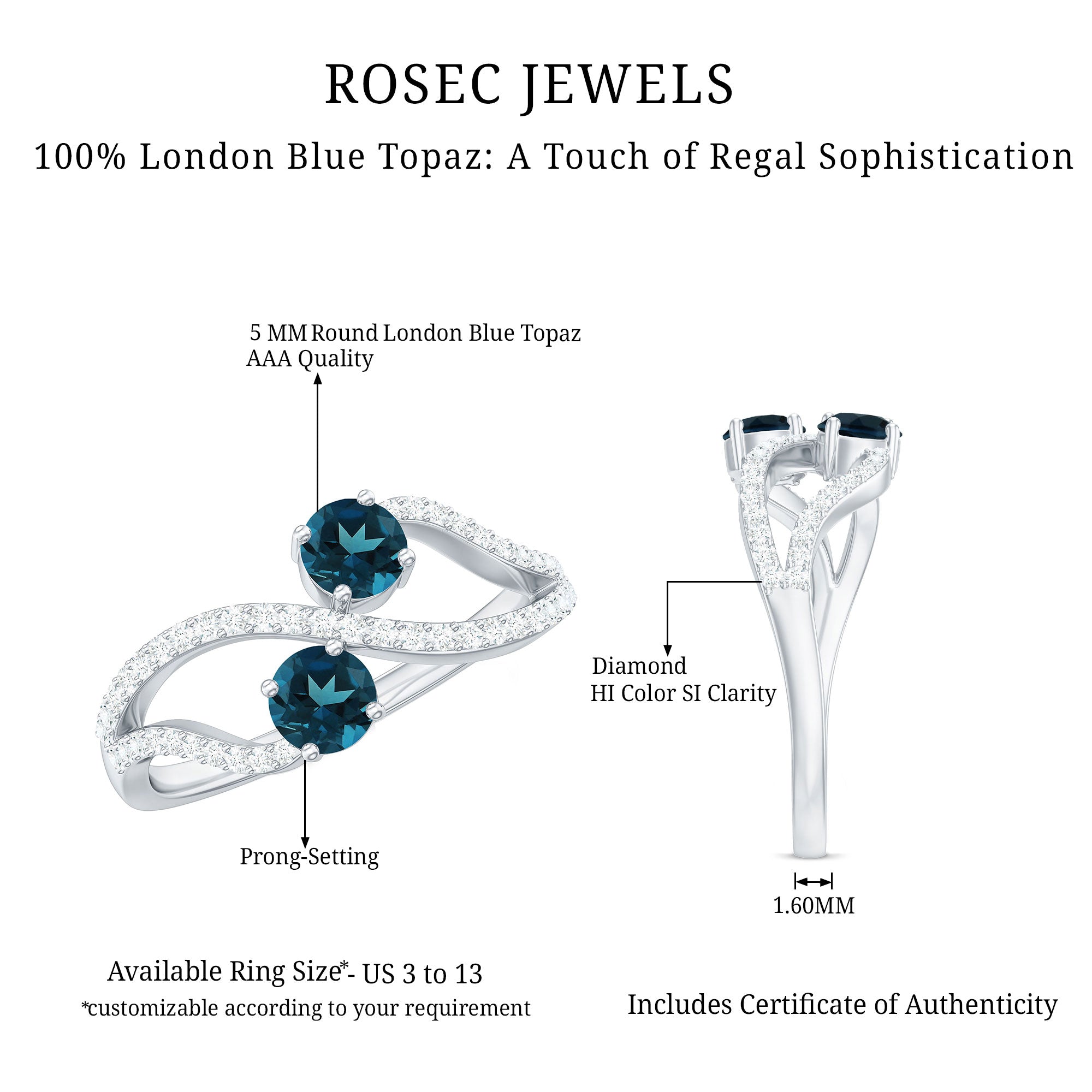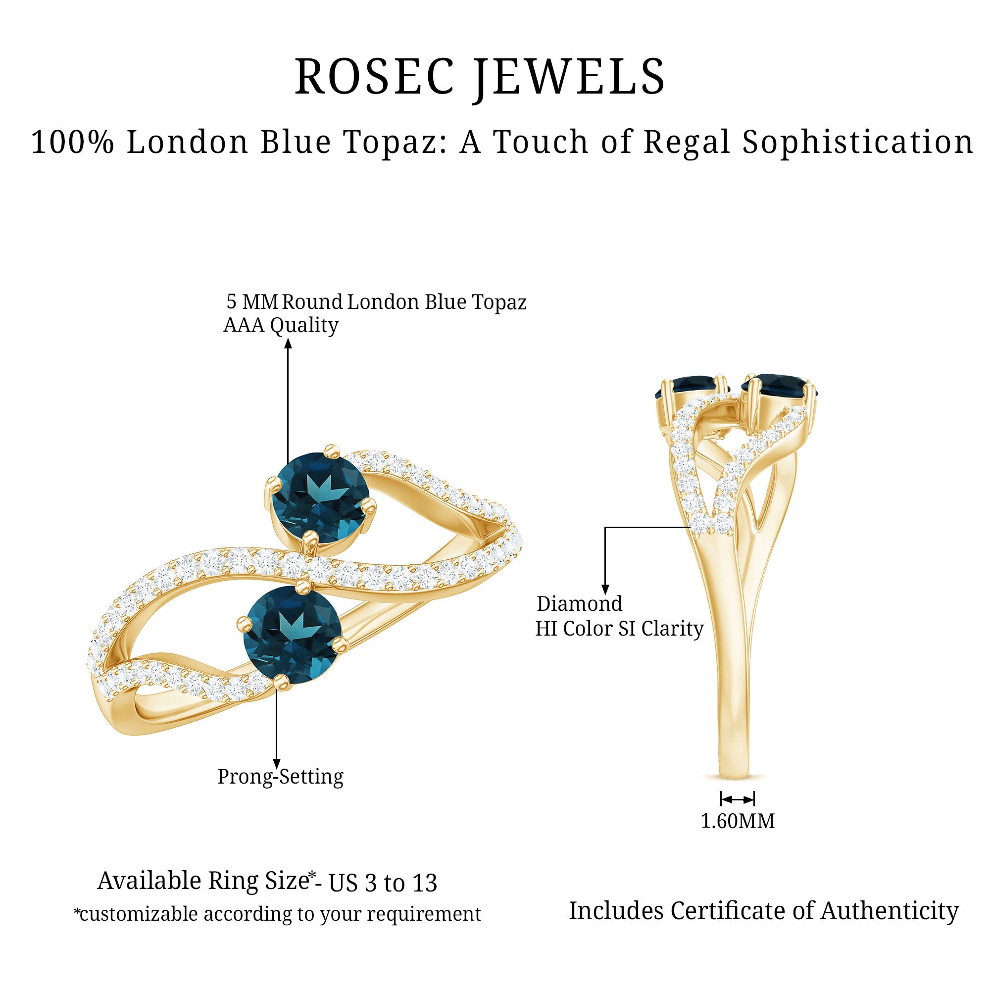 When two hearts illuminate one another, the result is a ring that is both significant and exquisite. This Toi et Moi Ring tells a love story through its unique two-stone design. It features a 5 MM round shape London Blue Topaz, elegantly set in prong setting to accentuate their remarkable brilliance. Together, they represent two individuals with distinct journeys and characteristics coming together in perfect harmony. Enhancing its charm, the band gracefully flows in a bypass style, embellished with small round diamond stones that add just the right amount of extra sparkle. The design of the band not only adds elegance but also subtly directs attention towards the stunning center stones. Carefully crafted for both comfort and aesthetics, this Bypass Promise Ring is ideal for everyday wear as well as special occasions. It embodies a message of love, balance, and unity, making it a thoughtful choice for a proposal, a significant gift, or a romantic gesture. With its brilliant stones and meaningful design, this London Blue Topaz Ring merges contemporary beauty with emotional significance in one stunning piece. It comes in a lovely jewelry box, ready to celebrate a special moment in your love story. A symbol of you and me, this Proposal Ring acts as a lasting reminder of love.