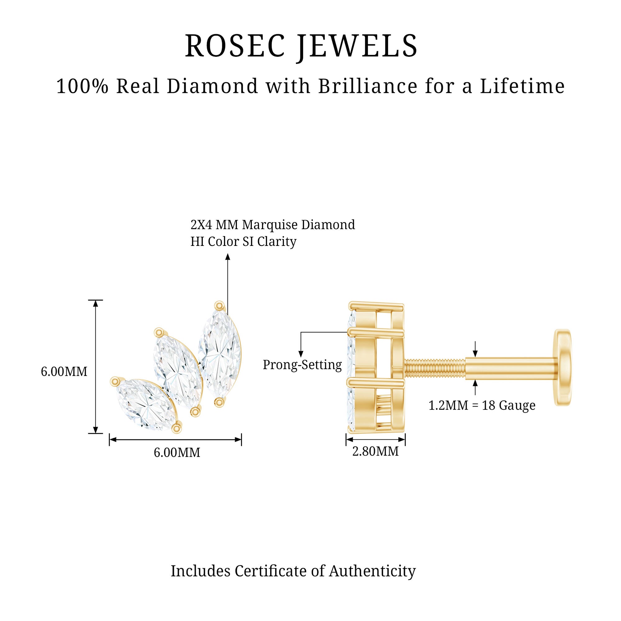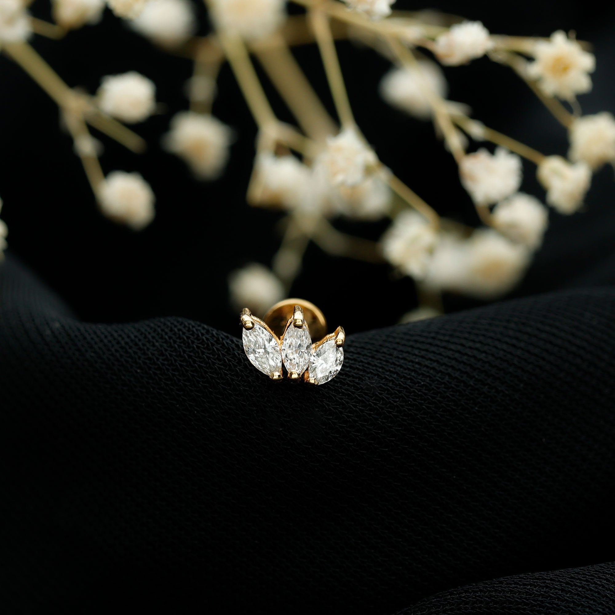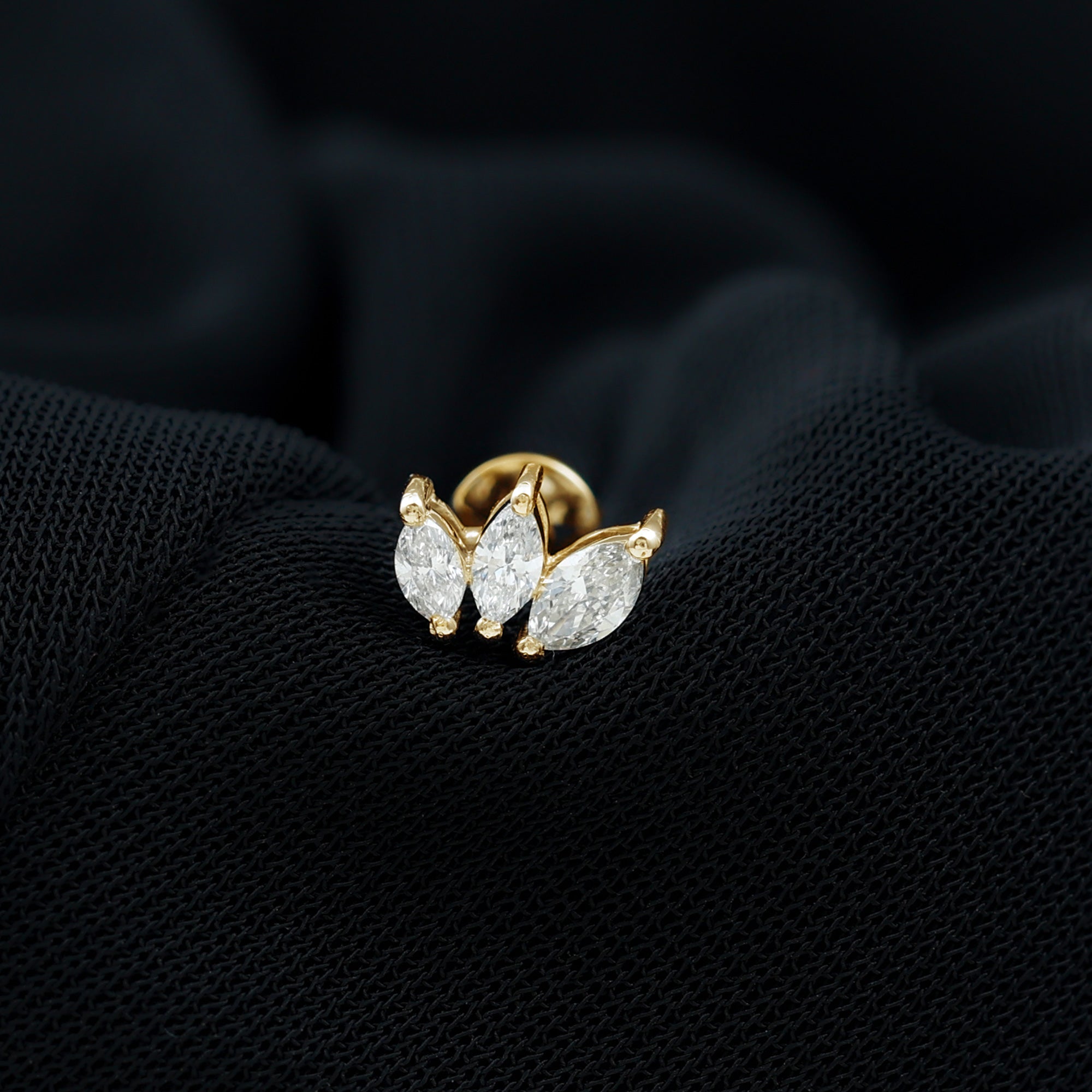 Elevate your ear game with the Diamond Helix Earring, a sleek and modern accessory designed to bring sparkle to your look. This striking piece features three marquise cut diamonds, expertly arranged in a captivating design and set in prong setting. Designed for maximum styling flexibility, this Three Stone Earring can be worn on multiple piercings, including the helix, cartilage, tragus, conch, or upper lobe. Its versatile design allows you to mix and match with other earrings, creating personalized combinations or statement ear stacks that reflect your unique style. The flat back closure ensures a secure and comfortable fit, keeping the Marquise Diamond Earring perfectly in place without irritation, ideal for all-day wear or special occasions. Crafted with precision and attention to detail, the Diamond Ear Piercing Earring combines elegance and contemporary flair in one compact piece. Whether you are looking to add a subtle sparkle to your everyday ensemble or want a standout piece for nights out, this piece delivers style, sophistication, and versatility.