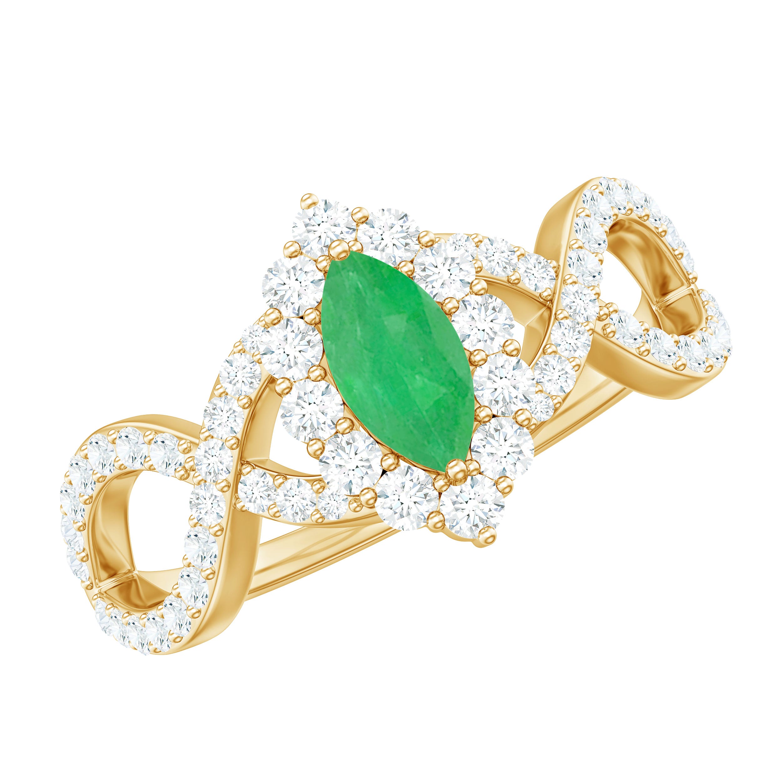 Natural Marquise Emerald Diamond Halo Engagement Ring with Crossover Shank