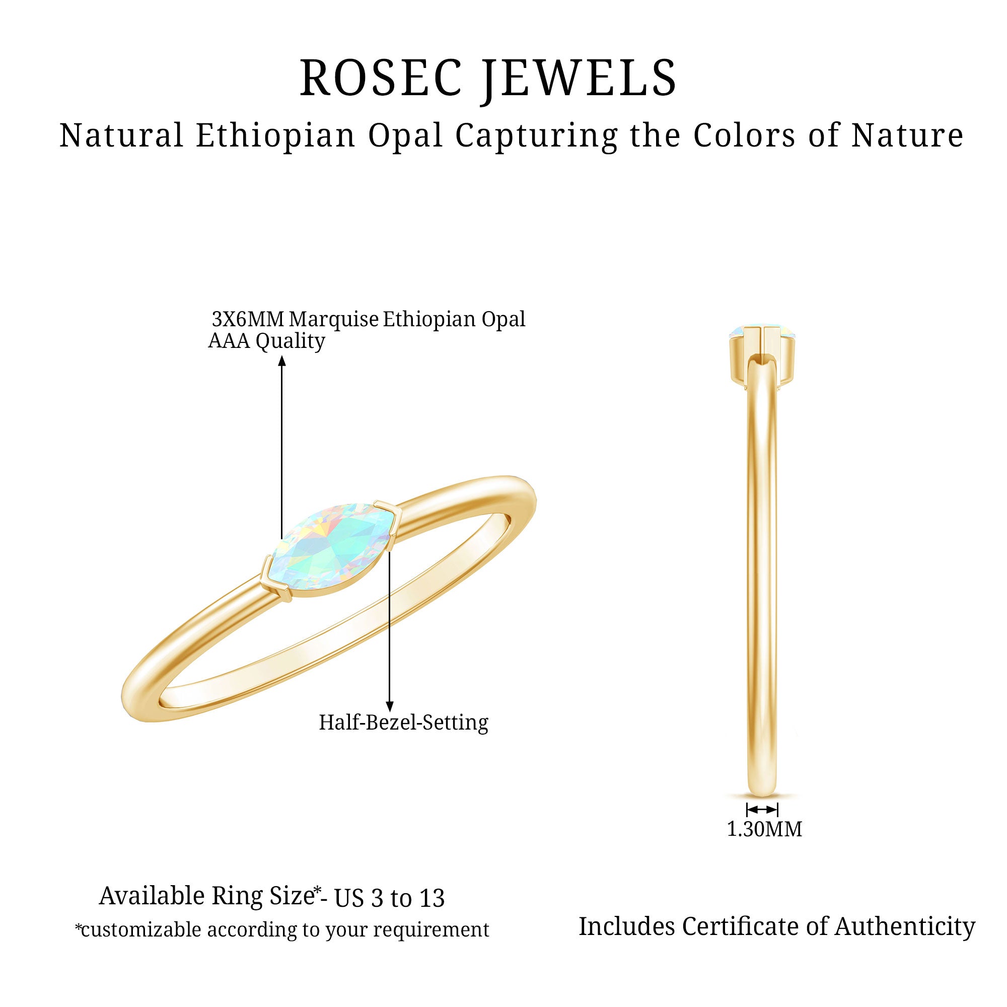 Bold meets ethereal in this Opal Promise Ring, styled in a sleek East-West style for a modern twist on timeless romance. The 4X8 mm Marquise Shape Ethiopian Opal in Half Bezel Setting glows with a mesmerizing play-of-color with every movement, capturing the magic of your connection. Set horizontally across the band, the East-West style gives this Ethiopian Opal Ring a fashion-forward edge, while the dreamy and iridescent beauty of the Opal keeps it soft and romantic. Perfect for a promise, a milestone or any special moment, this Pinky Promise Ring is a statement of love that is both meaningful and unique. Whether worn solo or stacked, it adds a pop of color and personality to any look. Available in multiple sizes, this Rainbow Opal Ring arrives in a luxurious jewelry box, ready to gift or keep close. This Opal Proposal Ring is a little piece of magic, made to shine with every chapter of your love story.