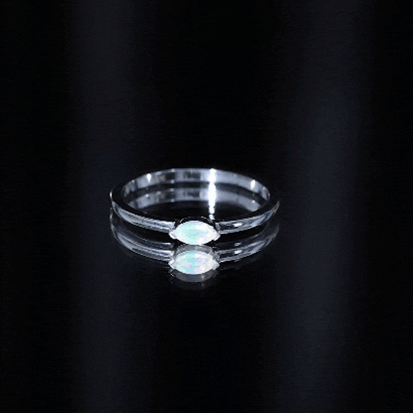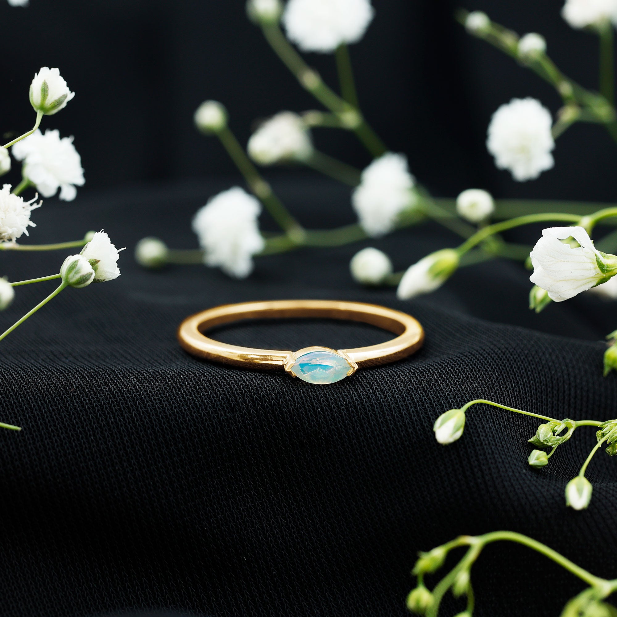 This natural marquise Ethiopian rainbow opal promise ring presents a fresh interpretation of a meaningful gesture. The elongated marquise stone is set in an east west orientation, creating a contemporary silhouette that feels refined yet distinctive.