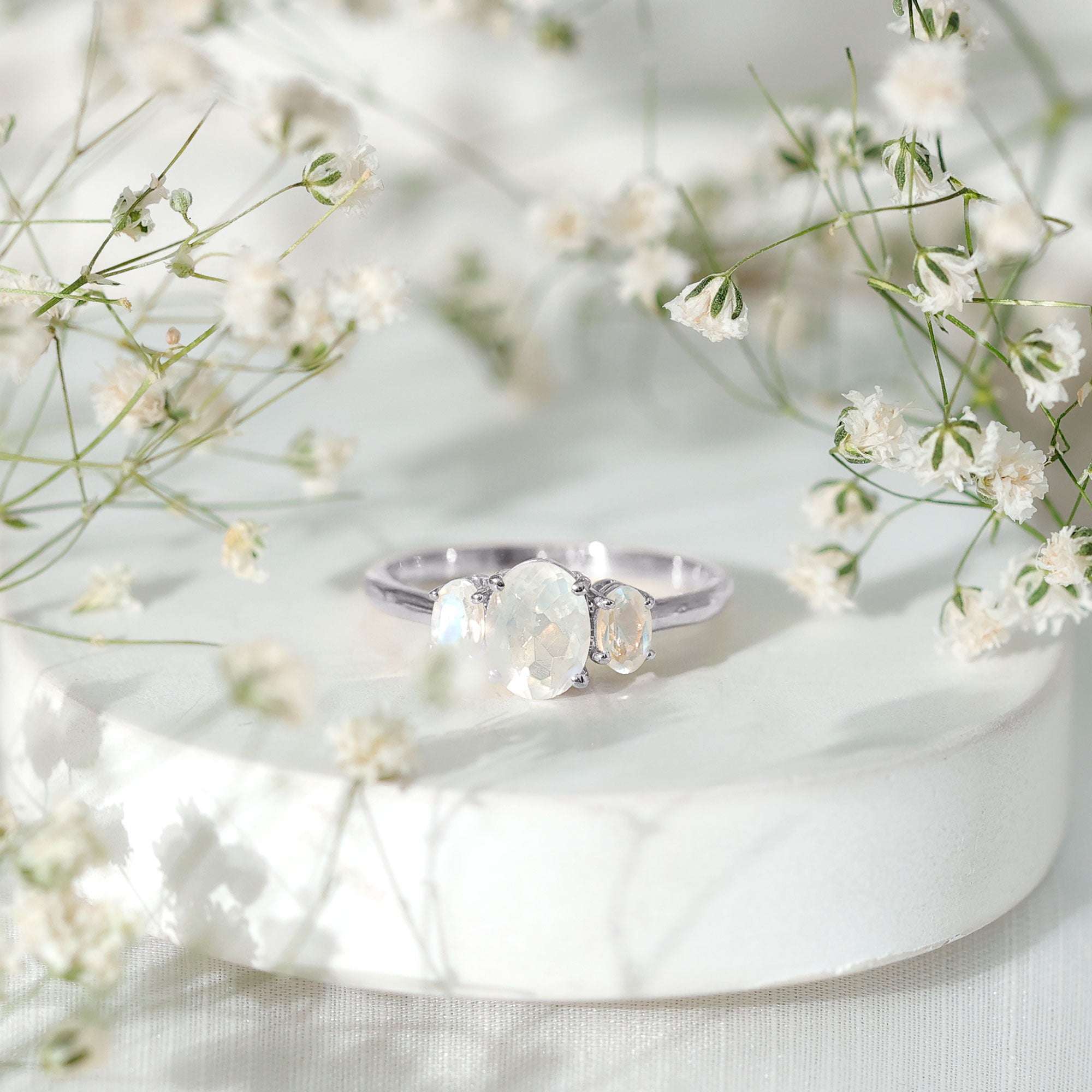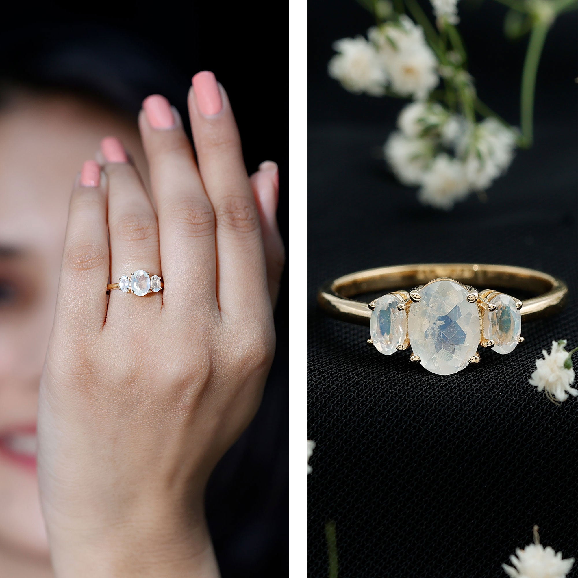 FAQs About: Natural Moonstone Three Stone Oval Engagement Ring