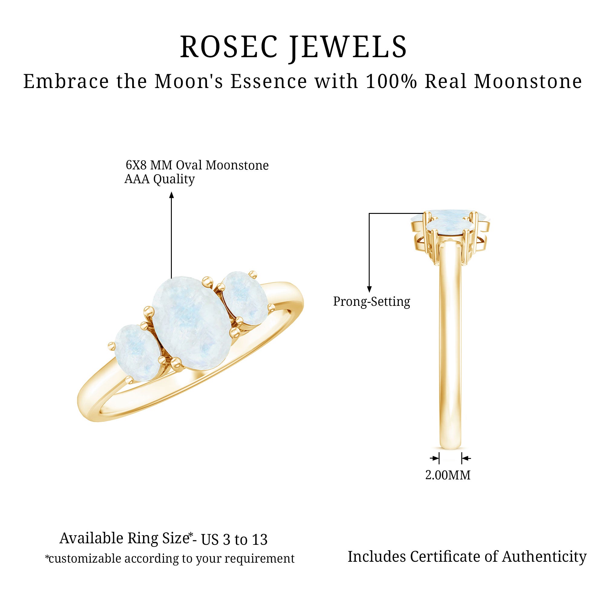 - Natural moonstone center: oval shape with gentle, luminous character.