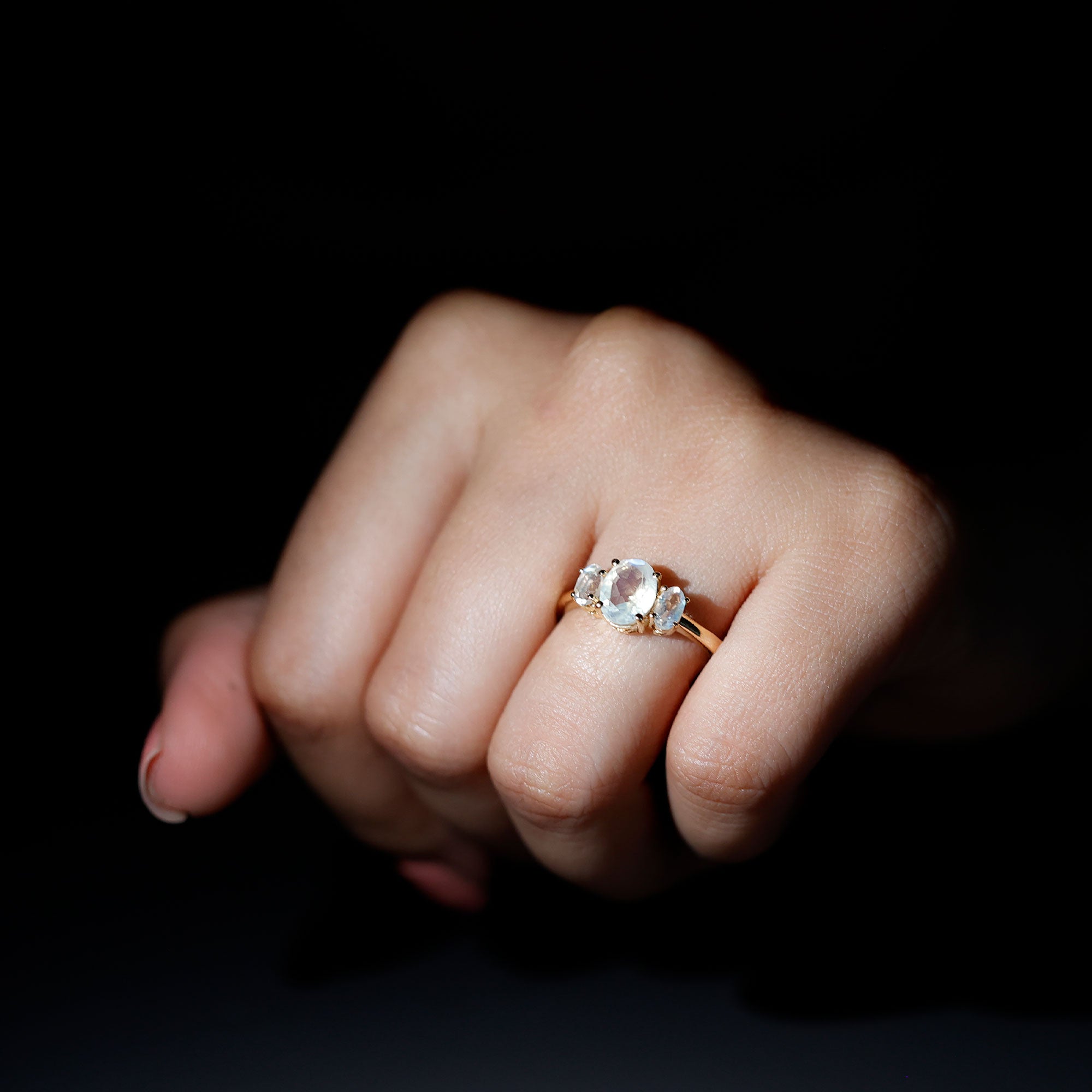 The oval center stone provides an elongated silhouette that flatters the finger and enhances the ring’s presence. The three-stone arrangement adds balance and dimension, guiding the eye across the setting without overpowering the central moonstone. This thoughtful structure blends visual harmony with meaningful design.
