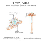 This Ethiopian Opal Engagement Ring is designed to captivate the heart and soul. At its center is a 6 mm Round Shape Ethiopian Opal set in 6 Claw Prong Setting, each turn of the stone is a new moment of magic. Surrounding it, a Double Halo of dazzling Moissanite stones creates an ethereal frame, bringing out the brilliance of Opal and offering an extra layer of sparkle that catches the light from every angle. The Moissanite Side Stones set along the band add subtle elegance, enhancing the mesmerizing play of color of Opal. This Double Halo Engagement Ring is a celebration of love that transcends time, with a design as unique and enduring as the bond you share. Available in various sizes and beautifully presented in a signature jewelry box, this Statement Engagement Ring is the perfect symbol of your eternal commitment. Whether you are proposing or marking a cherished milestone, this stunning Opal Round Engagement Ring promises to capture the heart and light up your forever with its unforgettable beauty.