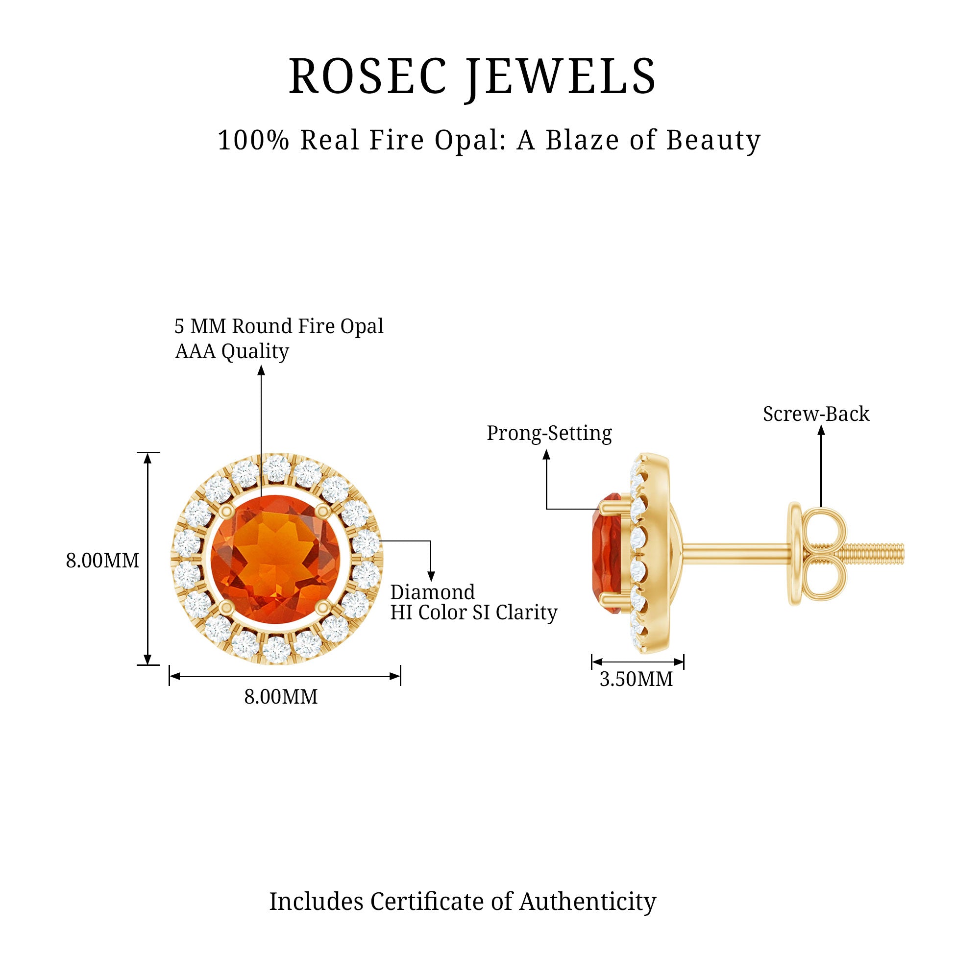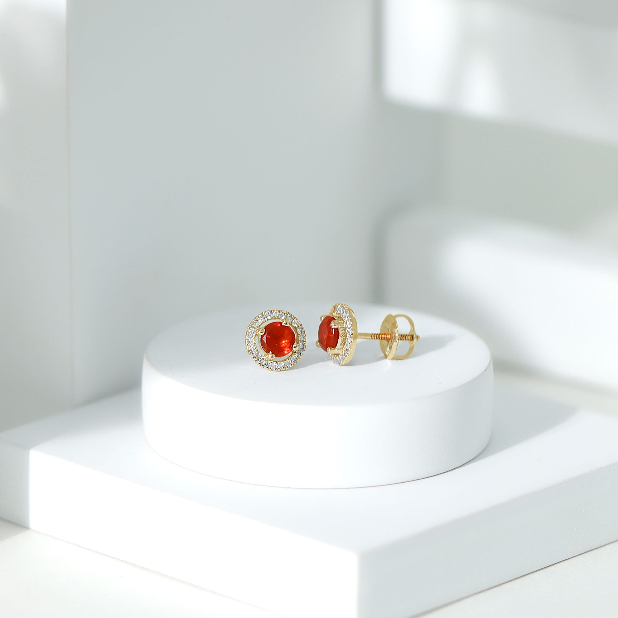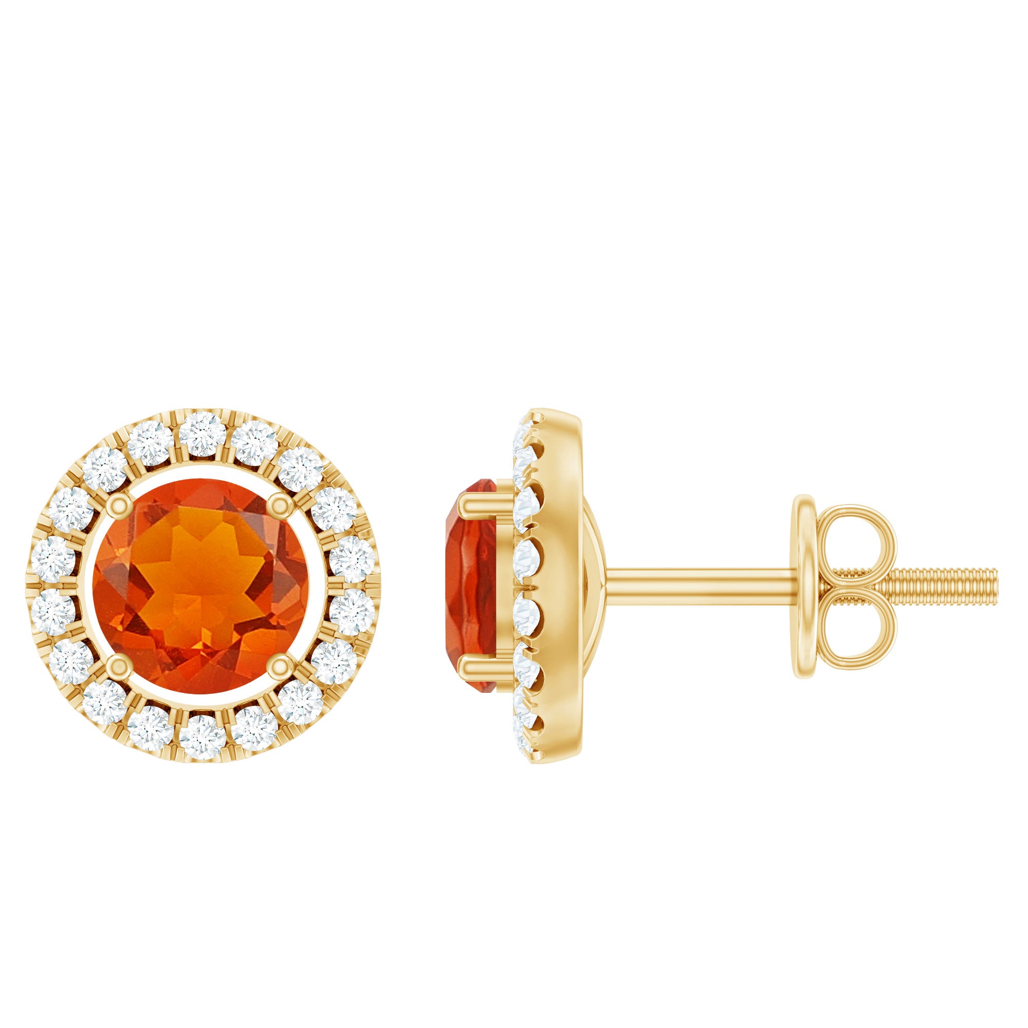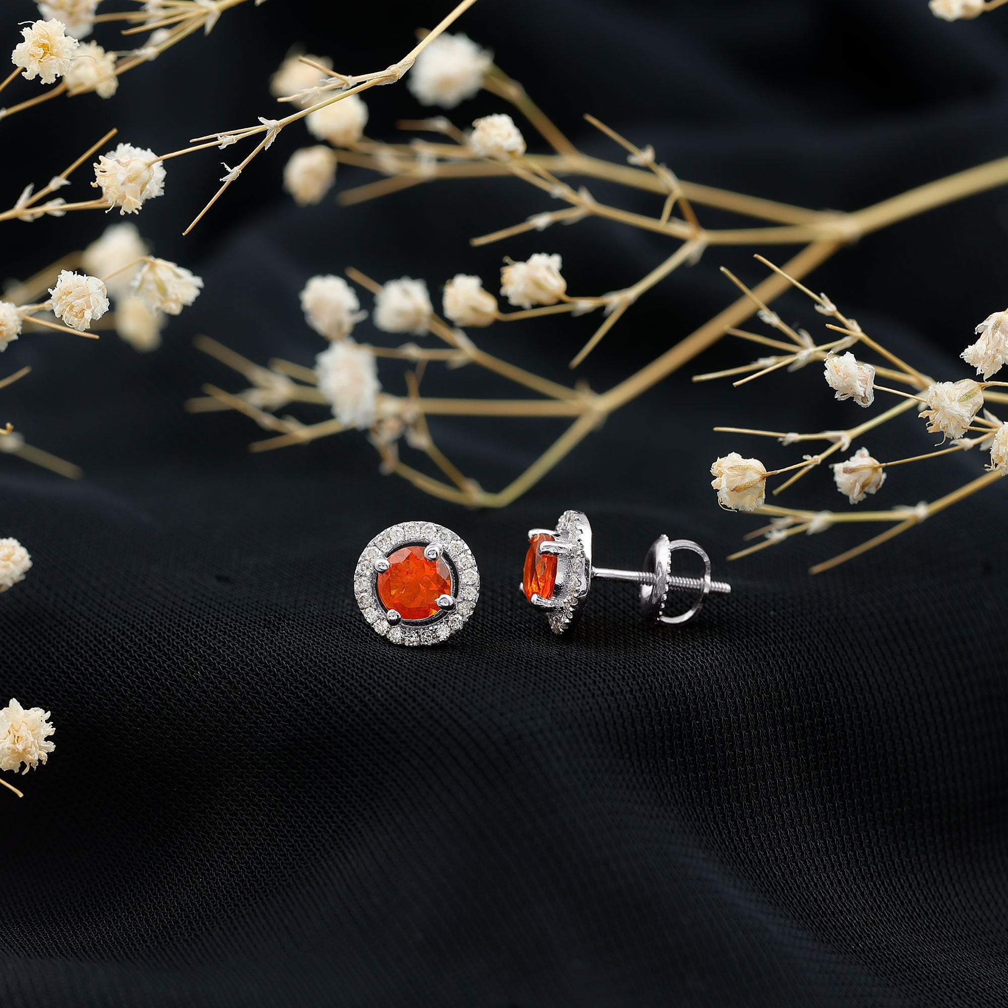 Brighten any moment with the warm glow of these Fire Opal Stud Earrings. Each earring features a 5 MM round cut fire opal set securely in prong setting. A delicate diamond halo surrounds each gemstone, adding a soft sparkle that enhances the opal’s warmth. The contrast between the fiery center stone and the shimmering diamonds creates a balanced, eye-catching look suitable for everyday wear or special occasions. Designed with comfort and security in mind, the Opal and Diamond Earrings include sturdy screw back closures, ensuring they stay in place throughout the day. Their lightweight design makes them easy to wear for long hours, offering both beauty and practicality. Whether chosen as a thoughtful gift or as a way to add something special to your own collection, these Halo Stud Earrings offer timeless charm and bright, cheerful color. Their simple yet striking style makes them versatile enough to pair with many outfits, while the fire opal brings a touch of warmth and personality to every look.