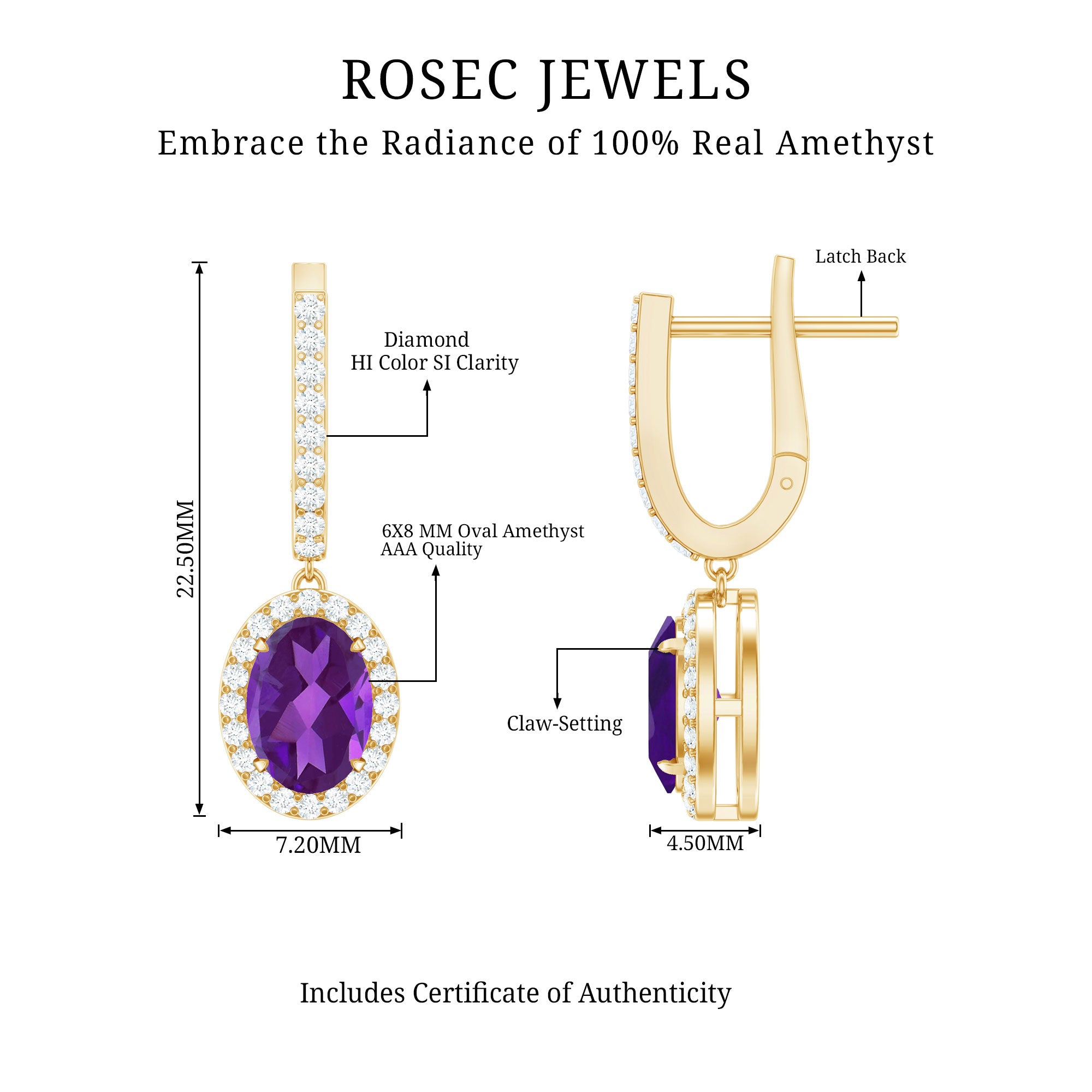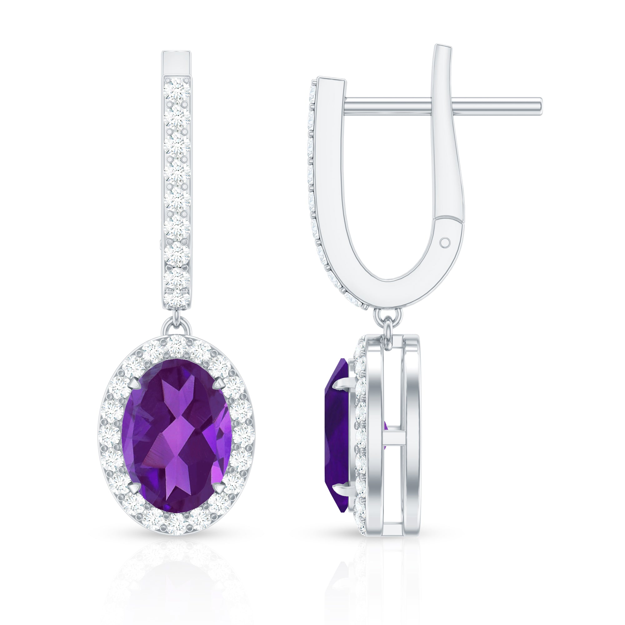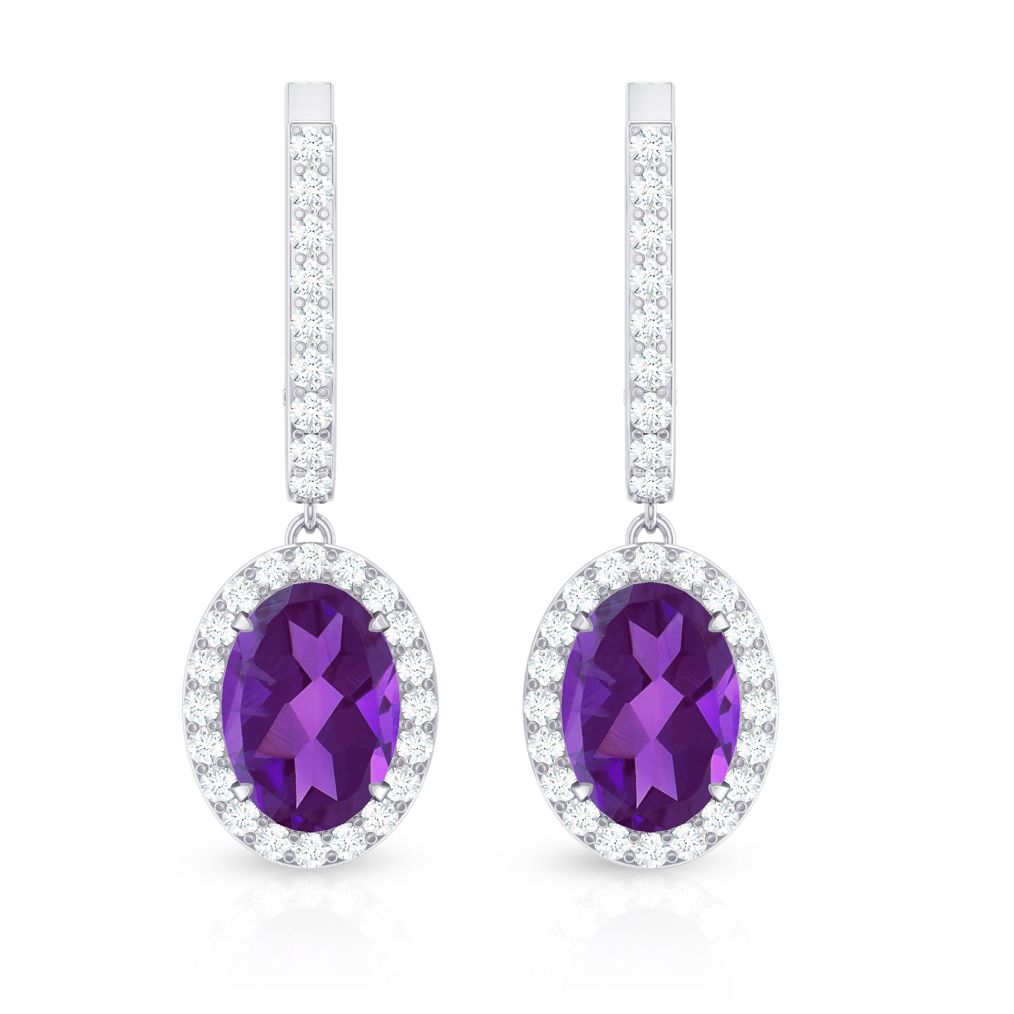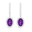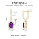 Natural Oval Amethyst Hoop Drop Earrings with Diamond Halo