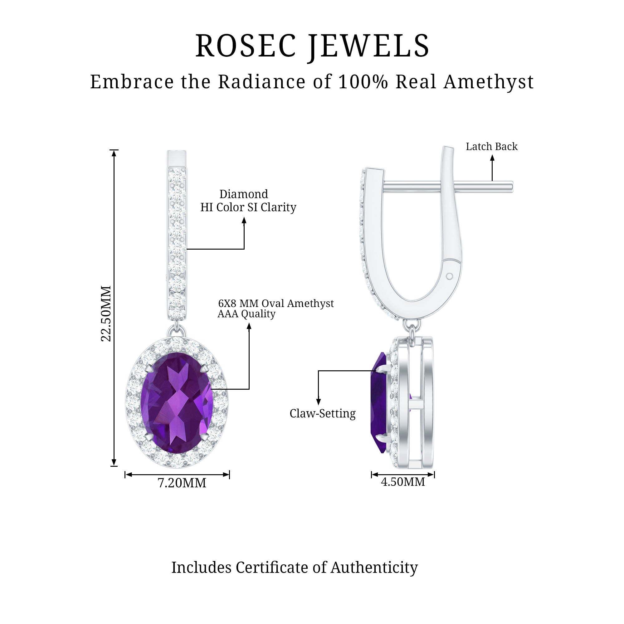 Make a stunning statement on any occasion with these Amethyst Drop Earrings, a perfect fusion of elegance, color and sparkle. Each earring showcases a 6X8 mm Oval Shape Amethyst set in Claw Setting, its regal purple hue symbolizing passion and creativity, gracefully framed by a Halo of sparkling Diamond stones that catch the light with every movement. The Hoop Drop design adds flowing sophistication, allowing the earrings to dance effortlessly with each gesture, while the Latch Back Closure ensures comfort and confidence all day or night. Ideal for both special evenings and elevating wedding look, these Amethyst Diamond Earrings bring a touch of refined glamour to any look. Presented in a signature jewelry box, they make a memorable gift for birthdays, anniversaries or special moments. Romantic yet modern, these Hoop Drop Earrings are a reflection of grace, elegance and enduring beauty.