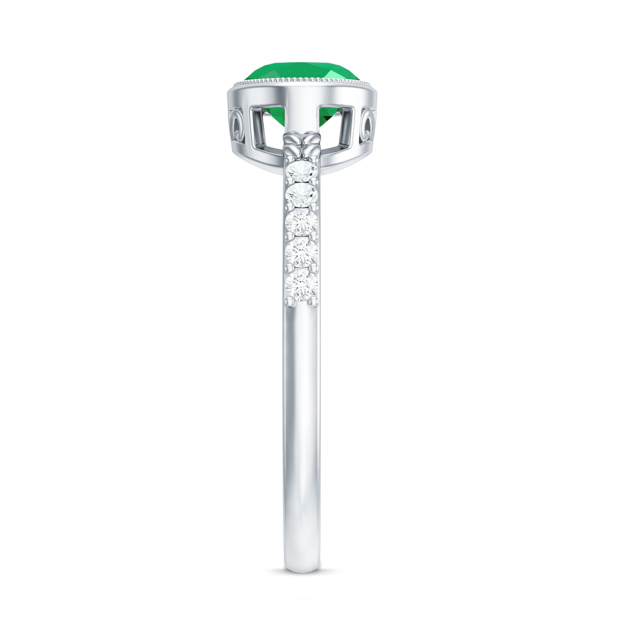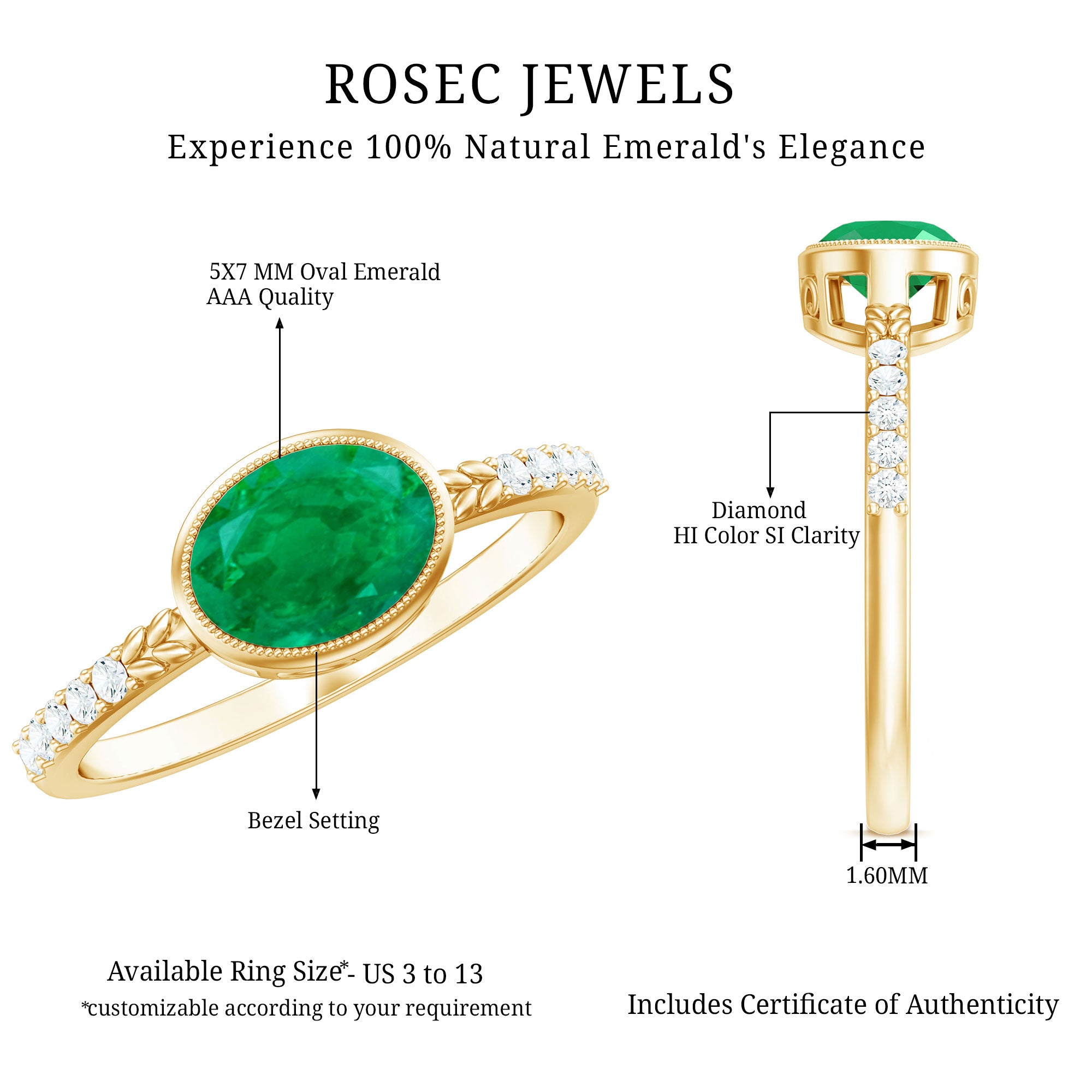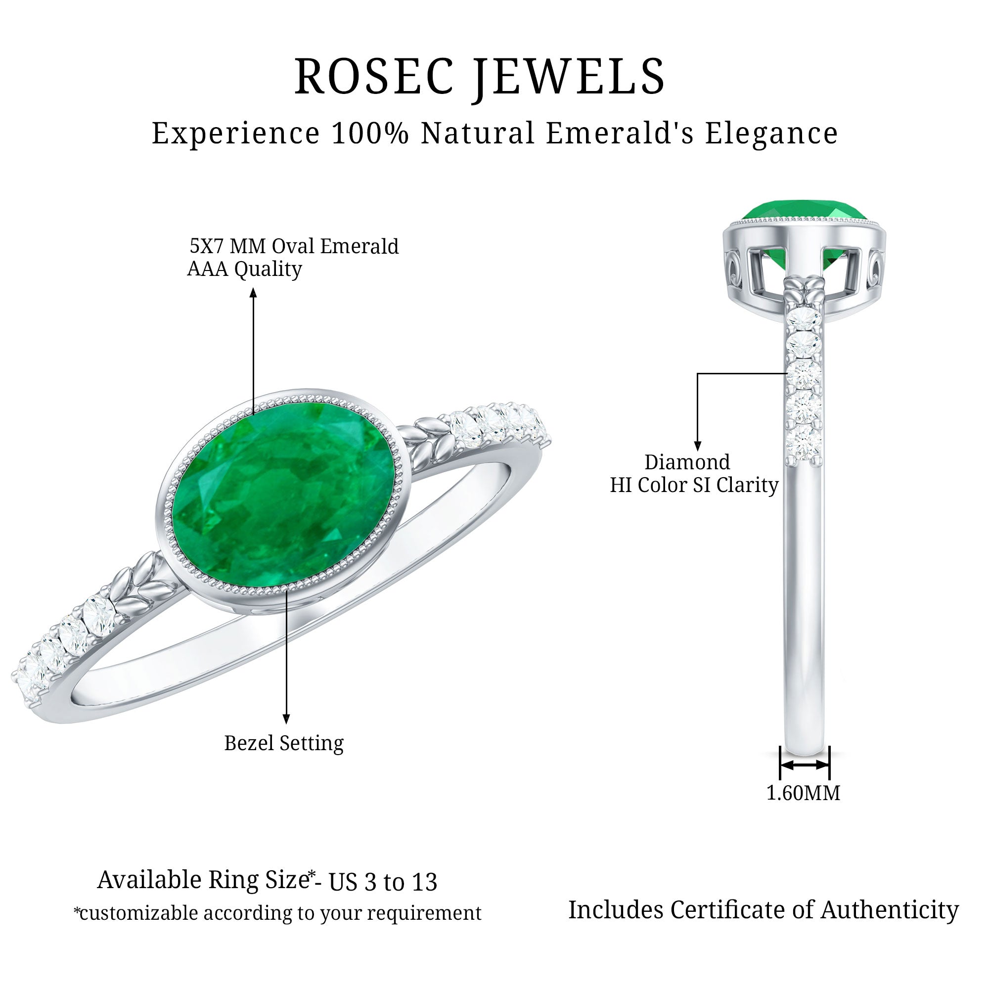 Unveil a love that is as unique as it is timeless with this East West Engagement Ring, a stunning blend of modern elegance and romantic charm. The horizontally set 5X7 mm Oval Shape Emerald in Bezel Setting glimmers with a rich green hue. Surrounding the center stone, intricate Beaded Detailing adds a delicate touch, enhancing the natural brilliance of Emerald while giving the ring a vintage inspired feel. The slim band, adorned with sparkling Diamond stones, creates a graceful shimmer that dances with every movement, symbolizing the light, joy and sparkle that love brings into life. Its East West Style offers a contemporary twist on a classic design, making this Bezel Set Engagement Ring with Emerald a statement of individuality as well as devotion. Perfect for engagements, anniversaries or as a heartfelt gift for someone extraordinary, this Oval Emerald Engagement Ring is a declaration of commitment, passion and shared dreams. Presented in a signature jewelry box and available in a variety of sizes, this Emerald Diamond Engagement Ring is crafted to be cherished, admired and worn as a daily reminder of a love that grows stronger with every heartbeat.