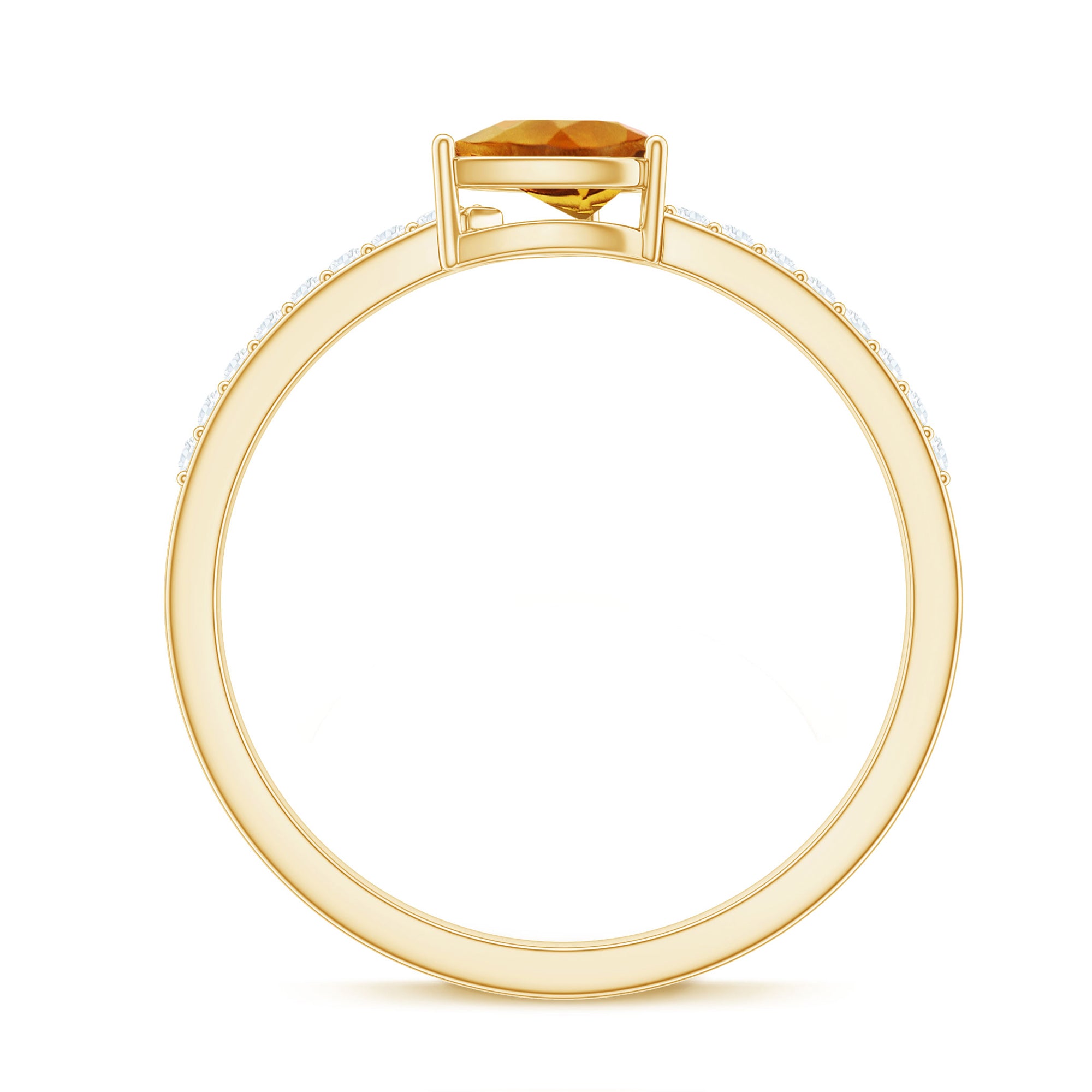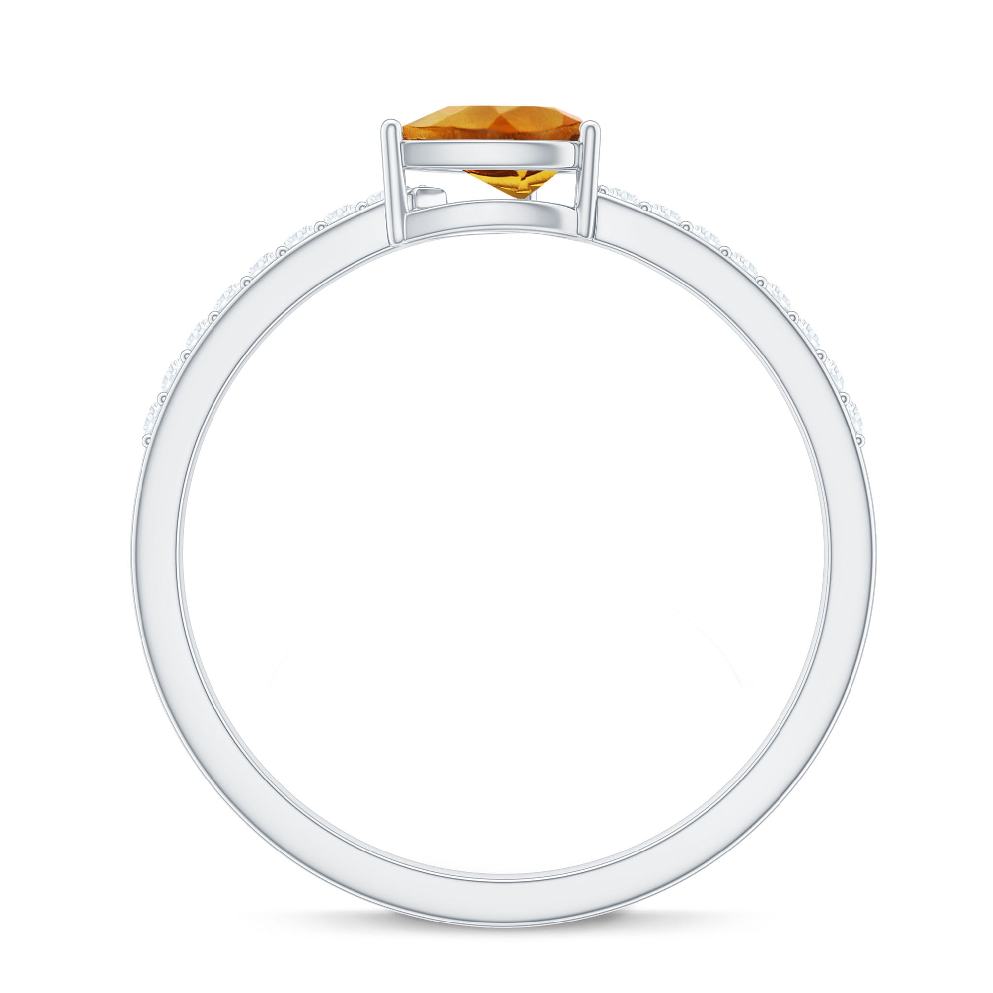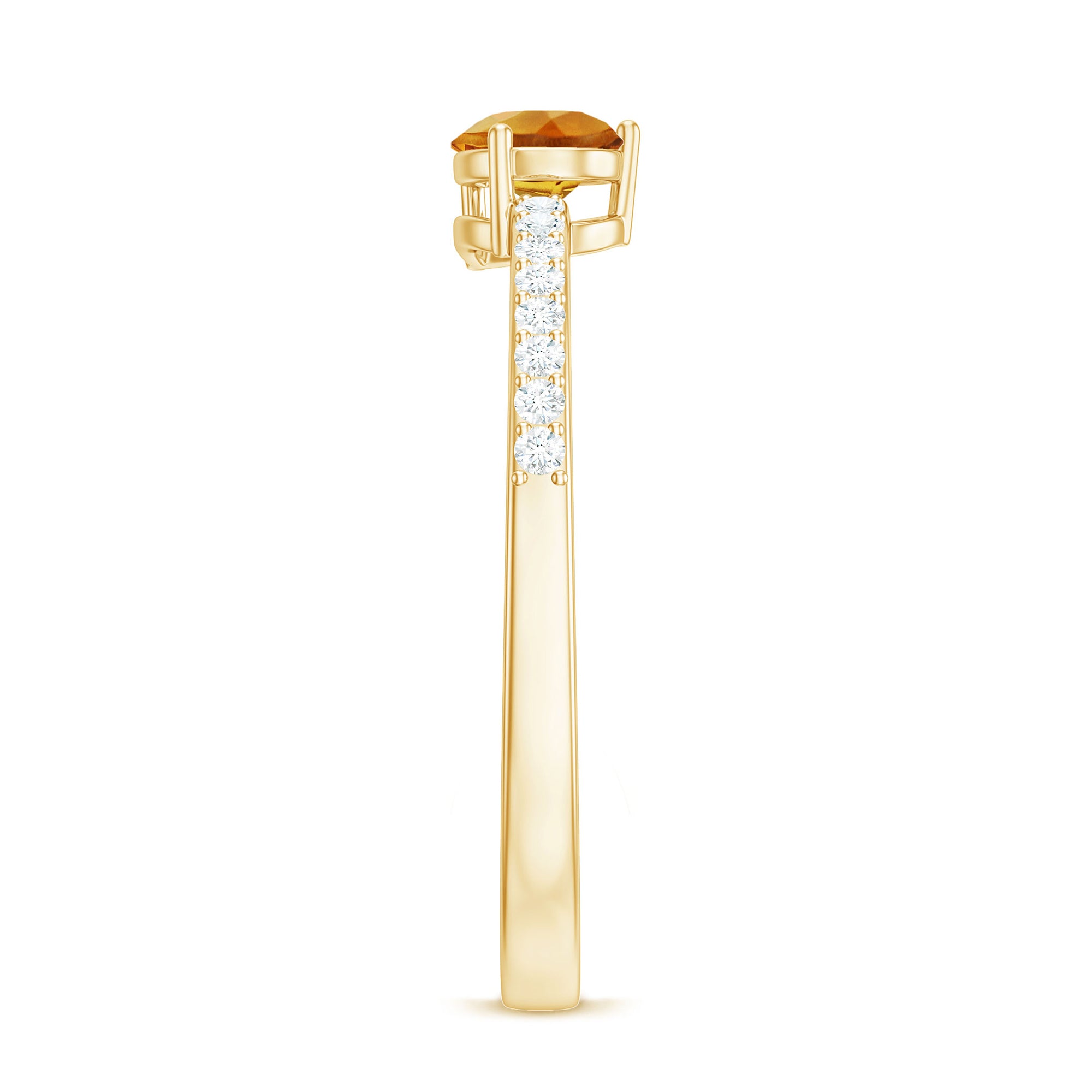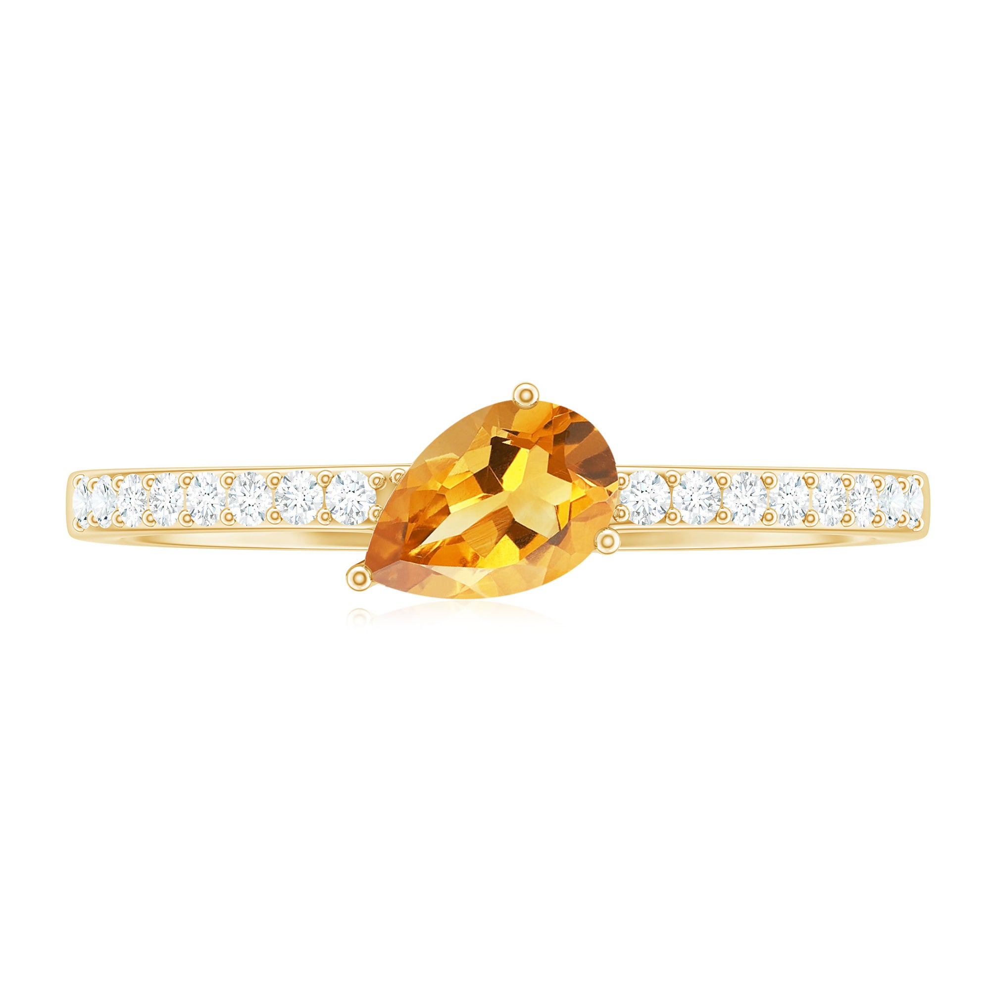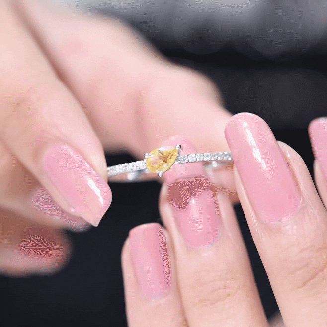 The pear shape combines the round and marquise profiles, offering both softness and structure. Its tapered point draws the eye, creating a flattering, elongated look on the finger. Diamond accents frame or complement the center stone, enhancing light reflection while keeping the citrine as the primary focus.