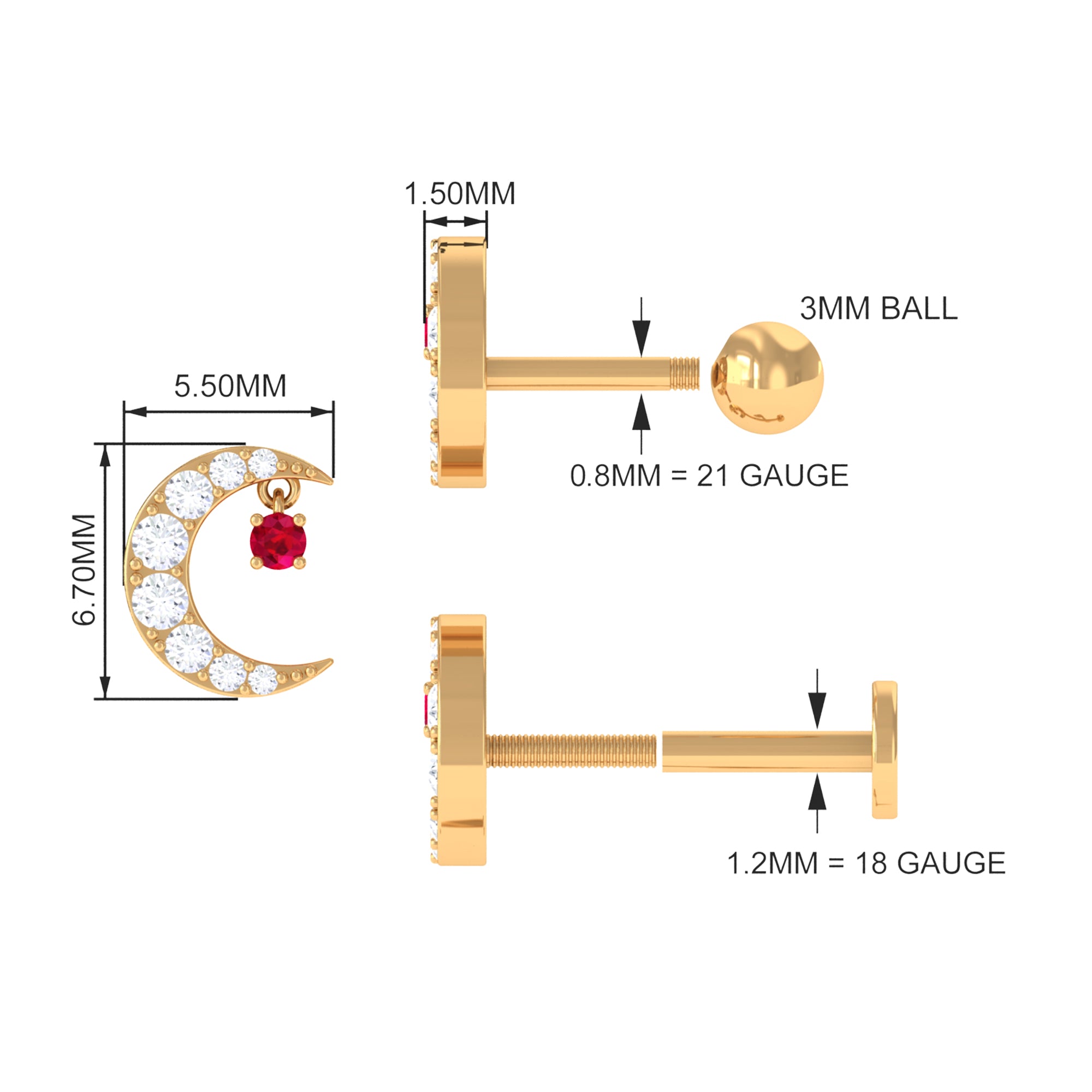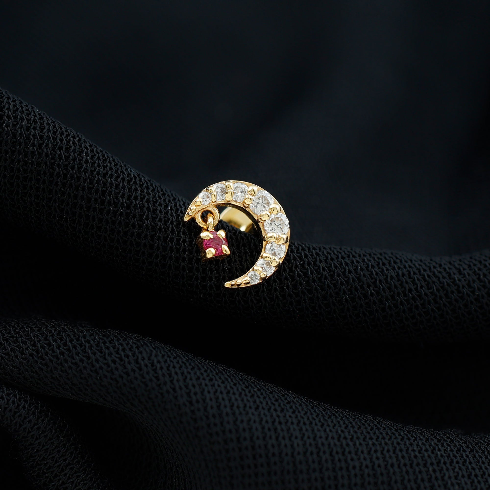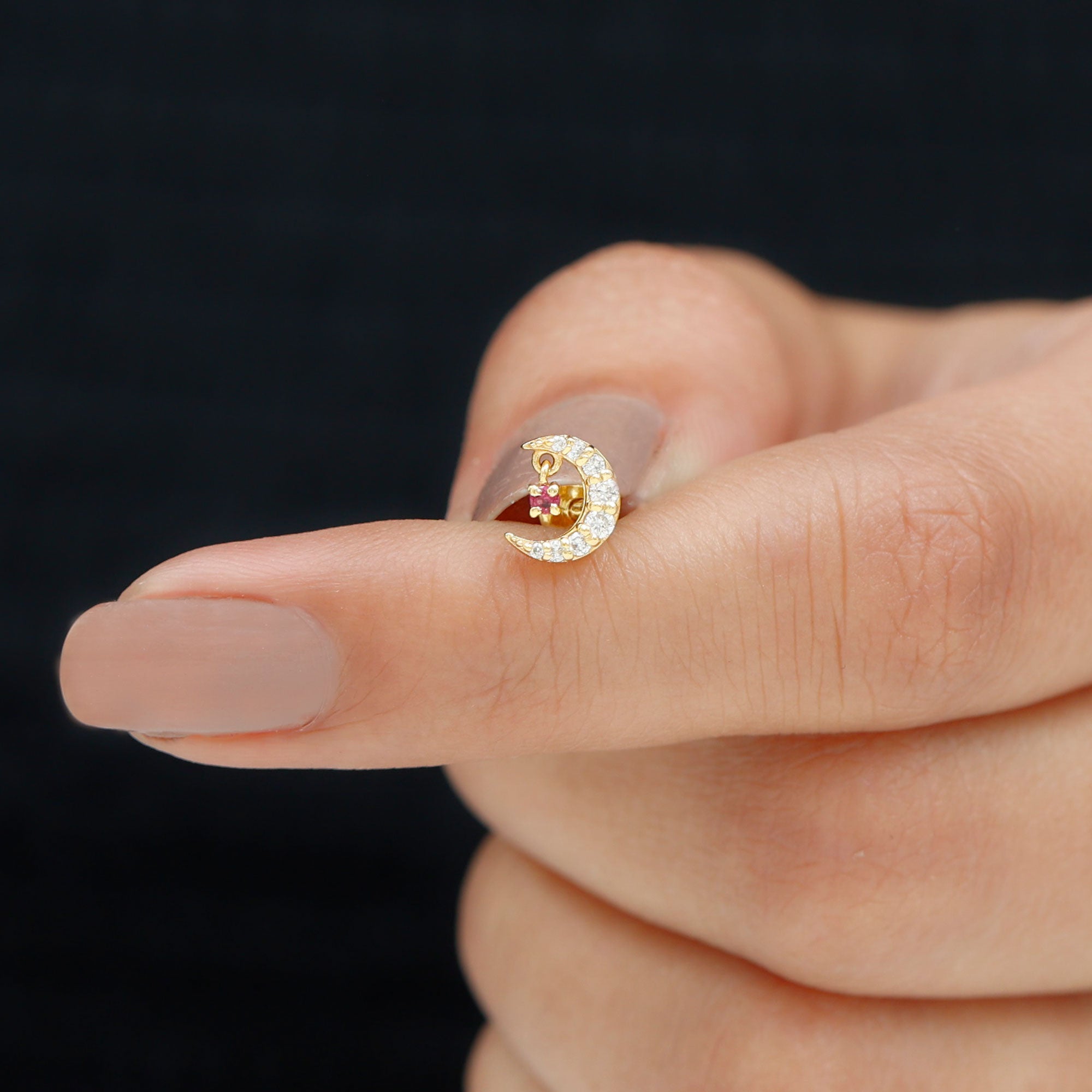Grab this Crescent Moon Helix Earring for your special one as it is embellished with Round Cut Moissanites on the crescent moon design while a Round Cut Ruby hanging as Drop. You can wear this Moon Earring on your Helix, Cartilage, or Upper Lobe Piercing. Style this Ruby Earring with your favorite outfits to create stunning looks.