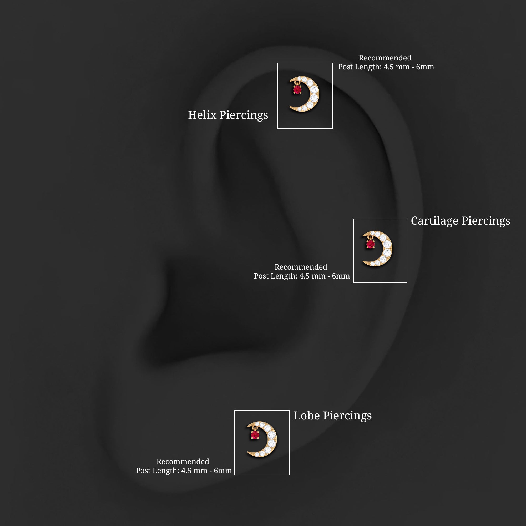 Natural Red Ruby Crescent Moon Helix Earring with Moissanite