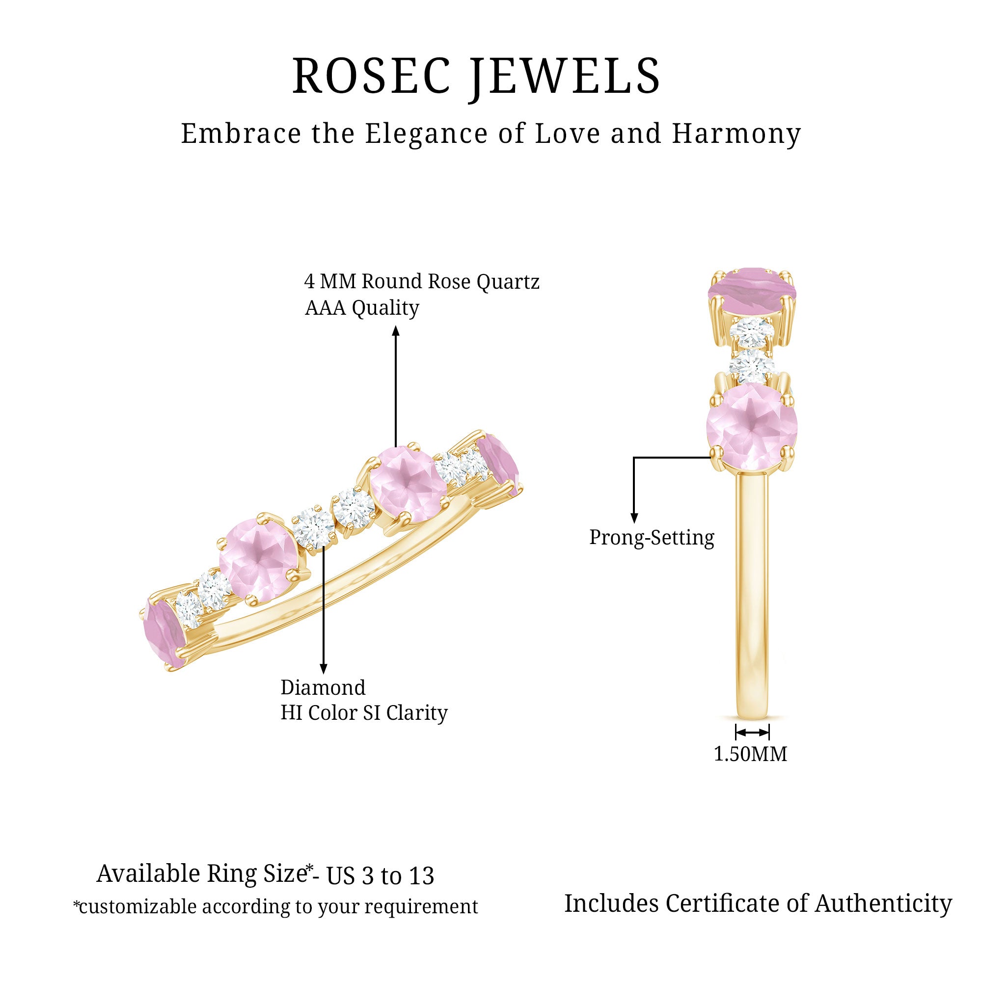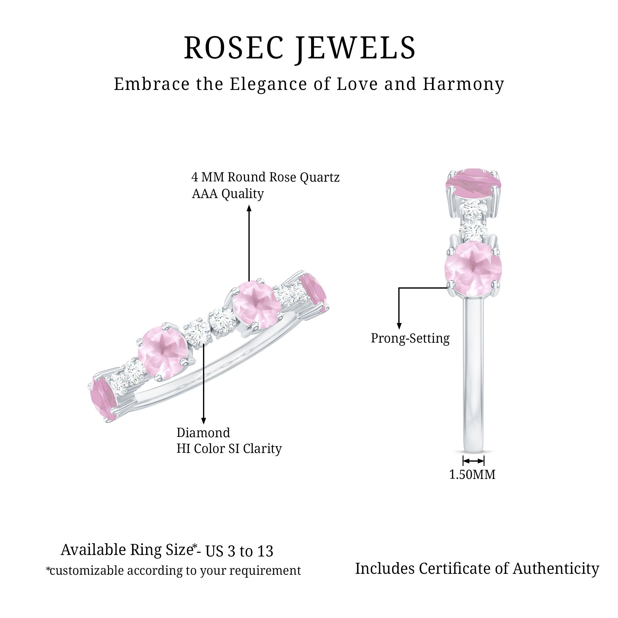 Experience the soft beauty of this Rose Quartz and Diamond Half Eternity Ring. A harmonious blend of elegance and brilliance, radiating love and grace.