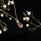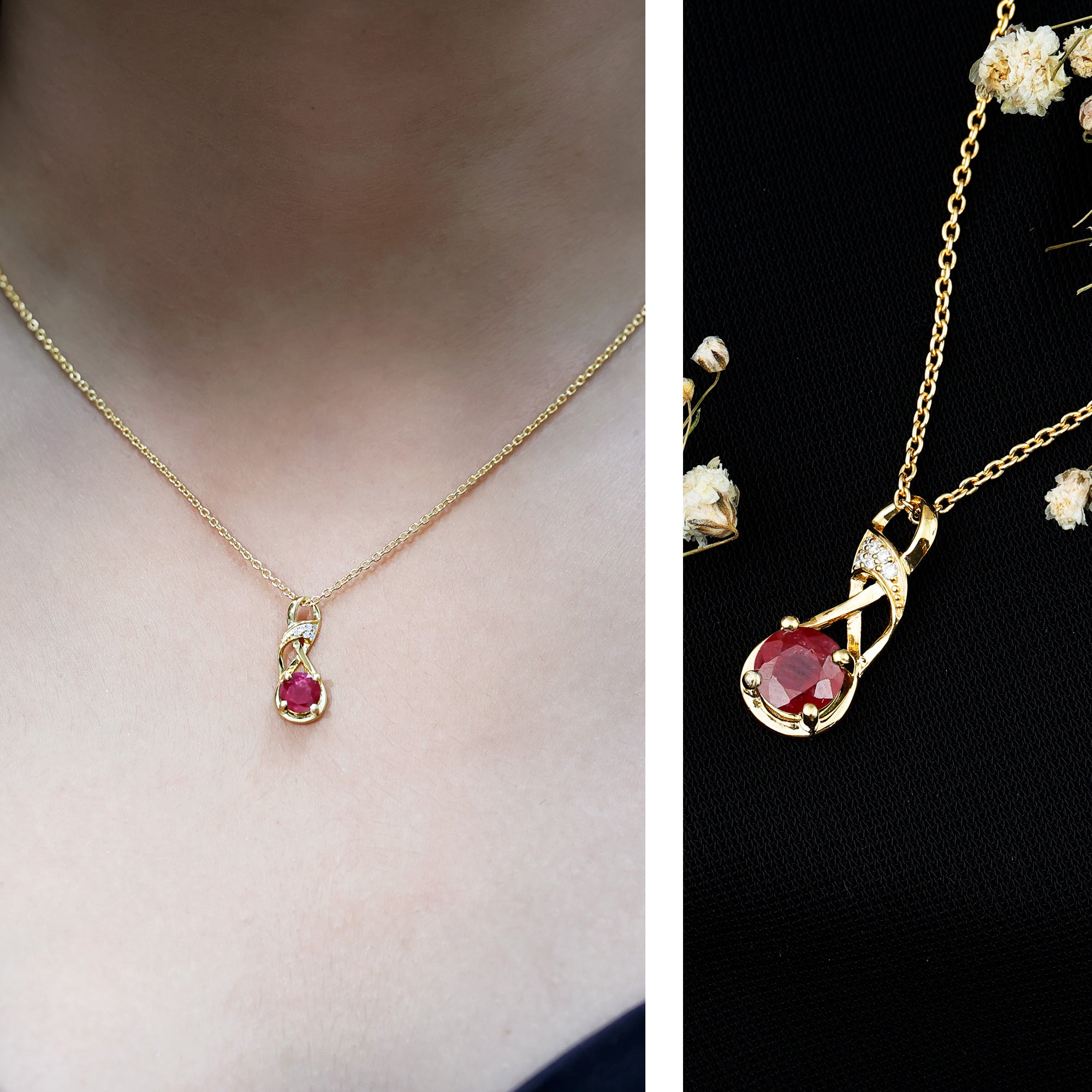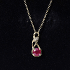 Celebrate the beauty of lasting love with this stunning Ruby Infinity Necklace, a graceful blend of emotion, style, and elegance. Crafted in 14k yellow gold plated silver, this Ruby Pendant features a beautifully flowing infinity design that gently twists to form a loop, symbolizing love without end. At the base of the pendant sits a brilliant 6 MM round cut ruby, securely held in prong setting. The infinity loop gently curves and sparkles with lab grown diamonds, adding a soft brilliance to the design. This Ruby and Diamond Necklace hangs gracefully from a matching chain, making it easy to wear every day or save for moments that matter. Whether you are gifting it to someone you love or treating yourself, the message behind this piece is clear, a symbol of love that is strong, infinite, and full of meaning. This piece showcases a AAA quality ruby and EF color and VS clarity lab grown diamond, offering a striking and sophisticated look to the timeless infinity design. The color of love is combined with a shape that stands for forever, making this Infinity Symbol Necklace a perfect expression of romance and enduring devotion, whether gifted to a partner or kept as a meaningful reminder of self-love.