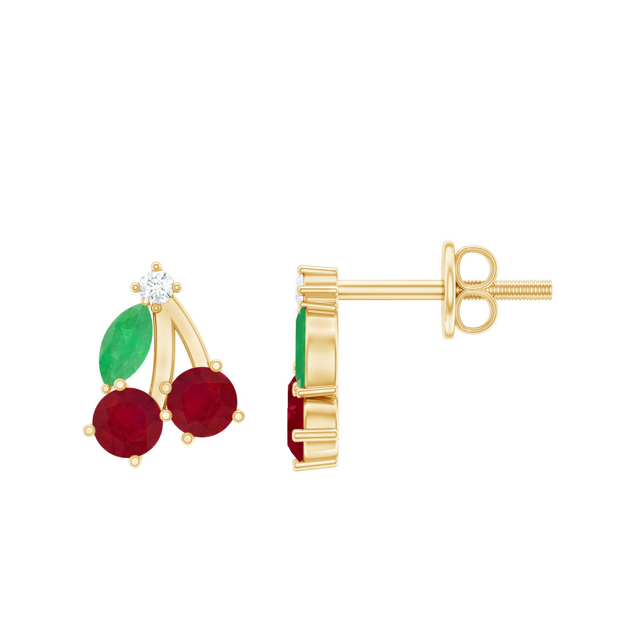 Brighten your style with a pair of playful earrings that bring a fun pop of color to any day. These cute Cherry Studs are designed for anyone who loves jewelry with charm. Each earring features a lively mix of round rubies forming the cherry shape, paired with marquise shaped emeralds that sit gently to create a leaf. A small touch of moissanite and sleek metal bars adds a little sparkle, giving the design a cheerful shine. The prong setting keeps each stone secure while allowing plenty of light to shine through. The result is a playful yet polished look that can be worn with casual outfits, weekend styles, or even something dressy when you want a fun twist. The screw back closure makes these Ruby Stud Earrings safe and comfortable for daily wear. They stay in place, so you can enjoy the cute design without worrying about them slipping out. Whether you are adding a fresh touch to your jewelry collection or searching for a sweet gift for someone special, these Fruit Earrings make a delightful choice. They bring color, charm, and a hint of whimsy to any moment, perfect for someone who loves accessories that feel bright, joyful, and full of character.