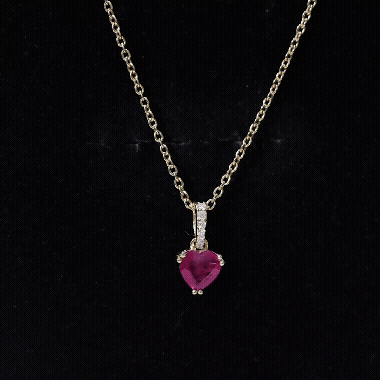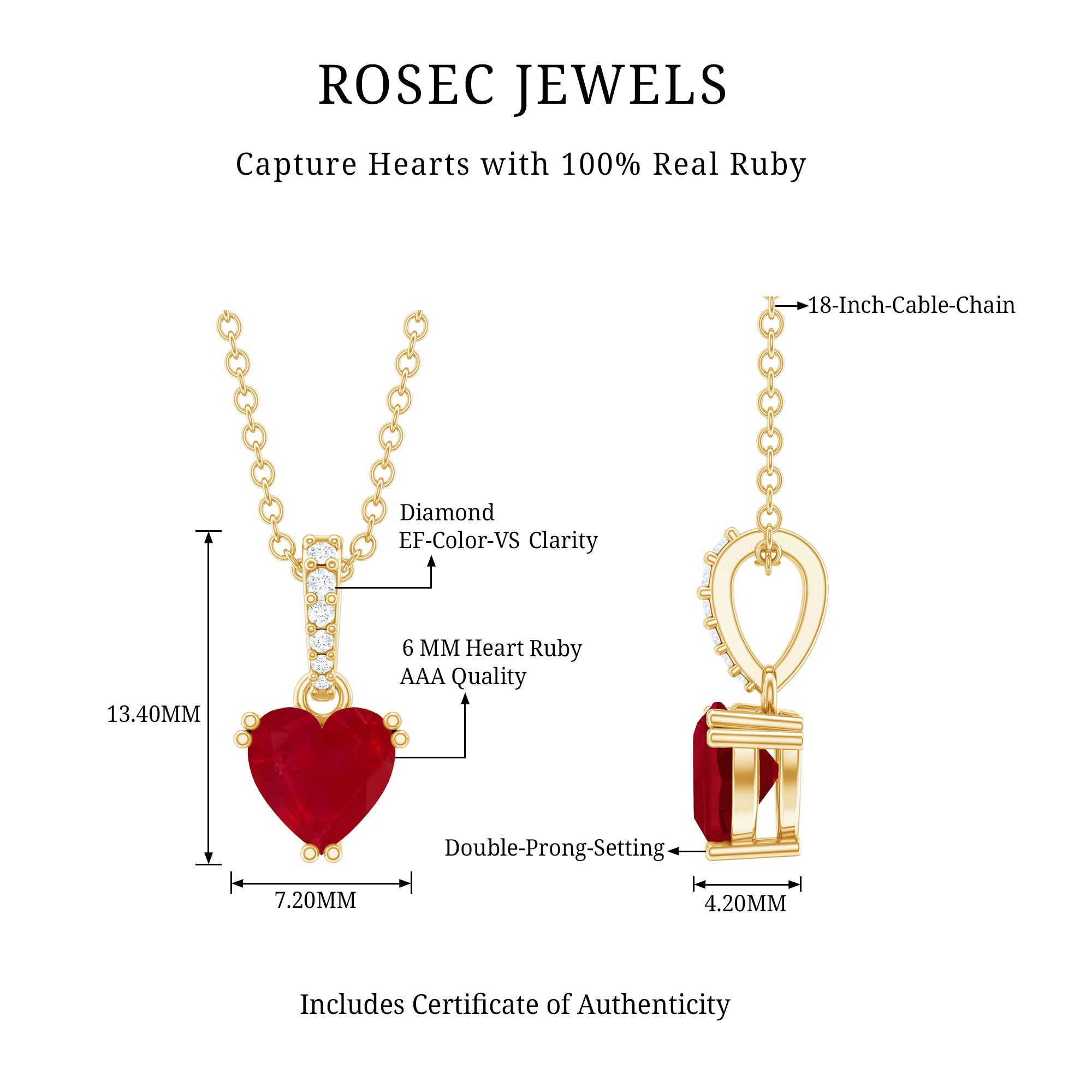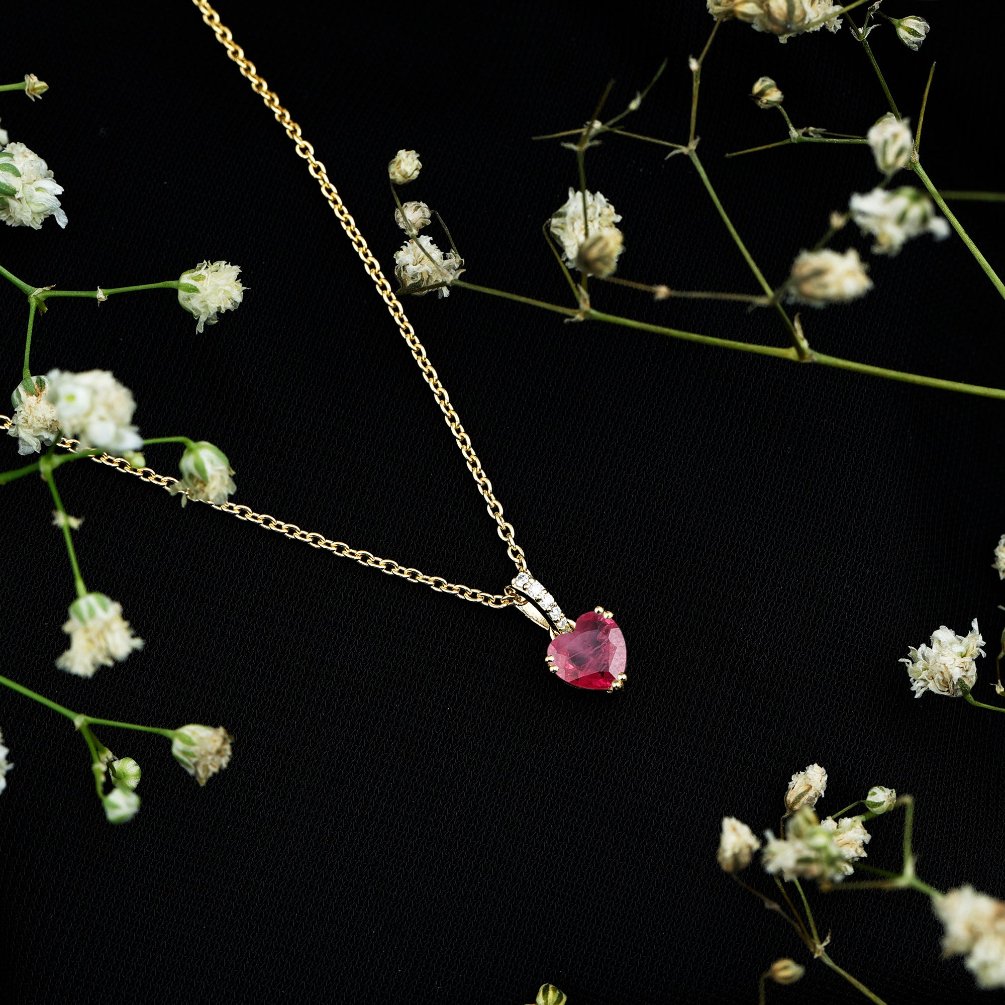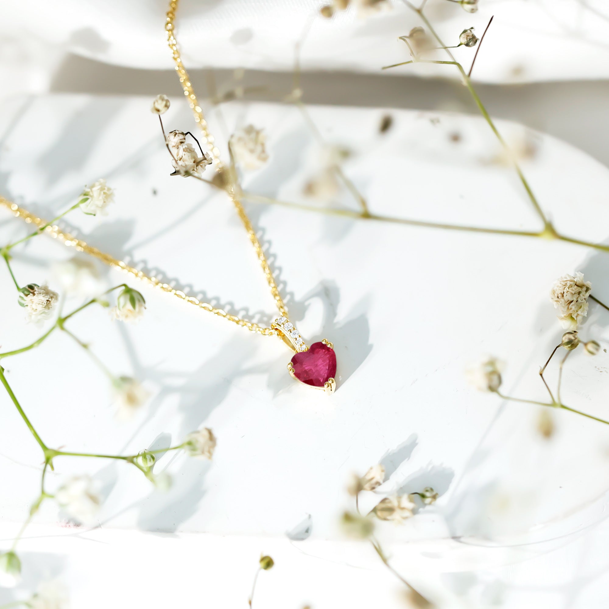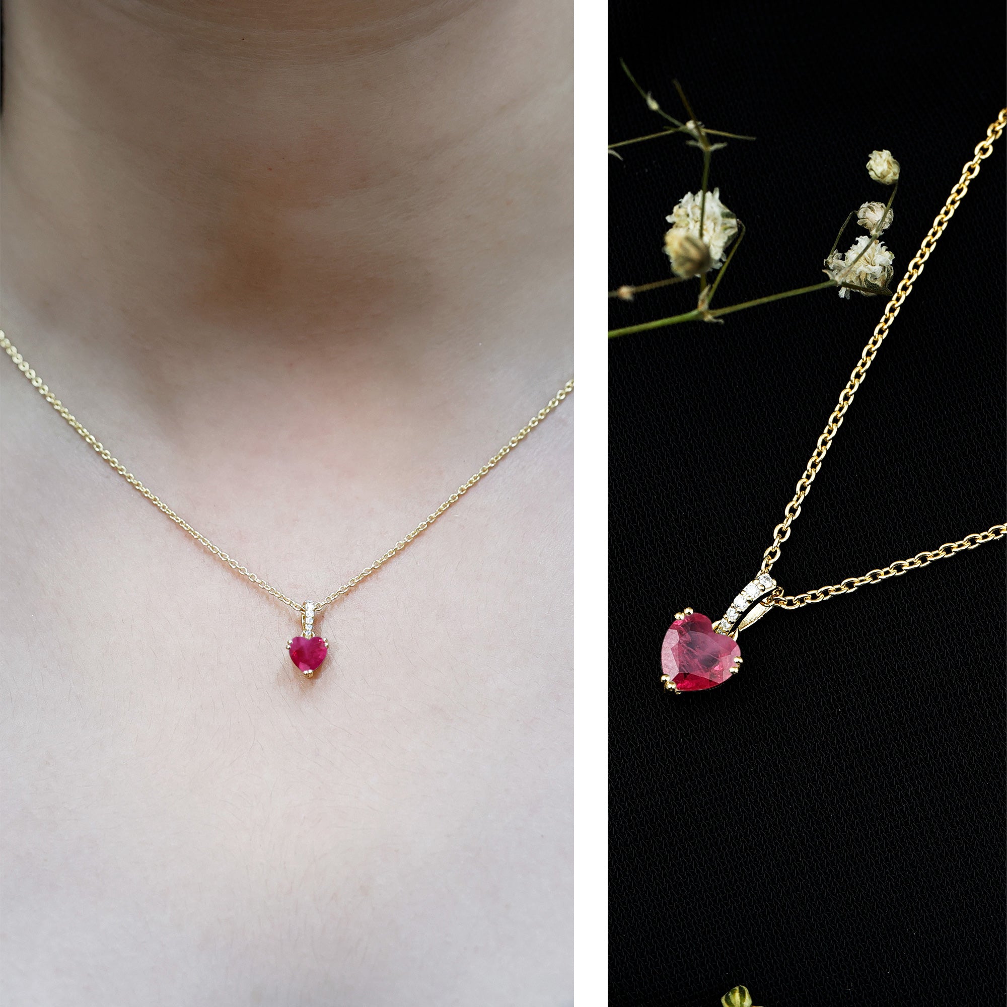 Bold, timeless, and irresistibly romantic, this Ruby and Diamond Heart Necklace is made to turn heads. Crafted in 14k yellow gold plated sterling silver, this elegant piece features a vivid 6MM heart shaped natural ruby, securely nestled in double prong setting. The deep red hue of the ruby radiates passion and strength, symbolizing love and is perfect for celebrating July birthdays or honoring unforgettable moments. Above the ruby, a decorative bail is adorned with sparkling round cut lab grown diamonds, offering a graceful transition from pendant to chain while adding a touch of refined brilliance. Suspended from a durable and polished cable chain, the Heart Locket Necklace sits comfortably at the neckline, ideal for both everyday wear and special occasions. Whether layered with other favorites or worn solo, this Ruby Solitaire Necklace brings sophistication and heartfelt sentiment to any ensemble. The natural ruby featured is of AAA quality, known for its intense color and timeless beauty. Packaged in a signature jewelry box and accompanied by a gemstone certificate, this Ruby Heart Necklace makes a meaningful gift, especially for a July born loved one or a romantic gesture like an anniversary or Valentines Day.