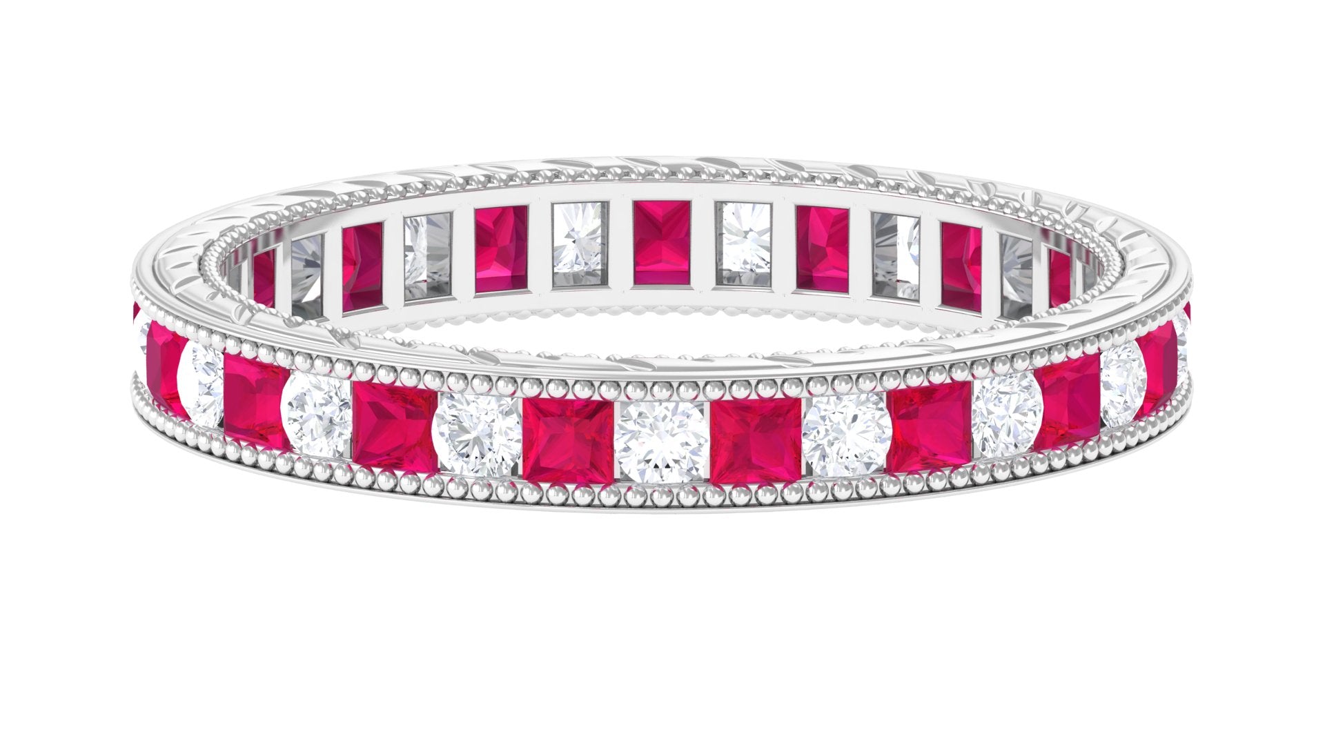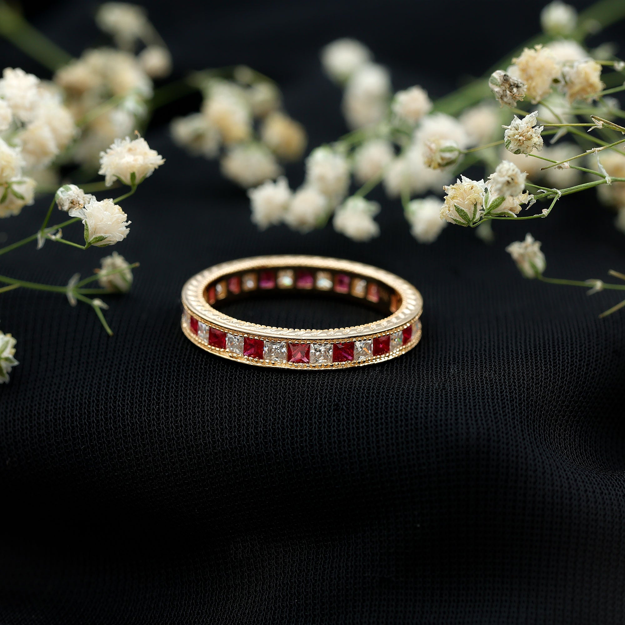 Embrace the allure of this Ruby Eternity Ring where every glance sparks joy and every moment shines with unforgettable brilliance. Crafted with care and precision this Ruby Wedding Ring showcases the Princess Cut Ruby and Moissanite in Channel Setting, and is beautifully complemented by a unique beaded design that adds texture and a modern twist to the classic eternity band. This Real Ruby Ring creates a breathtaking effect that captures attention from every angle. Whether worn as a statement piece or stacked with your favorite rings, this eternity band radiates versatility and sophistication, making it the perfect accessory for any occasion.